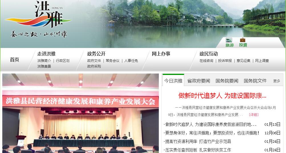 洪雅地处四川盆地西南,位于眉山、乐山、雅安腹心地带,幅员1896平方公里,辖11镇4乡,有138个行政村、21个社区,总人口35万。洪雅是生态大县,森林覆盖率70.5%,负氧离子平均浓度达国家6级标准,是国家生态县、全国生态文明示范工程试点县、中国最佳投资旅游典范县,荣获四川唯一、全国仅19个的“中国生态文明奖”。洪雅是旅游大县,以洪雅为重要组成部分的“大峨眉”旅游区上升为省级发展战略,拥有全国首个“抗衰老健康产业试验区”七里坪、国家森林公园瓦屋山、4A级景区柳江古镇、“全国首批森林康养体验基地”玉屏山、“千塔佛国”槽渔滩等旅游名胜,成功获批成为2016年全省6个旅游强县之一。洪雅是农业大县,茶叶、牛奶、林竹三大特色农产品领跑全省第一方阵。成功获批全市首个国家级有机产品认证示范创建区,认证无公害、绿色、有机农产品46个,是国家农业循环经济发展示范县、全省现代农业建设重点县。在省委、市委的坚强领导下,我们紧紧围绕省第十一次党代会和市四届二次党代会安排部署,坚定推进生态优先绿色发展,以吃得放心、玩得开心、住得舒心、购得称心“四心工程”为主抓手,强力推进天府花园·国际休闲度假体验旅游目的地、健康养生产业示范区、绿色有机农产品示范区、生态工业示范区“一地三区”建设,大力发展康养旅游产业,打造川内生态康养旅游重要支撑极,让“要想身体好,常往洪雅跑”实至名归。2016年,全县GDP实现108.5亿元,增长8.4%;固定资产投资115.9亿元,增长13%;地方一般公共预算收入9亿元,增长11.5%;城乡居民人均可支配收入分别达27777元、14501元,增长8.2%,8.9%;接待游客818.6万人,旅游总收入超过64.5亿元。
