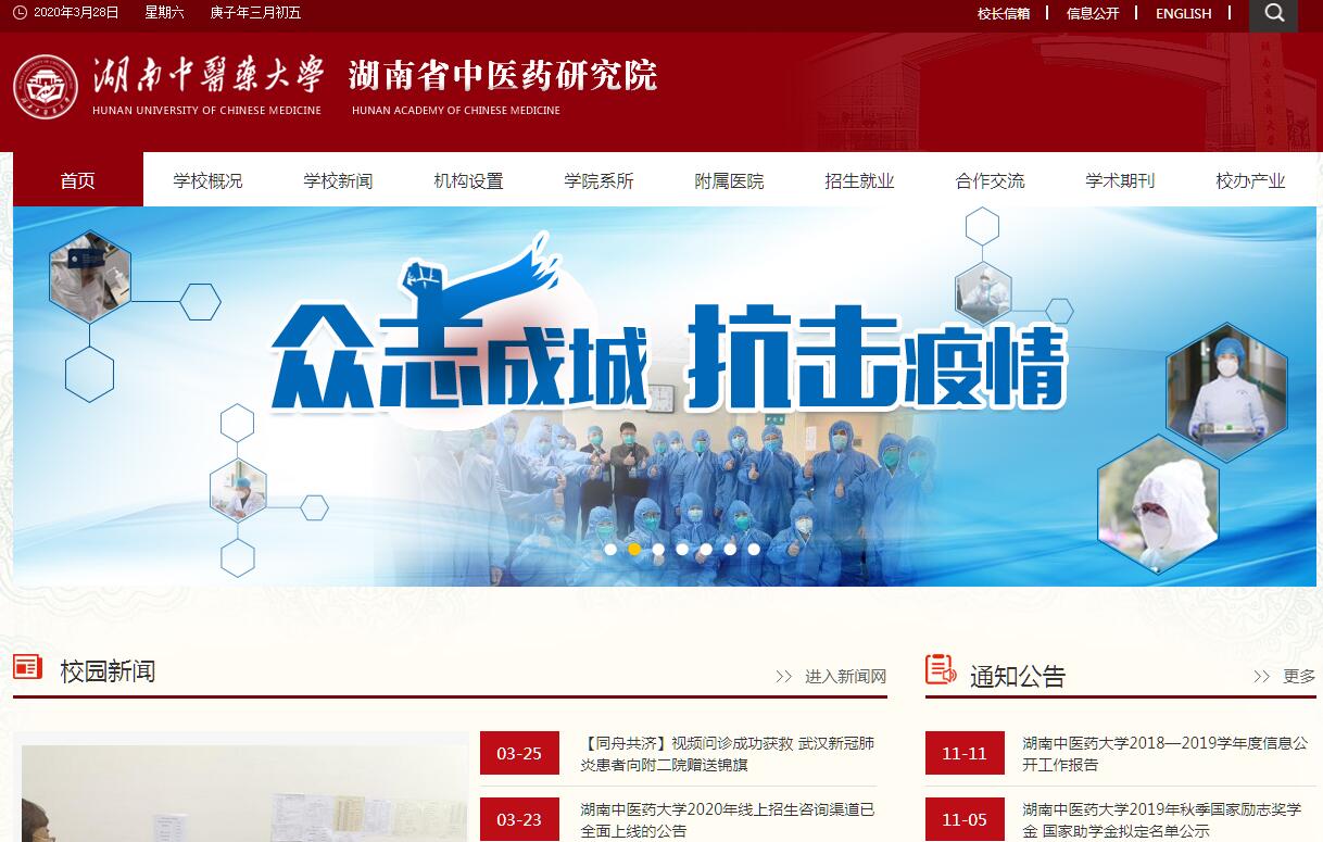 湖南中医药大学坐落于中国历史文化名城长沙,是湖南省重点建设本科院校,是全国首批设立国家级重点学科的高校,也是首批招收博士研究生、留学生及港澳台学生的中医药院校。学校现有2个校区,占地面积1393亩,建筑面积52万平方米,主校区依岳麓南坡,临湘江西岸,环境幽雅,风光秀丽,是求学成才的理想之地。学校办学历史悠久,前身为1934年的湖南国医专科学校,1953年创办湖南中医进修学校,1960年创建普通高等本科院校——湖南中医学院,1979年成为全国首批取得中医类研究生学历教育资格的院校,1990年原湖南科技大学成建制并入湖南中医学院,2002年与湖南省中医药研究院合并,2006年经教育部批准更名为湖南中医药大学,2012年进入湖南省一本招生序列。目前,学校与湖南省中医药研究院实行校院合一的管理体制。现任党委书记秦裕辉、校长谭元生。学校学科门类齐全、中医药特色鲜明。学校设有18个学院、24个本科专业,涵盖医、理、工、管、文等5大学科门类。现有博士后科研流动站2个,一级学科博士学位授权点3个,二级学科博士学位授权点23个,博士专业学位授权点1个;一级学科硕士学位授权点7个,二级学科硕士学位授权点42个,硕士专业学位授权点7个。建有国家重点学科1个,国家中医药管理局重点学科23个,湖南省重点学科10个,其中湖南省优势特色重点学科2个,构建了以中医药学科为主体的三级重点学科体系。中医诊断学在本学科研究领域居国内领先水平。学校坚持人才强校战略,名医名师荟萃。现有专任教师1360人,具有副高以上职称教师667人,有博士生导师108人、硕士生导师422人,享受国务院政府特殊津贴专家67人。入选国医大师3人,国家有突出贡献的中青年专家4人,“百千万人才工程”国家级人选1人、省“百人计划”专家7人,“芙蓉学者”2人,湖南省“121人才工程”第一层次人选4人,省学科带头人17人,医学学科带头人22人,国家级名中医2人,省级名医69人;有第三批国家“万人计划”教学名师1人,国家级优秀教师2人,全国中医药高等学校教学名师2人,全国优秀科技工作者2人,省级教学名师2个,省级优秀教师4人。学校坚持质量办学,不断创新人才培养模式。现有全日制本科生18757人、研究生1839人。建有国家级实践教学示范中心1个,省级实践教学示范中心5个,省级虚拟仿真实验教学中心1个;国家级大学生校外实践教育基地1个,省级大学生创新训练中心2个,省级校企合作创新创业教育基地1个;省级校企合作人才培养示范基地5个。近年来,先后获得国家级精品资源共享课1门、国家级精品课程1门、省级精品课程9门、省级名师空间课堂6门、省级微课课程4门;国家级教学团队1个、省级教学团队4个;国家级特色专业4个、省级特色专业7个;国家级专业综合改革试点项目1个、省级专业综合改革试点项目5个。近三年,学生先后获得国家级奖励50余项,省级奖励100余项,其中包括全国大学生针灸推拿临床操作技能大赛团体一等奖、全国护理学临床技能大赛一等奖、中国大学生服务外包创新创业大赛全国总决赛一等奖、全国中医院校“远志杯”作品竞赛一等奖等。2015~2017届本科毕业生平均年终就业率达95.61%,位居全省高校前列。建校以来,学校培养了7万余名以发展中医药事业为主体的精英人才,校友遍布海内外。学校坚持聚焦国家和区域的重大战略,深入推进科技创新和中医药产业化,积极服务经济社会发展。学校建有科研平台56个,其中国家级3个、部级21个、省级19个、厅级13个。近年来,学校获国家级及省部级科技成果奖112项,其中国家科技进步二等奖3项,湖南省科技进步奖一等奖2项,中华中医药学会科学技术一等奖2项;授权专利116项,获湖南省发明奖二等奖1项;立项各级各类科研课题1100余项,其中“973计划”计划项目14项、“863计划”项目4项、国家科技重大专项4项、国家科技支撑计划项目10项、国家自然科学基金项目119项。学校拥有5个校办合资企业,牵头成立了湖南中医药产业创新联盟,先后与湘西、怀化等10个地市签订近100项产学研战略合作协议,合作金额近2000万元。古汉集团、九芝堂、正清制药、汉森制药四大上市公司的拳头产品,如古汉养生精口服液、妇科千金片、乙肝宁冲剂、肝复乐、驴胶补血冲剂、汉森四磨汤、天麻首乌片等都由我校研制和参与研发,畅销国内外,累计产值超过200亿元。学校现有直属附属医院3所,非直属附属医院13所。3所直属附属医院医疗设施先进,临床科室设置齐全,拥有刘祖贻、熊继柏、王行宽、潘敏求、张涤等一批知名的中医临床专家,建设有1个国家中医临床研究基地1个、12个国家临床重点专科、25个国家中医药管理局重点专科、14个国家中医药管理局重点学科。学校坚持开放办学,对外交流活跃。现有境外学生674人。学校与马来西亚林肯大学合作开展了我省首个境外合作办学项目,与韩国圆光大学共建孔子学院,与巴基斯坦卡拉奇大学联合成立了“中-巴民族医药研究中心”,与卢森堡合作建立了“中-卢中医药合作研究中心”;与美国、加拿大、新加坡、日本等20多个国家和地区建立了长期交流合作关系,国际合作领域不断拓展,国际影响力日益提升。 面向未来,湖南中医药大学将始终秉承“文明、求实、继承、创新”的校训精神,坚持“质量办学、特色办学、开放办学”的理念,遵循现代高等教育发展规律和人才培养规律,充
