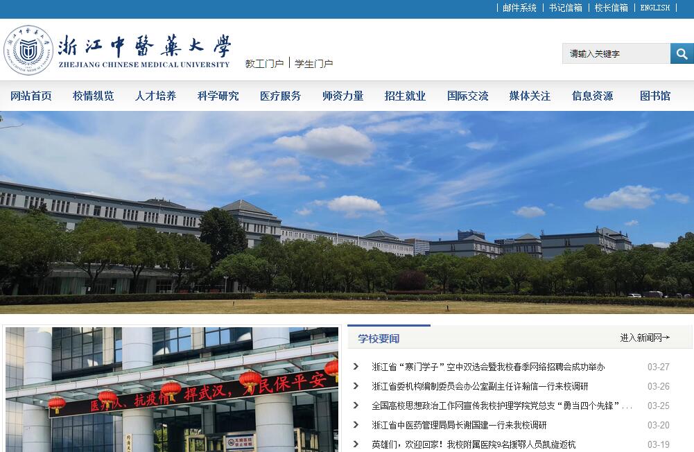 浙江中医药大学是以中医中药为优势特色学科的教学研究型大学,是浙江省重点建设高校,是浙江省人民政府、国家中医药管理局、教育部共建高校。学校始创于1953年6月,时名为浙江省中医进修学校;1959年6月成立浙江中医学院,校址位于杭州市庆春街原浙江大学旧址;1998年获得博士学位授予权;2000年3月整体迁至杭州市滨江高教园区办学;2006年2月更名为浙江中医药大学;2015年9月富春校区(滨江学院迁建工程)投入使用,开启两校区办学模式。学校占地千亩,总建筑面积逾47万平方米。学校下设第一临床医学院、第二临床医学院、第三临床医学院/康复医学院、第四临床医学院、基础医学院/公共卫生学院、口腔医学院、药学院、护理学院、医学技术学院、生命科学学院、人文与管理学院以及马克思主义学院、成人教育学院/继续教育学院、国际教育学院,举办1所独立学院(滨江学院)。拥有附属第一医院(浙江省中医院)、附属第二医院(浙江省新华医院)、附属第三医院(浙江省中山医院)3所直属附属医院和21所非直属附属医院。学校是全国首批招收和培养中医药研究生、在浙江省属高校中首批获得博士学位授予权和博士后科研流动站的院校。现有中医学、中药学、中西医结合3个一级学科博士学位授权点,中医学、中药学、中西医结合、临床医学、护理学、药学、医学技术、基础医学8个一级学科硕士学位授权点,以及中医博士专业学位授予权和口腔医学等6个硕士专业学位授予权;建有中医学、中药学、中西医结合3个博士后科研流动站;开设本科专业31个,涉及医学、理学、工学、管理学、文学五大学科门类。现有全日制在校生15200余人(含独立学院),其中本科生12800余人、硕士生1848人、博士生193人、学历留学生360人。学校是国家创新人才培养示范基地,自主培养了中国工程院院士、973计划项目首席科学家、国医大师、全国名中医、国家“新世纪百千万人才工程”人选等一批高层次人才。现有在职教职工(校本部)1120余人,正高级专业技术人员320余人(含直属附属医院)。拥有浙江省特级专家、国务院特殊津贴专家、国家优秀青年科学基金获得者、中医药高等学校教学名师、浙江省国医名师、浙江省“千人计划”专家、浙江省“钱江学者”特聘教授等一大批专家学者。学校坚持把立德树人作为立身之本,着力提升教育教学质量。拥有国家级特色专业5个,浙江省“十三五”优势专业、特色专业14个,国家精品课程9门,国家级教学团队1支。建有国家级实验教学示范中心等一批教学平台。获国家级教学成果奖3项。两次获教育部本科教学工作水平评估优秀。中医学、临床医学、中药学3个专业通过教育部专业认证。2017年通过教育部本科教学工作审核评估。学生生源质量和培养质量不断提高,2016届(毕业后一年)本科毕业生职业发展与人才培养质量排名位居全省本科院校第二(据浙江省教育评估院调查数据),近些年毕业生参加医师资格考试通过率居全国同类院校前列。学校全力推进学科建设,不断提升科技创新和服务能力。在浙江省属高校中首批获得国家重点学科(中医临床基础);中医学、中药学入选浙江省第二批重点建设高校优势特色学科;临床医学学科领域进入ESI全球排名前1%;获浙江省“十三五”一流学科建设项目A类3个、B类6个。建有国家中医临床研究基地、国家中医药科研重点实验室、浙江省“2011协同创新中心”、浙江省重点实验室、浙江省工程研究中心等一批科创平台。获国家科技进步奖、国家技术发明奖5项,浙江省科学技术一等奖10项。主办《浙江中医药大学学报》《浙江临床医学》2种学术期刊。先后与省内外10余个市(县、区)以及浙江省国贸集团等知名企业开展产学研战略合作,助推产业转型升级,服务地方经济社会和中医药事业发展。学校发挥中医中药特色优势,积极推进国际交流与合作。已与美国、英国、捷克等30余个国家及地区的90余个教育、科研、医疗单位建立合作关系,先后聘请50余位外国专家学者为客座教授,在葡萄牙科英布拉大学建立孔子学院。学校是首批获得港澳台地区招生权、首批免试招收香港学生的高等中医药院校,建有浙江省来华留学生中医文化教育基地,招收了来自57个国家和地区的国(境)外学生。学校也是世界中医药学会联合会风湿病等3个专业委员会的副会长单位和世界针灸学会联合会教育基地及国际针灸水平考试基地。进入新时代,学校将秉承“求本远志”校训,坚持“学生为本、学术至上”理念,弘扬“大医精诚、锐意创新”精神,致力于建设以中医中药为特色,多学科协同发展,优势突出,具有国际影响的教学研究型大学。