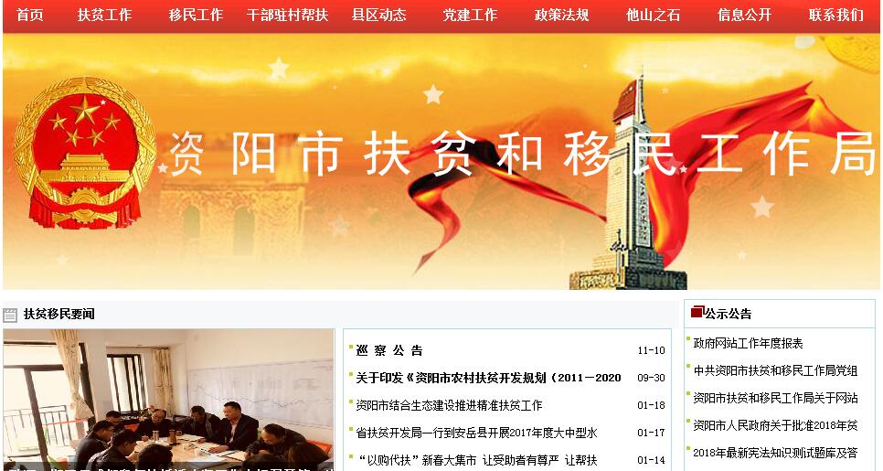 资阳市扶贫和移民工作局主要职责:一、贯彻执行国家、省有关扶贫开发和大中型水利水电工程移民迁建安置、后期扶持的方针、政策和法律、法规、规章,拟订有关具体政策措施并组织实施。二、拟订全市扶贫开发中中长期规划和年度计划,组织、协调和指导全市扶贫开发工作,组织和指导社会扶贫工作,负责联络市外机构或组织在资定点扶贫与扶贫协作工作,组织扶贫开发对外交流与合作及外资外援扶贫项目的引进与实施。三、编制新建水利水电工程移民安置规划,拟订大中型水利水电工程移民工作计划,管理和监督全市大中型水利水电工程移民迁建安置实施工作,组织移民安置验收、后期扶持和监督评估。四、负责三峡及其他大中型水利水电工程外迁(外地迁入本市)移民管理和后期扶持工作。五、承担扶贫、移民项目和资金管理责任。拟订全市扶贫开发和移民项目管理办法,负责项目、资金、基金、物资的分配、管理、使用和稽查审计、绩效考评、统计监测等工作。六、负责扶贫开发和移民政策的研究和宣传、信息工作,组织贫困群众、移民生产技能和劳动力转移培训及扶贫移民工作人员的培训。七、负责扶贫开发和移民信访接待、处理、管理工作,协调、指导相关的社会稳定工作。八、承担市政府公布的有关行政审批、行政许可事项。九、承担市扶贫开发领导小组的具体工作。十、承办市政府交办的其他事项。