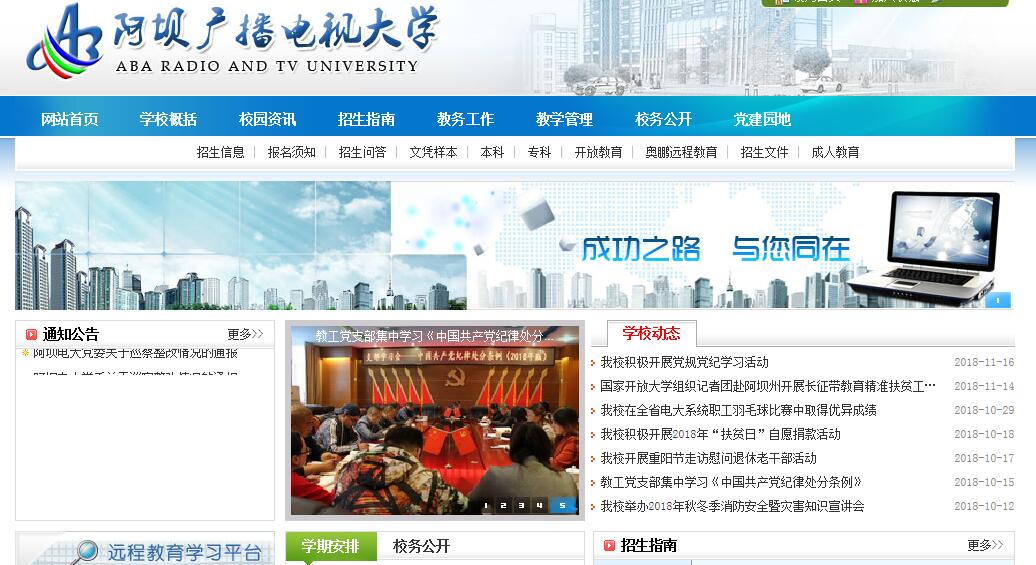 阿坝广播电视大学于1995年成立,是经国家教育部、中央广播电视大学、四川省教育厅、阿坝州人民政府批准同意设立的具有独立招生资格的大专院校,业务上接受中央广播电视大学和四川广播电视大学的领导和指导,属于国民教育系列院校。电大的高等学历毕业证书亦为欧美等世界各国所承认,被称为“国际学历绿卡”。办学17年来,学校在中共阿坝州委、州人民政府的正确领导下,在省电大以及各有关部门和社会各界的关心、支持下,全校师生员工始终保持着“严谨、求实、团结、自强”的精神,坚定不移地朝着“争创全国藏区一流电大”的目标奋勇前进。学校机构完善,配备校党委书记、校长1人,校党委委员、副校长2人,下设办公室、教学处、教务处、总务处、招生办、信息中心、阿坝广播电视大学奥鹏远程学习中心等职能处室。我校也是全国高校网络教育部分公共基础课统一考试阿坝州唯一考点。近年来,学校抢抓灾后重建的大好机遇,于2010年8月至2011年12月在汶川雁门乡异址新建新校区,并于2012年3月正式迁入新校区。新建后的校园面积0.7299公顷,有较完备的基础设施和较先进的硬件设备。作为一所新型的市州级开放性大学,建校17年来,学校办学条件大为改善,办学水平日益提高,办学综合实力不断增强,已经形成了由校本部、10个县级电大工作站、4个教学部和1个直属部构成的办学网络(“人网”)和覆盖全州各县的卫星电视网络(“天网”)以及基于互联网的宽带专用网现代远程教育系统(“地网”),三网相互配合、互为补充,为学生巩固和提高专业知识及拓宽知识面提供了良好的条件,已经形成较为完善的开展现代远程教育的多维平台和功能完备的教育质量保障体系,成为构建终身教育体系的重要组成部分。桃李不言,下自成蹊。17年来,学校紧密结合阿坝州经济和社会发展的实际,本着“尽职教育、效力阿坝、立足实用、服务基层”的办学理念,坚持面向社会、面向基层、面向农牧区,多层次、多规格、多功能、全方位培养“下得去、用得上、留得住”的应用型高级专门人才。学校开设有文、理、工、医、管理、经济、法律等七大学科46个专业,培养大中专及本科毕业生11865人,开展非学历教育培训12949人次。2012年7月5日,教育部批文同意在中央广播电视大学基础上建立国家开放大学,同时希望成立后的国家开放大学能够解放思想、更新理念,深化改革、科学定位,提高质量、办出特色,努力满足人民群众多样化、个性化的学习需要,为构建灵活开放的终身教育体系作出应有的贡献。展望未来,我们任重道远,面临新的机遇和挑战,阿坝广播电视大学将充分发挥定位优势、系统网络优势、办学体制优势、教育模式优势、教学资源优势和办学队伍优势,继续保持“严谨、求实、团结、自强”的精神,改革创新的锐气,求真务实的作风,紧密结合实际,把握新形势下成人教育的特点和规律,形成新思路,探索新途径,打造新品牌,力争在推进我州高等教育大众化、教育技术信息化、社区教育实践化和构建终身教育体系中再创佳绩。