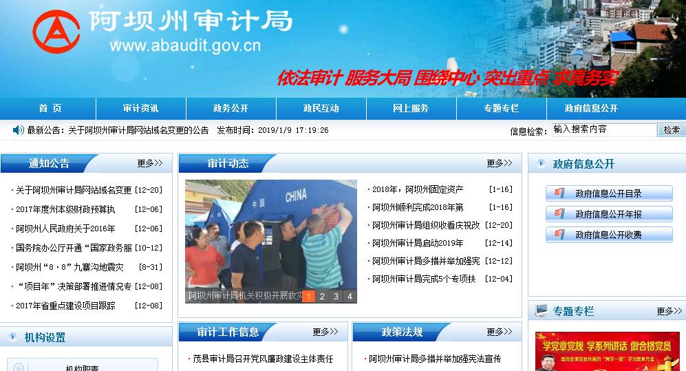 阿坝州审计局主要职责:(一)贯彻执行国家、省有关审计工作的法律法规和方针政策。负责本系统、本部门依法行政工作,落实行政执法责任制,制订并组织实施审计工作发展规划,制订并组织实施年度审计计划,组织对全州性重大投资项目、重大突发性公共事项、重要专项资金及国家、省、州重大政策措施执行情况的审计和专项审计调查,对直接审计、审计调查和核查的事项依法进行审计评价,作出审计决定或提出审计建议。(二)负责对州级财政收支和法律法规规定属审计监督范围的财务收支的真实、合法和效益进行审计监督,维护国家财政经济秩序,提高财政资金使用效益,促进廉政建设,保障国民经济和社会健康发展,对审计、专项审计调查和核查社会审计机构相关审计报告的结果承担责任并负有督促被审计单位整改的责任。(三)向州长提出州级预算执行和其他财政收支情况的审计结果报告,受州政府委托向州人大提出州级预算执行和其他财政收支情况的审计工作报告、审计发现问题的纠正和处理结果报告,向政府报告对其他事项的审计和专项审计调查情况及结果,依法向社会公布审计结果。(四)直接审计下列事项,出具审计报告,在法定职权范围内作出审计决定或向有关主管机关提出处理处罚的建议:1.州级财政预算执行情况和其他财政收支,州直各部门(含直属单位)预算的执行情况、决算和其他财政收支。2.县级人民政府预算的执行情况和决算以及其他财政收支。3.使用州级财政资金的事业单位及直属单位和社会团体的财务收支。4.州政府投资和以州政府投资为主的建设项目预算执行情况和决算。5.州属国有企业和地方金融机构、州属国有资本占控股或主导地位的企业和金融机构的资产、负债和损益。6.州政府部门以及其他单位受州政府及其部门委托管理的社会保障基金、环境保护资金、社会捐赠资金及其他有关基金、资金的财务收支。7.国际组织和外国政府在州援助、贷款项目的财务收支。8.法律、行政法规和地方性法规、政府规章规定应由审计机关审计的其他事项。(五)按规定对县级领导干部及依法属州审计局审计监督的其他单位主要负责人实施经济责任审计。(六)组织实施对国家财经法律、法规、规章、政策和宏观调控措施执行情况、财政预算管理或国有资产管理使用等与州级财政收支有关的特定事项进行专项审计调查。(七)依法检查审计决定执行情况,督促纠正和处理审计发现的问题,依法办理被审计单位对审计决定提请行政复议、行政诉讼或州政府裁决中的有关事项,协助配合有关部门查处相关重大案件。(八)指导和监督内部审计工作,核查社会审计机构对依法属审计监督对象的单位出具的相关审计报告。(九)依法领导、指导和监督下级审计机关的业务,组织下级审计机关实施特定项目的专项审计或审计调查,纠正或责成纠正下级审计机关违反国家规定作出的审计决定,按照干部管理权限协管县级审计机关负责人。(十)组织审计州政府或州政府主管部门驻外非经营性机构的财务收支,依法通过适当方式组织审计州属国有企业和金融机构的境外资产、负债和损益。(十一)指导和推广信息技术在审计领域的应用,组织建设阿坝州审计信息系统。(十二)承办州政府交办的其他事项。