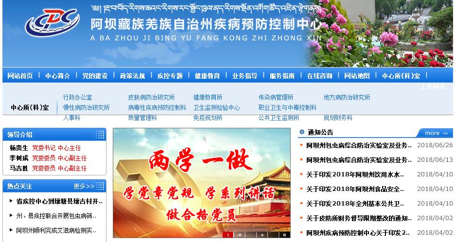 阿坝藏族羌族自治州疾病预防控制中心(以下简称阿坝州疾控中心)组建于2002年12月26日,前身为阿坝州卫生防疫站、阿坝州皮防所,成立于1956年9月5日。是经阿坝州委、阿坝州人民政府批准成立的正县级行政管理类卫生事业机构,承担全州疾病预防与控制、突发公共卫生事件调查与处置、儿童免疫规划与实施、重大疾病防控与规划、大骨节病等地方病及包虫病等寄生虫病综合防治、食品安全等五大卫生领域健康危害因素监测、致癌物等有毒有害场所监测与控制、促进公共卫生均等化等工作。负责对各县疾病预防控制中心工作进行技术指导,开展医疗机构消毒等检测与管理工作。编制105名,内设办公室、健康教育所、传染病管理所、免疫规划所、质量管理科、人事科、地方病防治研究所、卫生监测检验中心、职业卫生与中毒控制科、病毒性疾病预防控制科、公共卫生监测所、皮肤病性病防治研究所、慢性病防治研究所、规划财务科14个所科室,现有在职职工87人,其中管理人员15人,卫生专业技术人员62人,工勤人员10人。卫生专业技术人员中取得高级技术职称资格8人,高级技术职称资格8人,占专业技术人员的13%;中级技术职称资格20人, 占专业技术人员的32%;初级技术职称资格34人占,专业技术人员的55%。有研究生5人,本科学历41人,大专学历30人,中专及以下学历11人。单位多年被州委、州政府评为文明单位、最佳文明单位,多次荣获国家、省、州先进集体和优秀单位荣誉称号,获中共阿坝州委员会、阿坝州革委会“勇攀科学技术高峰”称号;1983年,获四川省人民政府“四川省先进集体”;1987年,四川省医疗照射频率和器官剂量研究获四川省人民政府“四川省科技进步二等奖”; 1992年5月,阿坝州放射性氡水平与肺癌发生率关系的研究获州人民政府“科技进步一等奖”; 2001年10月,获卫生部“全国消灭脊灰工作先进集体”; 2002年9月,获四川省人民政府“血吸虫病地方病防治先进集体”; 2003年12月,获州委、州人民政府“阿坝州SARS防治工作先进集体”; 2006年,获四川省人事厅、卫生厅“四川卫生应急工作先进集体”; 2008年,获州委、州人民政府“抗震救灾先进集体”、中华全国总工会“抗震救灾,重建家园”工人先锋号、四川省总工会“五一”劳动奖状、省人事厅卫生厅中医药管理局“抗震救灾先进集体”、州人事局州卫生局州中藏羌医管理局“全州卫生系统抗震救灾先进集体”; 2009年2月,获四川省结核病防治项目办公室“四川省第一轮全球基金结核病控制项目先进集体”; 2010年3月,《阿坝州大骨节病病情调查研究》、《疫情资料分析应用1983—2005年》分别获得阿坝州科研成果二等奖、三等奖等109个表彰。