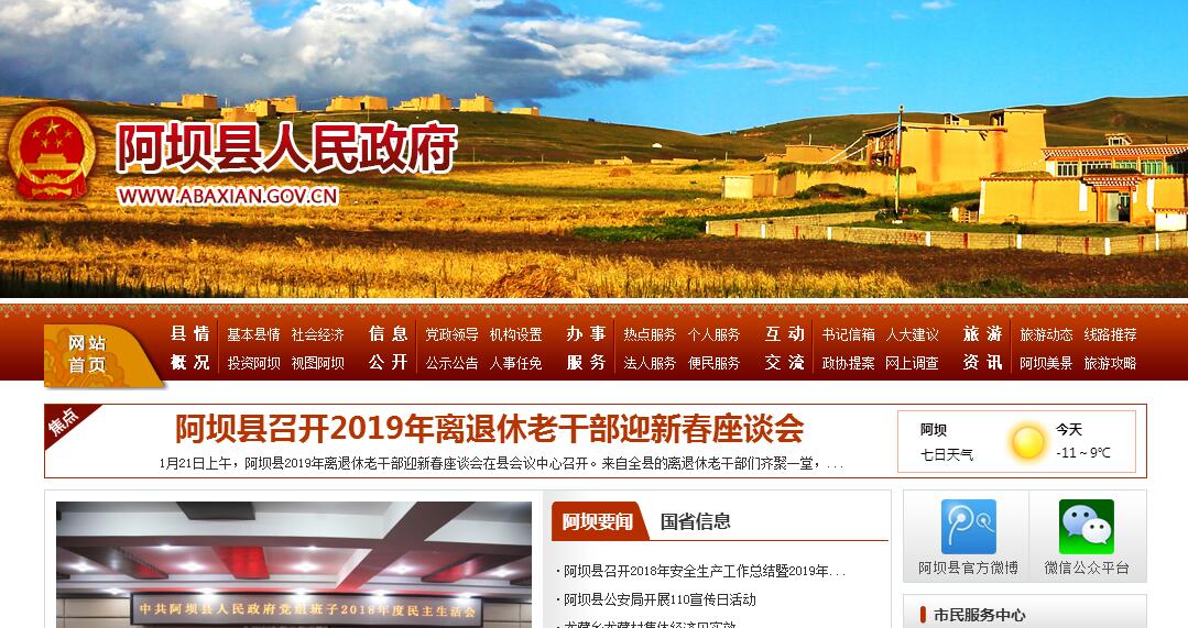 阿坝县地处青藏高原东南缘,位于川甘青三省交汇处,与州内的若尔盖县、红原县、马尔康县、壤塘县和甘肃省玛曲县、青海省久治县、班玛县等7县接壤,是内地通往西北的重要交通枢纽,是重要的商贸中心和物资集散地,是以牧为主、农牧林兼营的县,属典型的老、少、边、穷、病地区。县境内地形复杂,地势由西北向东南逐渐倾斜,县城海拔3290米,境内最高海拔5154米,最低海拔2936米,径流分属长江、黄河两大水系,属高原寒温带半湿润季风气候,无明显四季之分,昼夜温差大,无霜期短,太阳幅射强,年均气温4℃。阿坝县于1951年8月和平解放,1954年1月建县,1959年实行民主改革。全县幅员面积10435平方公里,辖2镇2场17乡83个行政村4个分场1个居委会,总人口80442人,全县藏族人口占总人口的94.1%,是一个以藏族为主的少数民族聚居县。阿坝县距红原机场97公里,是川青高速的必经之地。全县交通条件持续改善,S302线升为国道,阿龙路、阿两路和麦唐路升为省道,通车里程达1109公里。境内拥有草场1321万亩、耕地15万亩、林地314万亩,牲畜存栏66.2万混合头;野生中药材品种繁多,植物药材有69科179种,甘松、贝母、虫草在国内市场上享有盛誉;水能理论储量为147.6万千瓦,可开发量为83.7万千瓦;太阳能资源十分丰富,年平均日照时间达2500小时。旅游资源独具特色,拥有世外桃园—神座景区、莲宝叶则景区、曼则塘湿地、茸安柯河峡谷等自然景观。县境内有藏传佛教寺庙42座,格鲁、萨迦、苯波、觉囊、宁玛五种教派,被誉为藏传佛教文化博览园。由于直接从奴隶制过渡到社会主义制度的特定历史背景,加之反华势力和境内外分裂势力长期渗透破坏,阿坝县成为了分裂集团实施分裂破坏活动的策源地,对维护周边藏区乃至全国藏区的政治稳定有着极其重要而特殊的战略地位,同时也是反分裂维稳重点县。阿坝县是全国罕见的大骨节重病区,患病人口达9485人,占全县农村人口的13.1%。属《中国农村扶贫开发纲要(2011-2020年)》确定的“四省藏区”范围,也是《四川省农村扶贫开发纲要(2011-2020年)》确定的高原藏区片区县,全县贫困人口达13436人,占全县农村人口的18.6%。2017年实现地区生产总值10.9亿元,全社会固定资产投资14.5亿元,公共财政预算收入4102万元,社会消费品零售总额5.5亿元,农牧民人均可支配收入,11683元,城镇居民人均可支配收入31059元,接待游客51万人次,旅游总收入3.9亿元。