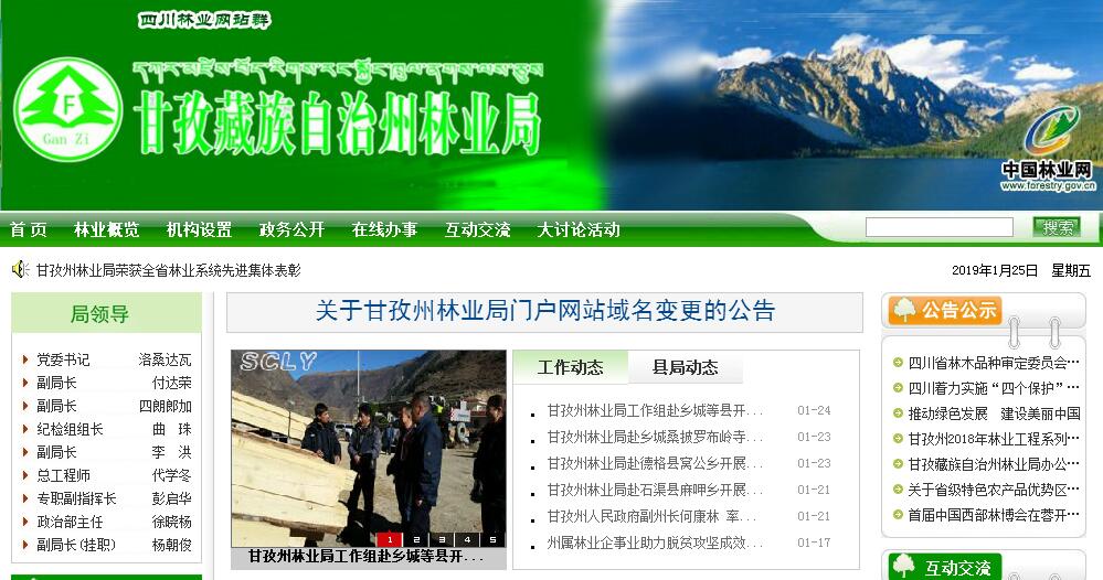 根据《中共四川省委办公厅四川省人民政府办公厅关于印发〈甘孜藏族自治州人民政府机构改革方案〉的通知》(川委厅〔2010〕39号),设立甘孜藏族自治州林业局(简称州林业局),为州政府工作部门。 其主要职责:(一)负责全州林业及其生态建设的监督管理。贯彻执行国家有关林业的方针、政策和法律、法规,拟订全州林业及其生态建设的相关政策、发展战略、中长期规划和起草相关地方性法规并监督实施。组织开展全州森林资源、陆生野生动植物资源、湿地和荒漠的调查、动态监测和评估,并统一发布相关信息。承担林业生态 文明建设的有关工作。(二)组织、协调、指导和监督全州造林绿化工作。制定全州造林绿化规划和年度指导性计划并监督执行,指导各类公益林和商品林的培育,指导植树造林、封山育林和以植树种草等生物措施防治水土流失工作,组织、指导和监督全民义务植树、造林绿化工作。承担林业应对气候变化的相关工作。承担州绿化委员会的具体 工作。(三)承担全州森林资源保护发展监督管理的责任。贯彻执行国家森林采伐限额和林地保护利用规划,组织编制并监督执行全州森林采伐限额,监督检查林木凭证采伐、运输。组织全州森林资源调查、动态监测和统计。组织、指导林地、林权管理,组织实施林权登记、发证工作,拟订全州林地保护利用规划并指导实施,依 法承担林地征用、占用的初审工作,管理重点国有林区的国有森林资源,承担国有森林资源资产产权变动的审核报批工作。(四)组织、协调、指导和监督全州湿地保护工作。贯彻执行国家有关湿地保护规划及其相关的标准规定,组织实施建立湿地公园等保护管理工作,监督湿地的合理利用。(五)组织、协调、指导和监督全州防沙治沙、石漠化防治及沙化土地防治工作。贯彻执行国家有关防沙治沙、石漠化防治及沙化土地封禁保护区建设规划并监督实施。监督沙化土地的合理利用,组织、指导建设项目对土地沙化影响的审核,组织、指导灾害预测预报和应急处置。(六)组织、指导全州陆生野生动植物资源的保护和合理开发利用。依法组织、指导陆生野生动植物的救护繁育、栖息地恢复发展、疫源疫病监测,监督管理全州陆生野生动植物猎捕或采集、驯养繁殖或培植、经营利用,监督管理野生动植物进出口。承担濒危物种进出口和国家、省保护的野生动物、珍稀树种、珍稀野生植 物及其产品出口的审核报批工作。(七)负责全州林业系统自然保护区的监督管理。依法指导全州森林、湿地、荒漠化和陆生野生动物类型自然保护区的建设和管理,监督管理林业生物种质资源、植物新品种保护,按分工负责生物多样性保护的有关工作。(八)承担推进全州林业改革,维护农民和其他经营者经营林业合法权益的责任。贯彻执行国家有关集体林权制度、重点国有森工企业、国有林场等重大林业改革意见和政策,拟订全州重大林业改革的相关实施意见和政策并指导监督实施。拟订全州林业产业发展、维护林业经营者经营林业合法权益的政策措施,指导、监督 农村林地承包经营和林权流转,指导林权纠纷调处和林地承包合同纠纷仲裁。依法负责退耕还林工作。指导国有林场(苗圃)、森林公园和基层林业工作机构的建设和管理。(九)监督检查全州各产业对森林、湿地、荒漠和陆生野生动植物资源的开发利用。贯彻执行国家有关林业资源优化配置政策及其产业标准,拟订全州林业产业发展规划和相关政策措施并监督实施,组织指导林产品质量监督。指导山区林业综合开发。(十)承担组织、协调、指导、监督全州森林防火工作的责任。组织、协调武装森林警察部队和专业森林扑火队伍的防扑火工作,承担州森林防火指挥部的具体工作。承担全州林业行政执法监管的责任,指导全州森林公安工作,管理森林公安队伍,指导全州林业重大违法案件的查处。指导全州林业有害生物的防治、检疫工作。(十一)负责指导、协调全州林业经济工作。贯彻执行国家有关林业及其生态建设的财政、金融、价格、贸易等经济调节政策,组织、指导全州林业及其生态建设的生态补偿制度的建立和实施。编制部门预算并组织实施,提出州财政林业专项资金的预算建议,管理监督州级林业资金,管理州级林业国有资产,负责提出全州 林业固定资产投资规模和方向、州财政性资金安排意见,按规定权限审核报批、核准规划内和年度计划内固定资产投资项目,指导监督林业系统财会、审计工作。编制全州林业及其生态建设的年度生产计划。(十二)负责全州林业及其生态建设的科技、宣传、教育和外事工作,指导全州林业队伍建设。(十三)负责州属林业企业领导干部的管理,指导林业企业安全生产、老干部服务工作及森工企业转产、改制过程中与有关部门和地方政府之间的问题。(十四)承担州政府公布的有关行政审批事项。(十五)承办州政府交办的其他事项。