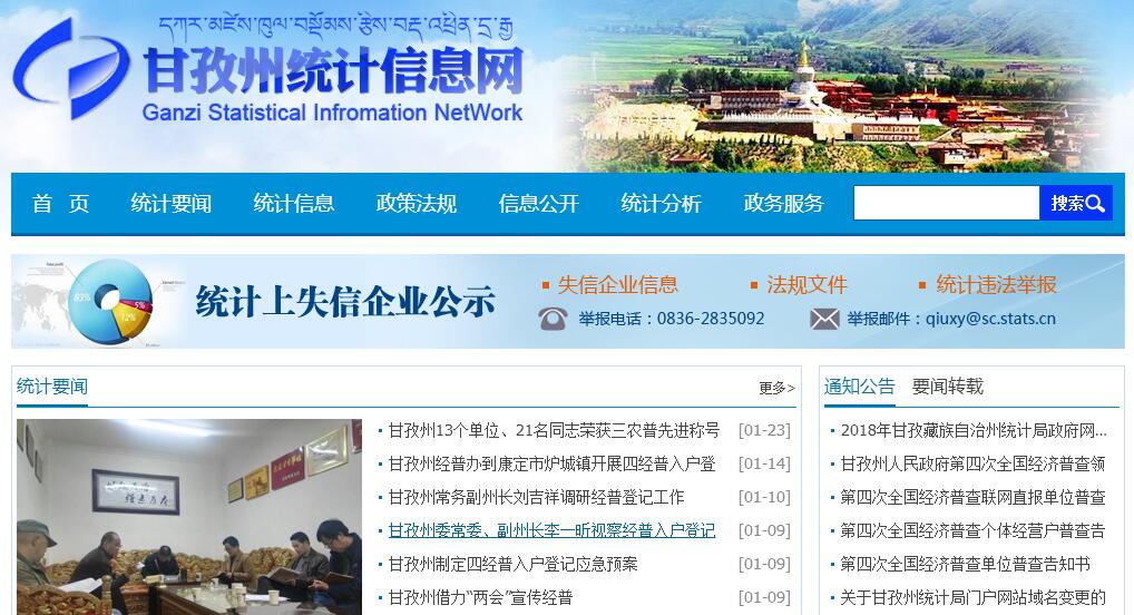 甘孜藏族自治州统计局主要职责:(一)贯彻执行国家统计工作的方针、政策和法律、法规以及统计制度、统计标准。承担组织领导和协调全州统计工作,确保统计数据真实、准确、及时的责任。(二)建立健全全州国民经济核算体系,组织实施全州国民经济核算制度,核算全州地区生产总值,整理提供国民经济核算资料,开展分析研究,指导、监督各县国民经济核算工作。(三)组织实施农林牧渔业、工业、建筑业、批发和零售业、住宿和餐饮业、房地产业等国民经济行业以及能源、投资、人口、收入、科技、社会发展 基本情况、环境基本状况等领域的统计调查,牵头综合整理和提供资源、房屋、旅游、教育、卫生、邮电、交通运输、社会保障、公用事业、对外贸易、对外经济等全州基本统计资料。(四)组织实施人口、经济、农业等普查和重大国情国力专项调查,组织实施全州投入产出调查。(五)建立健全全州统计数据质量审核、监控和评估制度,依法对县、州级部门重要统计数据进行审核、监控和评估,组织指导统计基层基础建设。(六)对国民经济、社会发展、科技进步和资源环境等情况进行统计分析和预测,定期发布全州经济社会发展情况的统计信息,向州委、州政府及有关部门提供统计咨询建议,向社会公众提供统计信息服务。(七)协助管理各县统计局正副局长,会同有关部门组织管理全州统计专业资格考试、职务评聘和从业资格认定工作,监督管理各县统计局由上级财政或统计部门划拨的统计经费。(八)组织制定全州统计数据库、统计网络的基本标准和运行规则,建立健全州统计信息共享制度,指导各县统计信息化建设。