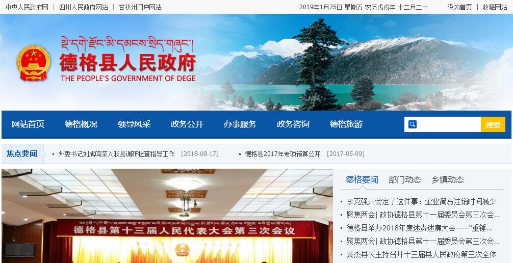 | 网站简介: 德格县,隶属四川省甘孜藏族自治州,位于甘孜藏族自治州西北部,地处东经98°12′~98°41′,北纬31°24′~32°43′之间,东与甘孜县毗邻,南与白玉县相接,西与西藏江达县隔金沙江相望,北与石渠县接壤,地处金沙、雅砻江上游。县境总面积11025.24平方千米,川藏公路国道317线贯穿县城及部分区乡,雀儿山山口海拔5050千米,有“川藏第一高、川藏第一险”之称。县城距州府康定588千米,距省会成都954千米。截至2011年,全县户籍人口83495人。政府驻地更庆镇。2010年底,德格县国内生产总值约23000万元。德格县是一个以牧业为主的县,著名景点有中国三大藏传佛教印经院之首的全国重点文物保护单位德格印经院、格萨尔王故里阿须草原。2018年9月25日,获得商务部“2018年电子商务进农村综合示范县”荣誉称号。 |