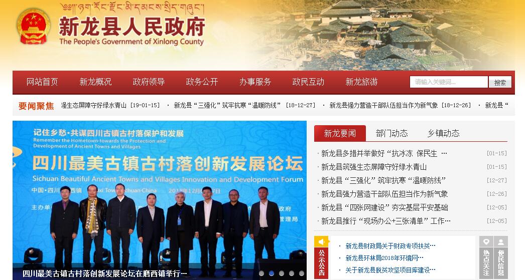 新龙,连接南北,地势北高南低。最高点为北部卡瓦洛日雪山,海拨5992米,最低点为南部孜拖西,海拨2760米。县境以北甘(孜)新(龙)公路经100公里与国道317线相连;县境以南理(塘)新(龙)路经186公里,雅(江)新(龙)路116公里与国道318线相连,随着通县油路的建设完工,新龙成为连接国道317线、318线的桥梁、贯穿甘孜州南北两路的大通道。新龙资源富集,急待开发,森林覆盖率为26%,高于全省、全国水平,雅砻江流经全境208公里,水能蕴藏总量3250万千瓦,有金、铜、锌等珍贵矿藏,尤以金成色好,品位高,享有金瞻堆之美誉;野生动物有獐、熊、豹、藏羚羊等数十种,雄龙西神山更体现人与自然,人与动物的和谐相处,境内还出产虫草、贝母、黄芪等名贵中药材。新龙文化悠远,古朴厚道,手抄<甘珠尔>孤本;格萨尔征战头盔;谷日石棺墓葬;藏式伸臂桥;贡布郎吉(布鲁曼)遗址;独特的新龙锅庄;康巴汉子的红发辨,无不体现藏文化的灿烂。新龙风光秀丽,流连忘返,卡瓦洛日雪山峥嵘壮观,雅砻江大峡谷绮丽神秘;拉日马草原宽广美丽;雄龙扎呷天人合一;措卡瑶池宁静如画;格日溶洞深遂奇险;皮擦秋色多姿多彩新龙,康巴汉子集居地;新龙,锅庄的故乡;新龙,绿色的宝山;新龙,连接甘孜州南北的大通道。解放以来,特别是党的十一届三中全会以来,新龙县各方面都发生了翻天覆地的变化,全县政治稳定、经济发展、社会进步、人民安居乐业。1999年,全县GDP达到7979万元,较上年减34.8%;工农业总产值达到5535,财政收入394.3万元农牧民人平纯收入456万元;乡企总产值完成812万元。通信条件大为改观,已开通国内外直拨、寻呼、移动电话,经济发展的外部环境大为改善。新龙县位于甘孜州腹心,地处雅砻江中游高山峡谷地带,雅砻江从北至南纵贯全境,在甘孜州经济区中属康北经济区,是康南、康北的连接地,经济实力在天保工程实施前属全州中上水平。境内林业资源丰富,是全省第二大林业县,也是长江中上游重要的生态屏障。新龙县原有5个国有工业企业,其中3个林业企业,1个电力企业,1个矿产企业。“天保”工程实施后,林业企业全部停产,只剩下电力公司和麦柯金矿两个企业,乡级以下私营工业不健全,属一些简单的粗加工,未形成一定的生产规模。