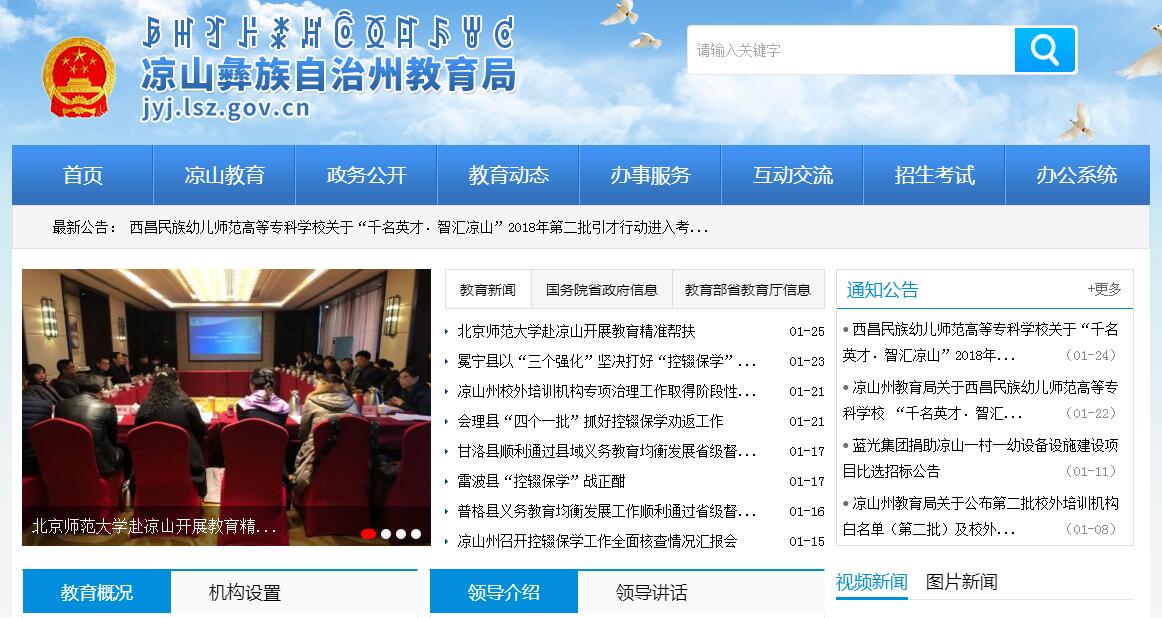 凉山州教育局,是凉山州的教育主管机构,主要任务有拟订全州教育体制改革政策和教育事业发展规划,负责各级各类教育的统筹规划和协调管理,指导各级各类学校教育教学改革和中小学校布局结构调整。其主要职责:(一)贯彻执行党和国家教育工作的方针、政策和法律、法规,负责起草有关规范性文件。(二)负责全州教育系统基本信息的统计、分析、发布工作。(三)负责义务教育的宏观指导与协调,推进全州义务教育均衡发展和促进教育公平,指导普通高中教育、幼儿教育、特殊教育工作,推进基础教育教学改革,全面实施素质教育。(四)统筹和指导全州教育督导工作,负责组织和指导对中等及中等以下教育、扫除青壮年文盲工作督导检查和评估验收工作,指导基础教育发展水平和质量的监测工作。(五)指导以就业为导向的职业教育的改革与发展,指导中等职业教育的教材建设和基地建设工作,组织实施民族地区免费中等职业教育工作。(六)负责本部门教育经费的统筹管理,参与拟定筹措教育经费、教育拨款、教育基建投资的政策和措施,监督全州教育经费的筹措和使用情况,负责对全州教育系统经费使用情况和项目的审计。指导州内外教育援助、教育贷款和教育合作项目的执行。(七)指导少数民族教育工作,组织和协调“民族地区教育发展十年行动计划”工作。负责民族寄宿制和双语教学发展规划,指导民族寄宿制和双语教学的管理以及民族团结教育工作。协调对少数民族地区的教育援助。(八)统筹规划、综合管理全州民办教育,规范民办教育秩序,促进民办教育的健康发展。(九)主管全州教师工作,负责实施教师继续教育和专业技术职务评审、教师资格审定的有关工作,指导学校内部体制改革,加强教师队伍建设,提高教师的整体素质。(十)指导各级各类学校的思想政治、德育、体育卫生与艺术教育、国防教育、安全教育、安全和稳定工作。(十一)组织实施全州普通大中专、成人高校招生(含硕士研究生)、高等教育自学考试和非学历教育考试工作,全州学历教育工作。研究提出中等职业技术学校和中小学(含职业中学)的招生计划,并组织实施。负责中师、普通高中和职业高中的学籍管理;归口管理师范类高校、中等师范类毕业生就业政策。(十二)指导、管理全州教育科学研究、少数民族语言文字教材编译、教育技术装备、学校远程教育、教材教辅资料和图书发行等工作。指导有关教育学会、协会、研究会、基金会等教育社团组织的工作。归口管理教育系统对外交流,对口支教工作。(十三)承担州政府公布的有关行政审批事项。(十四)承办州政府交办的其他事项。