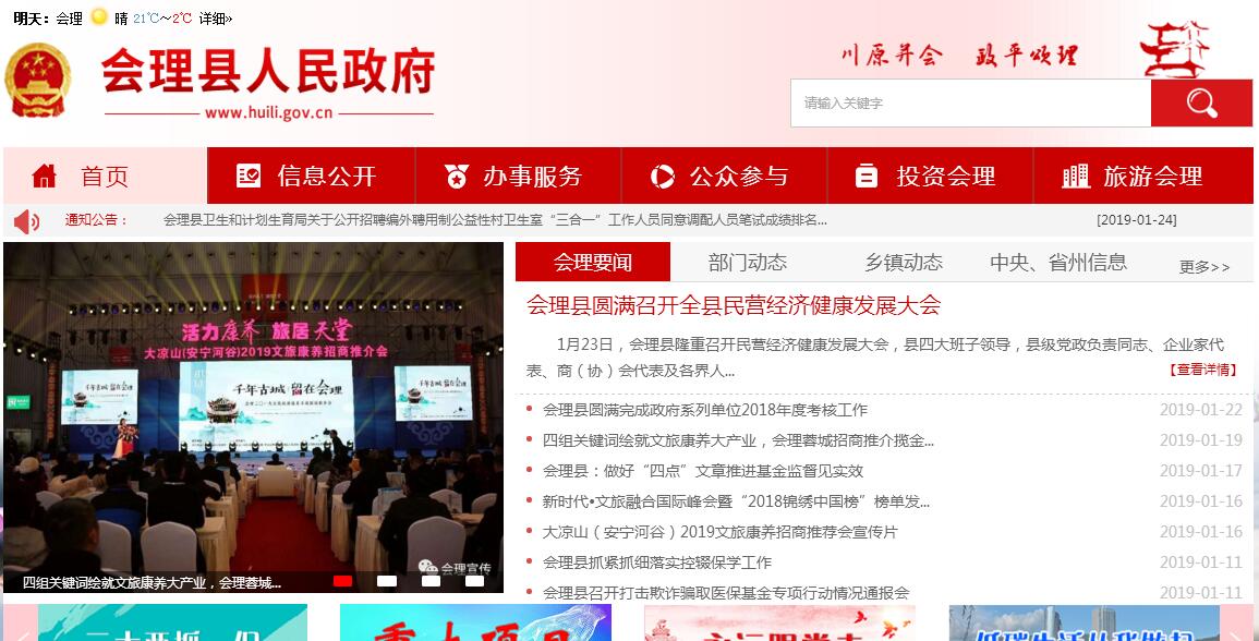 会理县隶属于四川省凉山彝族自治州,位于四川省凉山彝族自治州最南端,攀西战略资源创新开发示范区腹心地带,地理坐标为:东经101°52′~102°38′,北纬26°5′~27°12′,县城距州府所在地西昌市180公里。东部和北部分别与会东、宁南、德昌县相邻;西与攀枝花市仁和区及盐边县、米易县接壤;南与楚雄州元谋县、武定县,昆明市禄劝县隔金沙江相望,辖元面积4527.73平方公里,共有人口43.91万(2012年)。会理县,因“川原并会、政平颂理”而得名,历来是川滇两省交界的军事和经济重镇,是川滇两省商旅物资的集散地,古代南方丝绸之路从县境南北贯通达100多公里,途经44个乡镇,会理县城是这条古道的重要驿站,素有“川滇锁钥”的美誉。2011年11月2日国务院正式批复,将会理列为国家历史文化名城。2011年,会理县成为中国第118个、四川省第8个、凉山彝族自治州第1个国家历史文化名城。2015年12月,四川省旅游标准评定委员会发出通知,会理古城被评定为国家4A级旅游景区。至此,会理古城成为凉山州第5个国家4A级旅游景区,同时也是全州首次凭借古城创建的国家4A级旅游景区。2018年10月22日,入选2018年全国农村一二三产业融合发展先导区创建名单。