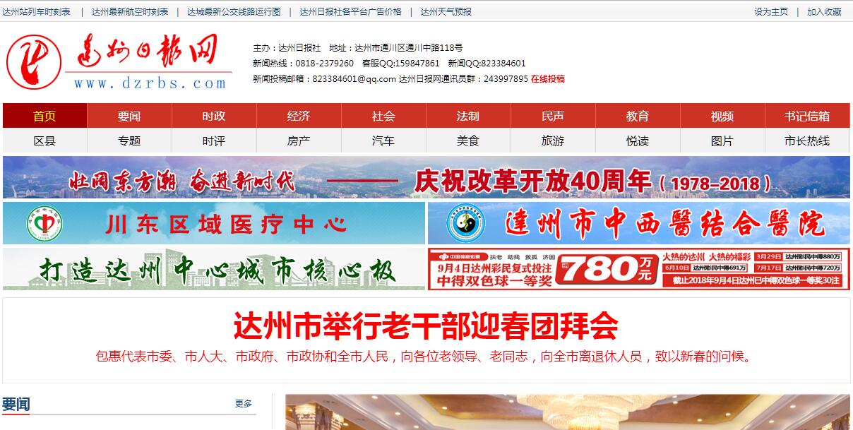 达州日报网(http://www.dzrbs.com,曾用名达州传媒网)是由中共达州市委主管,达州日报社主办,并经四川省人民政府新闻办公室备案许可的新闻网站(川新备13-140011),是继达州日报、达州晚报、达州电视台之后新兴的市级主流媒体。达州日报网拥有《达州日报》和《达州晚报》所有新闻信息资源,以新闻为主,文字、图片与视频、音频结合,每天提供权威、及时的达州新闻,汇集了达州社会、经济、文化、生活等各个方面最新信息资讯,是当今达州最具权威性最快捷全面的大型对外宣传网络信息平台。目前开设有新闻、社会、经济、民声、体育、视频、娱乐、名人、名企、房产、旅游、论坛、图片、通川区、宣汉、大竹、万源、开江等30多个新闻和信息资讯频道,并提供功能完善的社区服务和大型活动网络视频直播业务,日更新新闻资讯1000余条,成为全国以至境外第一时间了解达州权威信息的主渠道。达州日报网是泛成渝网盟副理事长单位,中国地市网盟理事单位,与人民网、新华网、四川在线、四川新闻网等新闻网站建立了战略合作关系。达州日报社新媒体中心由达州日报社党组直接领导,具体负责达州日报网、掌上达州(APP)、达州日报达州晚报官方微博、达州日报达州晚报官方微信编辑发布工作。