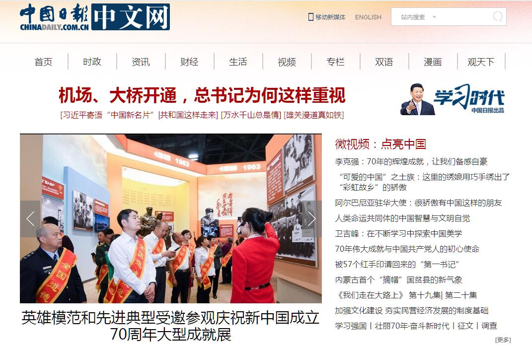 | 网站简介: 中国日报网是中国最优质的新闻发布平台,热点实时新闻发布,提供国内新闻,国际快讯,评论,财经,体育,军事,图片,文化娱乐,时尚生活,视频及互动等综合新闻资讯! |