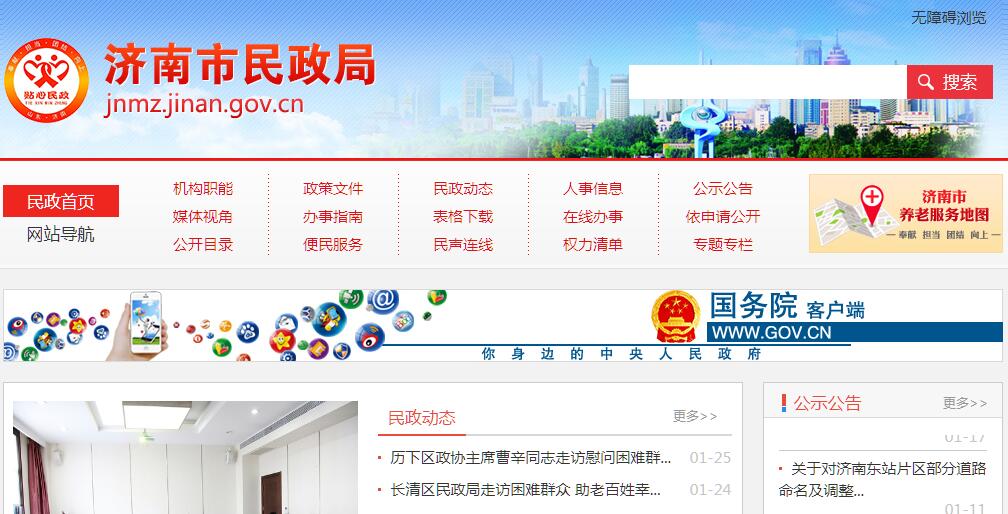 济南市民政局,是济南市人民政府的组成部门,工作内容涉及到多类社会管理和公共服务。其主要职责:(一)贯彻执行党和国家关于民政工作的方针、政策和法律、法规;起草全市民政工作地方性法规、规章草案,拟订全市民政事业发展规划和相关政策并组织实施。(二)承担依法对社会团体、民办非企业单位进行登记管理和监察的责任。(三)负责全市优抚对象的优待、抚恤、补助和国家工作人员伤亡抚恤工作;审核申报革命烈士;审核有关人员的伤残等级;指导全市革命烈士纪念建筑物建设和管理工作。(四)指导全市双拥工作;承担市双拥工作领导小组的日常工作。(五)负责全市退役士兵、复员干部、移交地方安置的军队离退休干部和军队无军籍退休退职职工接收安置工作;指导全市军队离退休干部休养所和过军供应站的建设和管理工作;指导全市退役士兵的技能培训工作。(六)拟订全市救灾工作政策;组织、协调救灾工作;组织自然灾害救助应急体系建设;负责组织核查并统一发布灾情;管理、分配救灾款物并监督使用;组织、指导救灾捐赠;拟订全市减灾规划;指导监督来济定居“三峡”工程移民的管理服务工作。(七)牵头拟订全市社会救助规划、政策和标准,负责城乡居民最低生活保障、医疗救助、临时救助、生活无着人员救助工作;推进城乡社会救助体系建设。(八)拟订全市城乡基层群众自治组织建设和社区建设政策;指导城乡社区服务体系建设;提出加强和改进基层政权建设的建议;推动基层民主政治建设。(九)拟订全市行政区划总体规划;审核乡镇以上(含乡镇、街道办事处)行政区域的设立、命名、变更和政府驻地迁移;负责市内行政区域界线的勘定和管理工作;负责市内行政区域边界争议的调查和调处;负责全市地名管理工作。(十)拟订全市社会福利事业发展规划、政策;指导全市社会福利机构建设;指导福利彩票发行工作;拟订促进慈善事业的政策,组织、指导社会捐助工作;指导老年人、孤儿和残疾人等特殊群体权益保障工作。(十一)推进婚俗和殡葬改革;指导全市婚姻登记、收养登记、殡葬管理工作;负责全市涉外、涉港澳台及华侨婚姻登记和涉华侨、涉港澳台居民的儿童收养登记工作;审批异地退休干部来济安置;审核建设经营性公墓和殡仪馆的申请;指导婚姻、殡葬、收养、救助服务机构管理工作。(十二)会同有关部门按规定拟订全市社会工作发展规划、政策,推进社会工作人才队伍建设和相关志愿者队伍建设。(十三)管理国家和省、市拨民政事业经费,指导监督民政事业经费的使用。(十四)承办市委、市政府交办的其他事项。