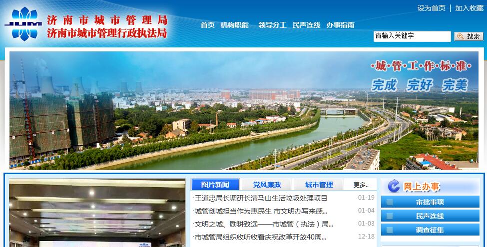 济南市城市管理局主要职能:(一)贯彻执行国家、省有关城市管理工作的方针、政策和法律、法规、规章;起草城市管理的地方性法规、规章草案;拟订城市管理的政策并组织实施。(二)根据全市国民经济和社会发展计划、城市总体规划的要求,制定城市管理专业规划及中、长期发展规划和年度计划并组织实施;拟订城市管理的地方标准并组织实施;拟订城市容貌管理与夜景亮化的标准和规定并组织实施;拟订机动车清洗行业标准并负责监督检查。(三)承担市容市貌和环境卫生管理的责任。牵头组织实施城市容貌综合整治工作;负责城区道路保洁的监督管理;负责市区保洁应急事件处理;负责城区生活废弃物减量化、资源化、无害化的处理;牵头组织市区运输散体物料交通工具容貌的监督管理。(四)组织制定全市户外广告设置规划;负责城区户外广告设置的审批。(五)承担规范建筑垃圾管理秩序的责任。组织拟订建筑垃圾管理办法和细则并组织实施;负责建筑垃圾处置的审批;会同有关部门对建筑垃圾源头和运输建筑垃圾的单位和车辆实施管理。(六)会同有关部门对城市管理设施项目进行规划、设计、建设和质量监督,组织对城市环境卫生公共设施的管理检查;提出设置生活垃圾处理场所的建议;对市区环卫设施的建设、拆迁进行监督管理。(七)负责市级数字化城市管理系统的规划、建设、运行。