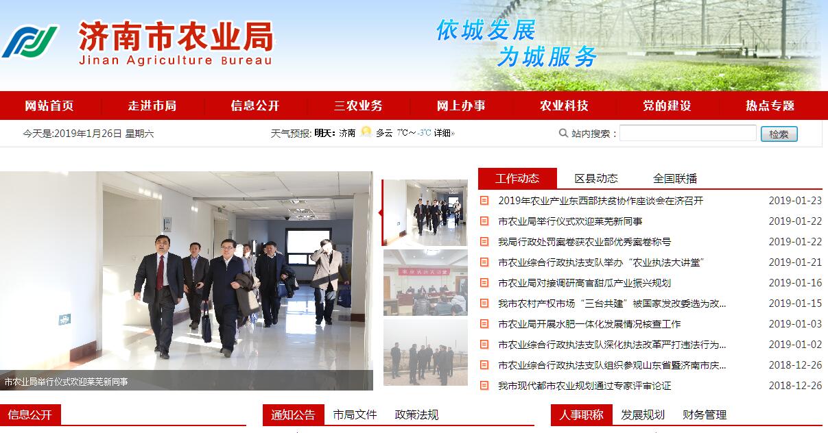 济南市农业局主要职责:(一)贯彻执行国家、省、市关于农业的法律、法规、规章和方针、政策;负责拟订全市农业和农村经济中长期发展规划、政策及年度计划并组织实施;组织起草涉农地方性法规和规章草案;参与拟订涉农的财税、价格、金融保险、进出口等政策,提出农业产业保护的政策建议;负责农业普法宣传教育,推进农业依法行政。(二)承担完善农村经营管理体制的责任。提出深化农村经济体制改革和稳定完善农村基本经营制度的政策建议;指导农村土地承包、耕地使用权流转和承包纠纷仲裁管理;负责减轻农民负担和村民筹资筹劳的监督管理工作;指导农村集体资产和财务管理;指导、扶持农业社会化服务体系、农村集体经济组织、农民专业合作社和农产品行业协会的建设与发展;参与农村基层组织建设、农村综合改革和农村社会事业发展工作。(三)承担促进农业生产发展的责任。指导农产品生产,组织实施扶持和促进农业生产发展的政策措施;引导农业产业结构调整和产品品质改善;组织实施优势农产品区域布局及农产品基地建设;会同有关部门指导农业标准化、规模化生产;指导家庭农场和现代农业产业园建设;提出农业固定资产投资规模和方向、市级财政性资金安排的建议;提出扶持农业农村发展的财政政策和项目建议;配合市财政主管部门组织实施农业综合开发有关项目。(四)承担农业产业化发展的责任。组织拟订全市农业产业化经营发展规划、政策并组织实施,促进一二三产业融合发展,承担市重点农业产业化龙头企业的认定、监测工作;拟订大宗农产品市场体系建设与发展规划,提出促进大宗农产品流通的政策建议和主要农产品的进出口建议;组织协调菜篮子工程;培育、保护和发展农产品品牌。(五)承担农产品质量安全监督管理的责任。负责组织拟订全市农产品质量安全监管体系建设规划并组织实施;负责农产品质量安全监测和农业环境监测;开展农产品质量安全风险评估,发布有关农产品质量安全日常监管信息;负责拟订农业地方标准并组织实施;指导农产品质量安全检测机构建设;负责依法实施符合农产品安全标准的农产品认证和监督管理;负责提出划定农产品禁止生产区域的建议。(六)会同有关部门监督实施农业生产资料国家标准;负责指导、协调全市农业生产资料市场体系建设;负责依法实施农作物种子(种苗)、农药、肥料、农用膜、食用菌种的监督管理;负责农业综合执法工作。(七)承担农业防灾减灾的责任。监测、发布农业灾情;负责协调种子、化肥等救灾物资的调拨,提出生产救灾资金安排建议,指导紧急救灾和灾后生产恢复;负责农作物重大病虫害防治和农业植物防疫检疫工作;参与拟订全市政策性农业保险制度,组织实施政策性农业保险工作。(八)负责农业信息工作。负责收集、发布农业和农村经济信息,开展有关农业、农机、渔业统计工作,监测分析农业和农村经济运行;负责农业信息体系建设,指导农业信息服务。(九)承担农业科研、农技推广工作。拟订全市农业科研、农业技术推广的发展规划、政策并组织实施;负责农业科技创新体系建设;指导农技推广体系改革与建设;组织引进农业先进技术,组织实施农业领域的高新技术和应用技术研究、农业科技成果转化和技术推广;指导全市农业科技园区建设;负责农业植物新品种保护和农业转基因生物安全监督管理工作。(十)负责农业资源与环境保护管理工作。负责组织农业资源区划工作和“四荒”资源的开发利用;指导农业生态环境、农业生物物种资源的保护和管理;依法负责有关野生植物、水生野生动物的监督管理工作;负责拟订耕地及基本农田质量保护与改良政策并指导实施,依法管理耕地质量;负责运用工程设施、农艺、农机、生物等措施发展节水农业。(十一)负责生态农业建设工作。负责拟订并组织实施全市生态农业建设规划;负责指导农村可再生能源综合开发利用、农业生物质产业发展和农业农村节能减排;承担指导农业面源污染治理有关工作;承担全市农作物秸秆综合利用有关工作;指导生态农业、循环农业发展;牵头管理外来物种。(十二)负责农业高新园区建设与管理工作。负责组织编制农业高新技术开发区中长期建设发展规划和年度计划并组织实施;负责进区项目的立项、选址定点、施工管理工作;负责协调园区招商引资、外经外贸和对外经济合作工作;负责驻区企业、单位的协调、评价、考核服务工作;负责高新园区内科技项目的筛选、论证和申报以及园区内高新技术企业和产品的审核、上报工作。(十三)承办农业涉外事务。参与拟订农业对外开放政策和外向型农业发展规划,指导农业外向型经济发展;组织开展农业贸易促进工作和国际经济、技术交流与合作,组织农业方面外资、项目的引进和管理;协助有关部门组织实施农业援外项目。(十四)承担农业机械化和农业机械管理责任。负责拟订全市农业机械化、设施农业、农用航空业的中长期发展规划及年度计划并组织实施;负责提出农业机械装备结构调整和产业发展方向及措施;负责全市农业机械化生产、农机工程开发和农机服务体系建设;指导农机跨区作业工作;负责指导全市农机管理、安全监理、修配管理、产品质量管理及技术推广、人员培训等工作;承担扶持农业机械发展财政补贴的有关工