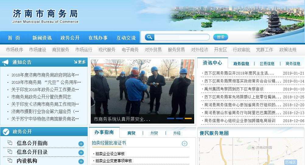 济南市商务局主要职责:(一)贯彻执行国家、省、市有关商务工作的法律、法规、规章和方针、政策;起草商务领域的地方性法规、规章草案,拟订全市商务发展规划、年度计划并组织实施。(二)承担牵头协调整顿和规范市场经济秩序工作的职责;拟订规范市场运行、流通秩序的政策;推动商务领域信用体系建设;负责商务行政执法工作。(三)负责拟订总体和区域商贸流通发展规划、城乡商业网点规划及商品市场、商务领域重点行业发展规划;提出引导国内外资金投向市场体系建设的政策建议;指导重要商品批发市场、商业功能区、经济综合体、商业体系建设与发展;推进农村市场和农产品流通体系建设;监督管理拍卖、租赁、汽车流通、报废汽车回收(含拆解)、旧货流通等特殊流通行业。(四)负责商贸服务业行业管理工作,拟订发展规划并组织实施;研究全市商贸服务业领域发展中的重大问题,指导流通行业经营活动;引导社区商业发展;负责贯彻落实再生资源回收行业的政策及有关规定。(五)负责监测分析市场运行、商品供求状况,调查分析商品价格信息,进行预测预警和信息引导;负责建立健全生活必需品市场供应应急保障机制,组织重要生活必需品紧急调度;负责重要消费品储备管理和市场调控工作;负责重要生产资料的市场监测工作;负责拟订药品流通行业发展规划、政策,推进药品流通行业结构调整,指导药品流通企业改革,推动现代药品流通方式发展。(六)负责推进流通产业结构调整,指导现代流通方式改革,培育骨干流通企业发展;推动流通标准化和连锁经营、商业特许经营、电子商务等现代流通方式发展。(七)负责全市国内会展业发展的促进工作,拟订以市政府名义举办或重点资金扶持项目的年度展览计划并协调落实,组织拟订推进国内会展业发展的相关政策并组织实施;统筹协调我市国内各类商贸会展活动,培育我市品牌展会。(八)负责商务系统涉及世贸组织相关事务的研究、指导和服务工作;组织协调涉及我市的反倾销、反补贴和保障措施及其他与进出口公平贸易相关的工作,组织产业损害调查。(九)负责有关国外商务事务的联络工作;承担境内外重大商务活动的组织协调工作;负责办理外国商务人员来访邀请。(十)组织拟订进出口中长期规划;指导管理加工贸易;负责协调重要工业品、农产品(不包括粮食、棉花)和原材料的进出口许可相关事宜,指导贸易促进活动和外贸促进体系建设。(十一)贯彻执行国家机电产品进出口方针政策,制定鼓励机电产品开拓国际市场的政策并组织实施,协调机电产品进出口招标和大型成套设备进出口工作。(十二)贯彻国家技术进出口相关政策,制定全市技术进出口政策并组织实施;负责技术进出口的审核、申报工作,组织实施“科技兴贸”战略和高新技术产品贸易促进工作。(十三)会同有关部门制定促进服务贸易和服务外包发展规划、政策并组织实施;推动服务外包园区和平台建设;负责服务贸易人才队伍建设。(十四)贯彻落实国家和省有关鼓励“走出去”的政策,组织制定全市“走出去”发展规划并组织实施;负责境外投资、对外劳务合作、对外援助等对外经济技术合作业务的审核、申报和监督、管理工作。(十五)组织拟订全市省级以上经济开发区及综合保税区等海关特殊监管区发展规划和政策并组织实施;负责全市国家与省级经济开发区设立、撤销、扩区、更名等事项的审核上报工作;指导全市省级以上工业园区发展工作,提出发展战略、产业规划等决策建议并制定相关扶持政策,会同有关部门督查相关政策和法规落实,协调解决园区发展建设中的重大问题。(十六)承办市委、市政府交办的其他事项。