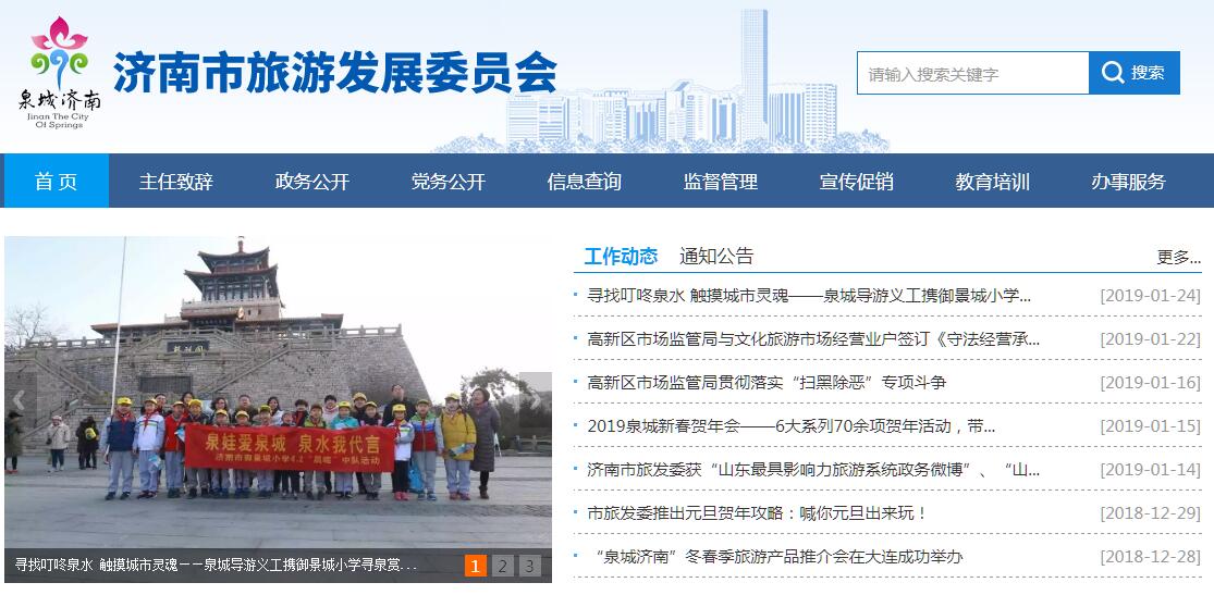 济南市旅游发展委员会主要职责:(一)贯彻执行国家和省、市旅游相关法律、法规、规章和方针、政策;起草相关地方性旅游法规、规章草案;统筹协调全市旅游业发展,拟订全市旅游发展政策和规划,并组织实施;对旅游政策、法律法规、规章执行情况进行监督检查;依法履行行政复议被申请人职责。(二)会同有关部门普查全市旅游资源;统筹协调旅游资源的规划、开发、利用与保护;指导全市重点旅游区域、旅游目的地和旅游线路的规划开发;监测全市旅游经济运行,负责旅游调查、统计分析和行业信息发布。(三)推进旅游业与相关产业融合发展,优化全市旅游产业结构和产品结构,培育壮大市场主体;推进旅游休闲体系建设,协调和指导乡村旅游、红色旅游、假日旅游、生态旅游工作,引导休闲度假。(四)统筹协调旅游标准化工作;依法承担规范旅游市场秩序、监督管理服务质量、维护旅游消费者和经营者合法权益的责任;牵头组织对旅游市场秩序的整治工作,推进旅游联合执法;负责旅游安全监管的综合协调,指导旅游突发事件应急救援工作,参与旅游突发事件的调查;负责旅行社及分支机构业务经营许可证核发,出境旅游业务经营许可的初审。指导全市旅游行业精神文明建设和诚信体系建设;监督、指导全市旅游行业组织的业务工作。(五)拟订全市旅游市场开发战略并组织实施;统筹组织旅游形象宣传和推广工作,协调推进“泉城济南”旅游品牌建设;推动区域旅游合作;推动全市旅游国际交流与合作,承担与国际旅游组织合作的相关事务;贯彻执行国家出国旅游和国家、省赴港澳台旅游政策,指导全市对港澳台旅游市场推广工作。(六)协调推进部门合作,推动旅游基础设施的建设与管理,优化旅游环境;推进旅游公共服务体系建设,提升旅游服务功能。(七)制定并组织实施旅游人才规划,指导全市旅游培训工作;组织实施旅游从业人员职业资格标准和等级标准。(八)承办市委、市政府交办的其他事项。