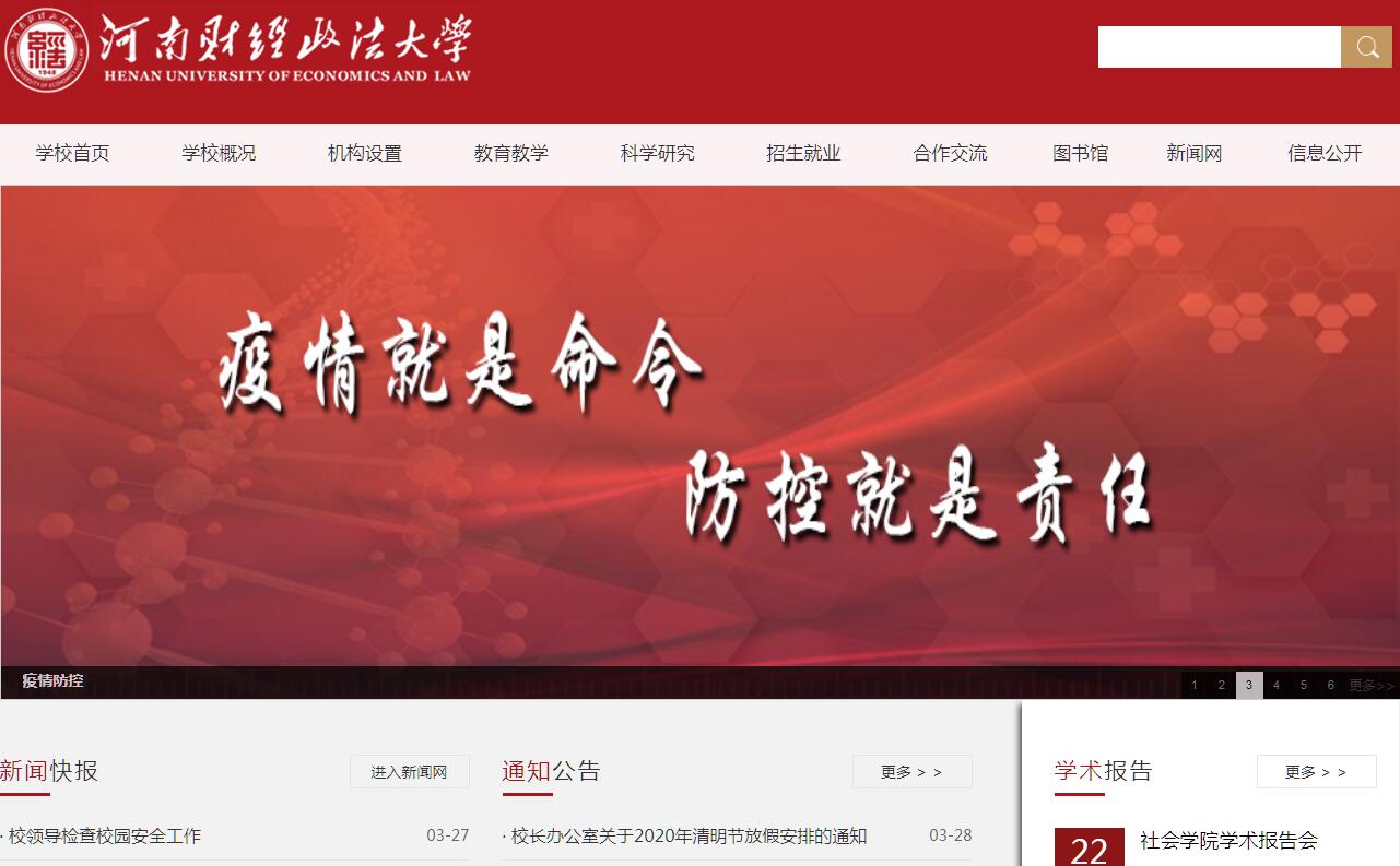 河南财经政法大学位于河南省郑州市,地处中华腹地,九州通衢,北邻黄河,西依嵩山,是省属公办全日制普通高等学校,河南省重点支持建设的骨干特色高校之一,河南省博士学位授予重点立项建设单位。学校现有文北校区、文南校区和郑东校区3个校区,占地面积2000多亩,总建筑面积110万余平方米。学校建有各类教学实验室,图书馆纸质藏书270多万册,电子图书630多万册。教学、科研、体育场等基础设施齐全。校园四季环境幽雅、花木繁茂、碧草如茵、景色宜人,是郑州市花园式单位,是读书治学的理想园地。学校以经济学、管理学、法学为主干,兼有文学、理学、工学、艺术学、哲学等学科门类。现有65个本科专业,有理论经济学、应用经济学、管理科学与工程、工商管理、农林经济管理、法学、哲学、地理学、马克思主义理论、计算机科学与技术、城乡规划学11个硕士学位授权一级学科,另有金融、应用统计、税务、国际商务、资产评估、法律、农业、工商管理、公共管理、会计、审计、新闻与传播、社会工作、工程、工程管理15个硕士专业学位授权类别。金融学、会计学、工商管理、国际经济与贸易为国家级特色专业,财政学为国家级专业综合改革试点。“经济管理与现代服务业学科群”入选河南省优势特色学科建设工程。有理论经济学、应用经济学、管理科学与工程、工商管理、农林经济管理、哲学、法学、地理学、马克思主义理论9个省级重点一级学科,有计算机应用技术、中国古代文学2个省级重点二级学科。学校拥有一支阵容整齐、结构合理、学术精湛、锐意创新的师资队伍。现有教职工2000余人。拥有长江学者、国家万人计划领军人才、国际欧亚科学院院士、国家“新世纪百千万人才工程”第一层次入选者、国家级有突出贡献的中青年专家、享受国务院政府特殊津贴专家、中宣部文化名家暨“四个一批”人才、省管优秀专家、省级学术技术带头人、省级创新人才、全国模范教师和省级教学名师等优秀人才。全校现有全日制在校学生近30000人。学校注重培养应用型创新人才,教育教学质量上乘,就业形势良好。2008年在教育部本科教学工作水平评估中荣获优秀等次。学校建设有6个省级实验教学示范中心和1个虚拟仿真实验教学中心,是省级卓越法律人才培养基地和省级卓越工程师培养基地。近三年,学生在全国性学科竞赛、创新技能竞赛中获国家级奖励近500项。学校设有本科生导师制,以本科生为主力撰写的《退休行为及退休年龄研究》、《生育行为与生育政策》等专著引起社会强烈反响。多年来,毕业生年底就业率始终保持在90%以上,毕业生深受用人单位欢迎,连续获得“河南省大中专毕业生就业工作先进单位”等荣誉称号,是国家人才网毕业生求职信息注册全国就业推荐单位及河南省确立的“河南省毕业生就业市场财经政法类分市场”和“河南省高校创业教育示范学校”。学校立足服务地方经济社会发展,建立健全科研机构,涌现了一批原创性、标志性、前沿性研究成果。学校现有河南省经济与社会发展研究院、城乡协调发展河南省协同创新中心、现代服务业河南省协同创新中心和河南经济研究中心等省级智库、研究基地16个。近三年,学校承担省部级以上科研项目351项,发表高水平学术论文514篇,获得省部级以上科研成果奖52项,出版学术著作271部。杨承训、李小建等专家学者向中央及省委、省政府建言献策,多次受到领导批示。学校教师主持或参与多项国家和地方法律法规的起草、修订工作,担任地方国家机关法律咨询专家,每年为社会办理百余起法律援助案件。学报《经济经纬》为“中文核心期刊”、“中文社会科学引文索引(CSSCI)来源期刊”和“全国百强社科学报”;《河南财经政法大学学报》为“RCCSE中国核心学术期刊”。学校积极发挥学科、人才和信息优势为国家和地方经济社会发展服务,特别是全方位服务中原经济区开发开放,成为地方经济社会发展的“智囊团”和“人才库”。学校坚持国际化办学,培育了良好的社会形象。学校与美国、英国、俄罗斯、澳大利亚、新西兰、爱尔兰、印度等国家的大学及文化教育机构建立了合作交流关系,开展多模式、宽领域的国际合作交流。积极引入优质境外教育资源,以中外合作办学项目为平台,逐步建立与国际接轨的专业教学课程体系,共同培养具有国际视野的高层次人才。学校实施骨干教师海外培训计划,加大访问学者的派出力度,提升教师国际化水平。近年来,学校荣获“全国群众体育先进单位”、“河南十大领军高校”、“河南公众满意的十佳本科院校”、“河南高等教育就业质量最佳示范院校”等称号;先后获得“河南省思想政治工作先进单位”、“河南省普通高校先进党委”、“河南省文明单位”等荣誉称号。目前,全校师生秉承“博洽通达、弘毅致远”的校训,弘扬“团结、勤奋、求实、创新”的校风,实施“人才强校、质量立校、学术兴校、特色名校、制度治校、文化厚校”的战略,正在为建成国内有地位国际有影响特色鲜明的高水平大学而努力奋斗!