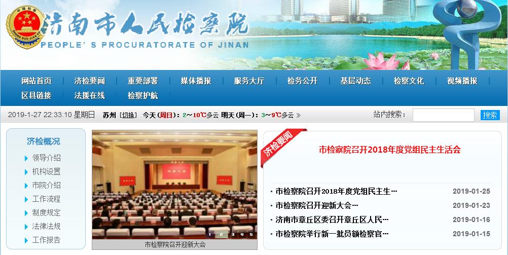 济南市人民检察院下辖市中、历下、天桥、槐荫、历城、长清、章丘、济阳、莱芜、钢城、平阴、商河12个区、县检察院和高新区院、城郊院2个派出检察院,市院机关下设办公室、政治部、侦查监督处、公诉一处、公诉二处、刑事执行检察处、民事行政检察处、控告申诉检察处、检察技术处、法律政策研究室、警务处、计划财务装备处、监察处、离退休干部工作处、机关党委等18个内设机构。近年来,该院以习近平新时代中国特色社会主义思想为指导,牢固树立“四个意识”,坚定“四个自信”,坚决做到“四个服从”“两个维护”,全面贯彻落实党中央决策部署,省委、市委和最高检、省院各项工作要求,坚持讲政治、顾大局、谋发展、重自强,围绕“走在前列做示范”的总体目标,聚焦检察监督主责主业,忠实履行法律监督职责,开创了全市检察工作新局面。该院先后三次被最高检授予“全国检察机关基层院建设组织奖”,该院多次被省院荣记集体一等功、,连续多年被评为“省级文明单位”。所辖基层院中,槐荫区院被评为“全国十佳基层检察院”,历下区院、槐荫区院、历城区院先后被评为“全国模范检察院”,天桥区院、商河县院被评为全国“先进基层检察院”,章丘区院被最高检荣记集体一等功;并涌现出全国“五一劳动奖章”获得者、“全国模范检察官”、省“优秀共产党员”孟红伟,“全国模范检察官”吕晓蓓、于凤霞等一大批先进典型。