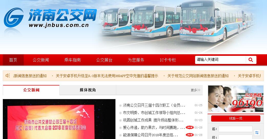 济南公交网是济南市公共交通总公司的官方网站,于2006年元月开通。网站始终坚持“先导性、窗口性、服务性、社会性、系统性”的理念,为市民出行、企业拓展、社会需求提供全面、及时、准确和实用的济南市公共交通信息,努力提升济南市公共交通服务水平,不断推进济南公共交通信息化、智能化建设。网站根据形式发展需要和需求,设立了公交新闻、乘车指南、公交展台、为您服务、IC卡专栏和公交论坛六个版块。网站内容丰富、信息及时、功能全面,为市民提供全面准确的乘车信息,搭建了乘客与公交企业交流的信息平台,是济南公交面向社会的一个重要窗口。公交网站作用:满足信息需要,发挥媒体作用。网络被称为“第四媒体”,济南公交网站的建立,意味着济南公交总公司从此拥有了一个自己的媒体, 使总公司在信息传播领域由过去单向、被动的局面朝双向、交互、主动的局面迈进,随着网站内容的完善和访问量的提高,总公司发布的各类新闻、重要公告等,不仅可以进一步满足市民的信息需要,也将逐步发挥 媒体更多的功能和社会影响力。架设沟通桥梁,拓展公交服务。通过网站市民不仅可以方便地查询公交线路、站点,得到最佳出行方案,亦可及时了解济南公交线路的最新动态。通过在线投诉、网上调查、公交论坛等栏目,总公司可以与社会公众沟通交流,一方面通过意见反馈,发现并解决存在的问题,及时化解矛盾,取得更广泛的理解支持,一方面可以及时了解市场动态,促进内部管理,为生产经营提供参考。并通过IC卡相关栏目,市民可以查询到哪个IC卡发售点离自己最近及IC卡最新信息。济南公交总公司将进一步完善网站功能,加大公交同社会公众交流的互动力,充分体现济南公交总公司的服务方针:服务为本、乘客至上、诚实守信、奉献于民。金杯银杯不如百姓的口碑,金奖银奖不如乘客的夸奖。为乘客提供安全、便捷、准点、舒适的乘车条件,让群众真正满意是我们不懈的追求。在今后的发展中,济南公交网将并不断充实网站的服务功能,探索网站内容的多媒体表现形式,把济南公交网建成国内一流的专业公交企业网站。
