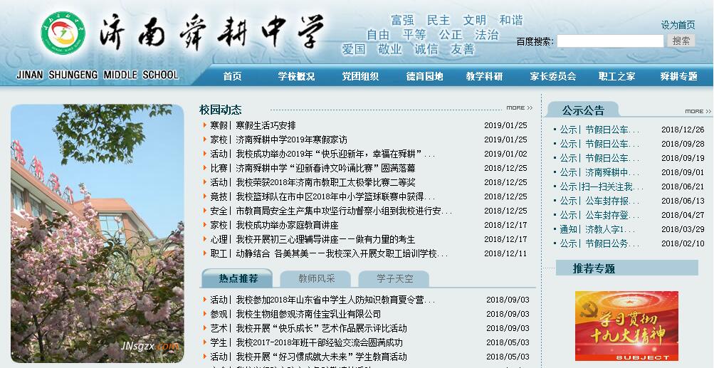济南舜耕中学建于1990年,是济南市教育局直属学校;位于风景秀丽的千佛山西南,占地面积为2.8万平方米;现有36个初中教学班,在校学生1800余人,在职教职工135人。学校牢固树立“以人为本,凝心聚力,成就师生,发展学校”的办学宗旨,践行“载舜华德,志耕天下”的校训,确立了“创建规模适当、设施先进、环境优美、师生和谐、高质量、有特色、有品位的学校”的发展目标,在办学水平上不断取得新的突破。学校重视教师队伍建设,倡导良好师德,实施“三大工程”(青年教师成才工程、“名师”建设工程和教师岗位继续教育工程),提升教师素质。现有省特级教师1名、优秀教师2名、教学能手2名,市优秀教师2名、教学能手4名、优秀班主任10名、师德先进个人4名、学科带头人3名。坚持“育人为本,德育为先”,强化德育是所有教育者责任的意识,让所有的教师都成为“班主任”。重视学生的知书达理教育、心理健康教育、信心教育和感恩教育,引导学生“学会做人,学会求知,做最好的自己”。突出教学中心,深化课程改革,建立了“必修课+选修课+校本课程+活动课+特长课”五位一体的课程体系;面向全体学生,实行分层教学,打造有效课堂,使学生个性得到充分发展,知识水平、学习能力全面提高。学校获得国际生态学校,创建国家级绿色学校先进单位,国家级语言文字规范化示范校,山东省规范化学校、教学示范学校、心理健康教育先进学校、科普示范学校、艺术教育示范学校、家庭教育先进学校、教育系统行风建设先进单位、体育传统项目学校(篮球、足球),济南市教书育人先进单位、德育规范化学校、义务教育课程改革先进学校等称号。