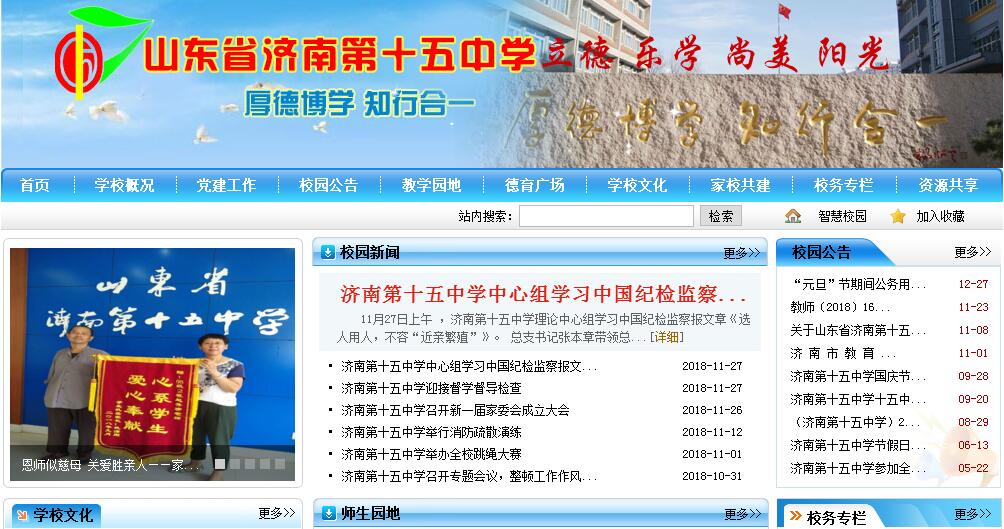 济南第十五中学是一所具有70年办学历史的学校,始建于一九四九年,原名济南工人子弟中学,由时任济南市市长姚仲明主持筹建并担任名誉校长。一九五六年改现名山东省济南第十五中学,一九八二年改名济南师范专科学校附属中学,一九八九年恢复山东省济南第十五中学校名。学校校舍占地面积20009平方米,建筑面积11612平方米,其中教学实验楼6475平方米,办公综合楼4100余平方米。学校有200米环形塑胶跑道、百米直道的标准运动场地和篮球排球场地,配有各种体育健身器材。有语音室、多媒体教室、微机室、物理实验室、化学实验室、生物实验室、音乐、美术教室、图书室、阅览室等各类专用教室,建有生态观赏园一处,有可各容纳300人的阶梯教室和报告厅。学校先后获得济南市文明单位、市级规范化学校、市家长满意学校、市德育工作先进单位,市绿色学校,市语言文字先进集体,平安济南建设先进基层单位,安全工作四星级单位。是省级体育传统项目学校,山东省心理健康教育先进单位,省级卫生先进单位,全省消防安全教育示范学校,实践科学发展观活动“省级先进单位”, 济南市先进基层党校,市教育局党委先进基层党组织,市行风建设先进单位, 市依法治校示范校,市教育系统党风廉政建设先进单位,市教育新闻宣传工作先进集体等荣誉,办学质量和师生的精神面貌得到社会、社区、家长的认可和好评。
