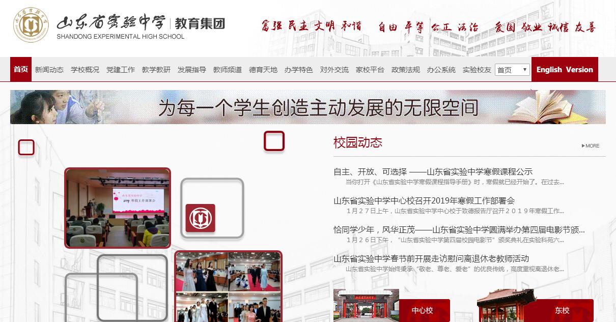山东省实验中学建校于1948年,是首批省级重点学校、省级规范化学校。学校分中心校(走读)、东校(寄宿)和西校(寄宿)三个校区。现有教学班179个,学生9000余名,教职工740余人。2018年4月济南大学城实验高级中学(寄宿)成为山东省实验中学教育集团核心学校。在70年的办学历程中,学校培养了数以万计的优秀学子,以聪明才智和卓越贡献为母校和泉城增光添彩,而实验中学也以骄人的办学成绩获得了“全国教育系统先进集体”“全国创先争优先进基层党组织”“全国文明校园”“国家级绿色学校”“国家级体育传统项目学校”“全国学校艺术教育先进单位”“全国和谐校园先进学校”“中小学生创造力培养示范学校”“全国教育科研先进单位”等数十项国字号荣誉称号。教育部领导多次高度评价学校的育人举措和办学成果,很多做法和经验被中央电视台、《中国教育报》、《光明日报》等媒体多次报道,成为齐鲁素质教育的领跑者并跻身全国知名高中。学校努力体现“实验性”和“示范性”的办学特色,鲜明地提出“为每一个学生创造主动发展的无限空间”的教育理念,以“高远、大气、宽松、求新”的学校文化作根基,以创建促进学生全面而有个性发展的课程体系作保障,努力创办“高境界、高品质,能够影响学生一生发展的教育”。近年来,学校全面推进“对话型教育”和“幸福教育”,努力创建民主、平等、尊重的生活方式,让每一个实验学子都享有“公平有质量、理性有温度”的教育,使校园成为师生“倾心对话的乐园,求知创造的学园,愉悦幸福的家园”。教师是学校发展的基本保障。实验中学以校本教研为主导,以教研组建设为抓手,促进教师职业道德、专业素养、课程开发能力、科研能力的全方位提高。开展“作业改革年”“命题研究年”“集体备课年”“课程提升年”建设,以教学关键问题为抓手进行专项突破,引导全体教师研究教学规律,提高教学质量。深化“成长、成材、成功、成名”工程,探索“教师发展共同体”发展模式,设立专门基金为教师出版专著……众多举措激发了教师工作激情,提升了教师的专业发展水平和职业幸福感。学校现有享受国务院津贴专家1人,特级教师17人,全国优秀教师2人,山东省教育创新人物3人,齐鲁名校长、齐鲁名师5人,省市级教学能手22人、济南专业技术拔尖人才6人,全国、省市级优质课评比获奖者百余人。根基雄厚、结构合理、素质一流的教师队伍,为打造优质教育品牌提供了重要保证。实验中学以“引领式”德育课程体系激发学生成长的主动性和内驱力。精神引领课程——二十大主题教育校本课程成为学生情商培养的系统工程;“实验学子修身行动”、红五月朗诵会等成为道德实践品牌;文化引领课程——民族文化进课堂、进生活、进社团,烙画课程、清明诗会被众多媒体报道,学校获“山东省传统文化体验教育实验学校”称号;实践引领课程——通过十四个实践基地组织学生开展综合实践活动,“文明泉城我先行”“爱心接力”等一批公益品牌活动彰显时代风尚,获评“全国志愿服务示范学校”;同伴引领课程——通过“学长制”使良好的校园文化和美好品德在历届学生中传承,该项目荣获基础教育国家级教学成果一等奖,并成为济南首张德育名片;家庭教育引领课程——通过父母大学、《家庭教育论坛》文集等引领使科学的家庭教育理念落地生根;成长引领课程——创设全员育人的教育环境,一年一度的“读书节”、“体育节”、“艺术节”、“科技节”和“电影节”成为学生全面提升素质、充分展示才能的广阔平台。实验中学一切从发现学生的兴趣、尊重学生的选择、培养学生的特长出发,根据“落实国家课程要求,满足学生成长需要,对接高考综合改革,凸显学校课程特色”的课程建设原则,对国家课程、德育课程、选修课程、国际课程、综合实践课程等进行了梳理和提升,构建“完整有体系、规范有活力”的德育一体化课程;建立“前瞻性、贯通式、全方位、开放性”的选修课程。创设体验课程,使学生在课程体验中发现自己的兴趣点、优势点和发展点,实现理性的选择。创设融合课程,实现学科间的关联与融合,培养师生融合思维的意识与能力。实验中学注重全方位实施素质教育、全面提升教育教学质量。不断加大课堂教学改革力度,全面实施“精准教学”。通过类型课推进,精准到每节课的有效讲解;通过作业质量和总量监控机制,精准到每道题的高效演练;通过命题研究,精准到每个变化趋势的备考研究;通过加强分层分类教学和差异化帮扶,精准到每个学生的发展引领,使精准教学成为提升教学质量、减轻学生负担的重要保障。建立学校自我诊断机制,全面深入分析教育教学现状,清晰确定学校工作的优势与缺陷,科学界定教学改革方向,使诊断文化成为学校可持续发展的重要推动力。实验中学深入探索多元化人才培养。完善了分层选课走班制,使每个学生拥有适合自己的一张课表。加强了与高校教育资源及模式的接轨,“山大创新班”、“中科大创新班”满足了学生全面发展和个性化发展的需求。中美课程班成绩突出,五届毕业生均被美国、英国等世界知名大学录取。2015年,经教育部、公安部、总政治部批准,我校成为全国16所空军青少年航空学校首批承办中学之一,三年共招收三