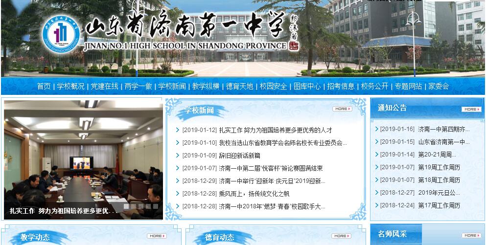 山东省济南第一中学创建于1903年,有着醇厚的文化氛围和悠久的育人传统。一百多年来,济南一中以不屈不挠、勇于奋进的精神,兼收并蓄、厚积薄发的品格,民主科学、严谨求实的作风,为民族的崛起和振兴,培养了一代又一代的社会英才。楚图南、胡也频、李广田、卞之琳等近代著名学者、作家都曾在这里任教;邓恩铭、季羡林、罗干、臧克家、贺敬之、欧阳中石等都曾在这里读书学习;中科院(工程院)院士陈力为、叶连俊、马祖光、袁业立、崔尔杰、王恩多、彭实戈和美国科学院院士、著名数学家王浩等都是从这里走向成功。济南一中是山东省首批重点中学、首批省级规范化学校、首批全国现代教育技术实验学校、山东省电化教育示范学校、山东省艺术教育示范学校、山东省教书育人先进单位、山东省精神文明先进单位、全国体育工作先进单位、山东省教育国际交流合作基地、北京理工大学生源基地、中国科协青少年创新人才培养项目优秀项目实验学校。学校现有59个教学班,3600多名学生,教职工229人。其中高级教师61名,特级教师1名,38人具有硕士学位。全国模范教师、全国优秀班主任、山东省优秀教师、山东省特级教师刘暖祥,山东省优秀教师、济南市十佳教师刘增敏,济南市五一劳动奖章获得者、济南市师德建设先进个人、济南市名师张健等是其优秀代表。他们师德高尚,治学严谨,教艺精湛,教学成绩斐然,深受学生欢迎。近几年学校在全市统考、全省会考、学业水平测试和高考中成绩突出,先后荣获“济南市教学质量进步奖”、“济南市教学质量优胜奖”。学生学习勤奋刻苦,学风浓厚。继第23届国际化学奥林匹克竞赛中我校金宁同学获得金牌第一名后,先后又有近百名学生在全国、全省、全市各学科竞赛中获奖并取得保送升入高等院校资格,在青少年科技创新大赛和全省中学生运动会上也都取得了骄人成绩。百年的业绩、百年的英名使学校具有独特的魅力、悠久的历史和广博深厚的文化。学校新校区的落成又使这所百年老校面貌焕然一新,呈现出蓬勃的生机和活力。新校区占地99959平方米,建筑面积92319平方米,校园环境幽静优美,校舍庄重、古朴、典雅,具备现代化功能、充满人文气息,成为省城济南一座令青少年学生向往的高中学府。深厚的历史文化积淀,优良的办学传统,不断创新的管理机制和制度,优秀的教师队伍,现代化的教学设施,为学校科学发展,和谐发展,特色发展,率先发展,跨越发展奠定了雄厚的发展基础。百年精魂砺心志,携手同心展宏图。学校秉承“革命性、民主性、科学性”的优良传统和“勤学致知,敦品励行”的校训,全面贯彻落实党的教育方针,全面实施素质教育,积极推进新课程实践与创新,正在步入全国一流高中行列。