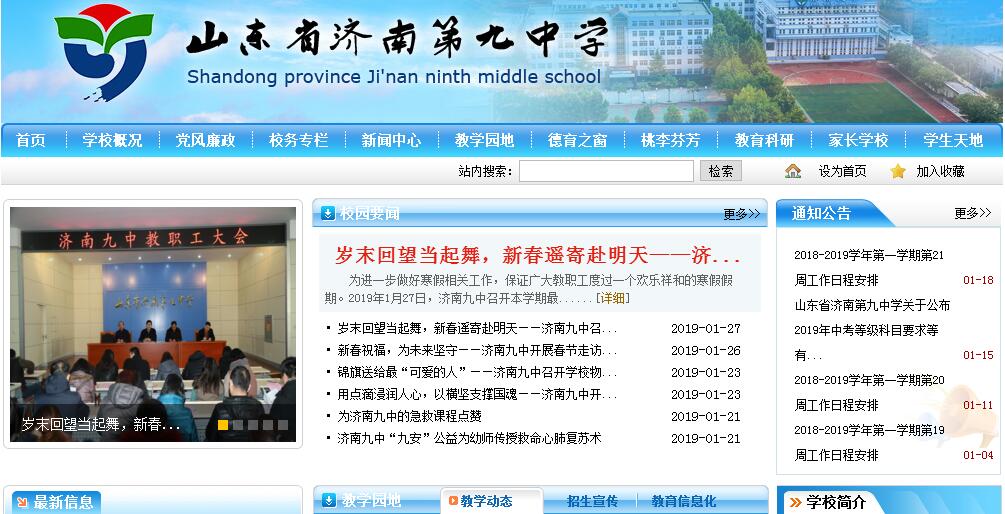 山东省济南第九中学位于济南市经十路23398号,现有43个教学班,在校学生近2000人,在职教职工186人。学校创建于1954年,六十多年的风雨砥砺,铸就了和谐昂扬的学校精神,半个世纪的岁月积淀,涵养了学校丰厚的文化底蕴。学校秉承“热爱生活,充分发展”的办学理念,以“培育现代文明中国人”为育人总目标,以培养学生做人的基本素养为基础,以“诚信立身,自信成事”为教育核心内容,为学生的成长、成人营造空间,搭建平台。这里的老师勤勉敬业,师德高尚、踏实肯干、耐心细致,他们满怀热情,用真诚的爱呵护学生;他们积极投入,用精湛的专业水平丰富学生。他们教学经验丰富,教学成绩突出,市级优质课评选一等奖以上奖项已覆盖所有学科。近几年,有200余人次在市级以上各类教学比赛中获奖;50余人分别获山东省优秀教师、山东省教学能手、济南市师德先进个人、济南市教学能手、济南市优秀教育工作者、济南市优秀班主任、国家、省、市级优质课比赛一等奖。他们关注每一个学生的成长,传人生之道,授智慧之业,解成长之惑,用朴素绚丽的生命之光照亮孩子们前行的每一个脚印。这里的学生自信向上,踏实进取。他们在丰富深厚的知识殿堂里充实自己,提高自己;他们在多彩多姿的学校课程中发现自己,发展自己;他们在异彩纷呈的校园活动中展示自己,表现自己。他们在这里感受生活,体会成长,收获成熟。三年高中生活的点滴将永远铭刻在他们心灵深处,他们用自己的成长延展着学校的未来。这里有设施齐备的现代化的实验室、计算机房,有藏书丰富的图书馆、阅览室,有完善的体育设施、田径场、篮球场、网球场,这里还有完备的闭路电视双控系统和智能化网络平台,多媒体教学系统配备到每一个教室,计算机网络覆盖全校。这里是省级规范化学校、省电化教育示范学校、国家级语言文字规范化示范校、山东省艺术教育示范学校、山东省绿色学校、山东省依法治校示范校、济南市教学示范校,是省教育厅确定的心理教育实验与研究重点实验基地、中央教科所"十五"重点课题实验基地,省教育厅高中课改定点联系学校。连续十六年被评为“市级文明单位”,2006年被评为“省级文明单位”。先后被评为“全国群众体育先进单位”“山东省思想政治工作先进单位”“山东省厂务公开民主管理工作先进单位”“山东省教育系统行风建设先进单位”,连续十年被教育局评为“学校工作先进单位”。未来不是我们要去的地方,而是我们要共同创造的地方,让我们带着对未来的期待,奔向我们共同的明天!