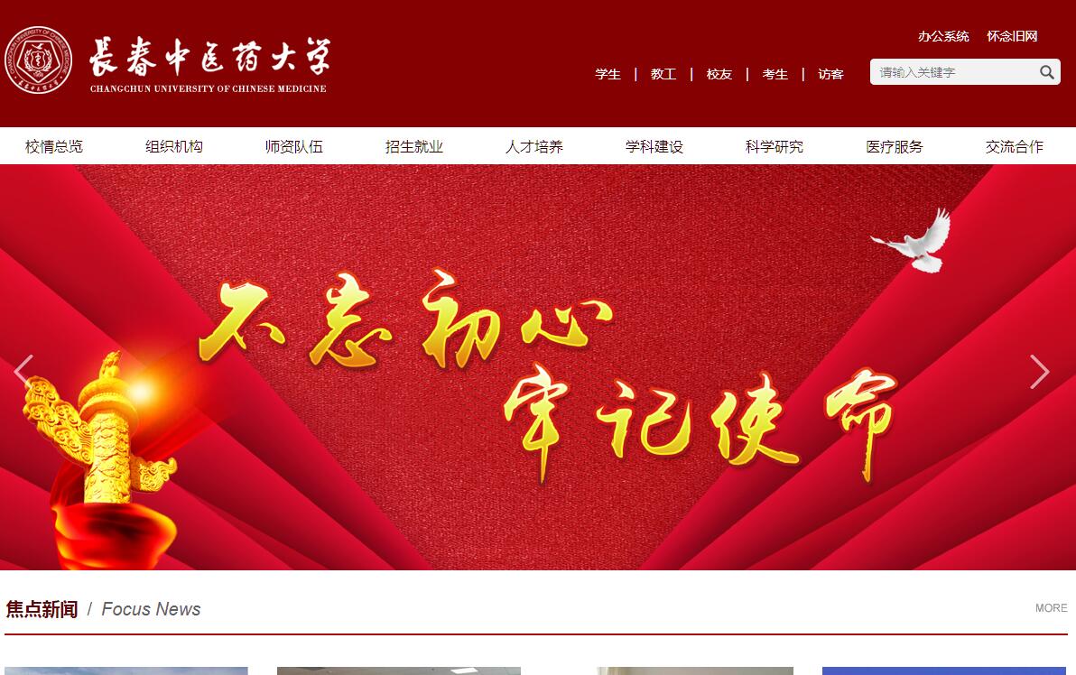 长春中医药大学始建于1958年,是吉林省省属重点大学。学校以中医药学科为主,医、工、管、法、文等学科协调发展,具有鲜明办学特色和良好社会声誉,是国家中西部高校基础能力建设工程高校。学校占地面积57.1万平方米,建筑面积39.5万平方米,教学科研仪器设备总值2.80亿元。学校现有全日制在校生11944人,其中本科生8683人,研究生1584人。教职工1092人,其中专任教师680人,具有正高级专业技术职务人员161人,副高级专业技术职务人员285人,博士生导师75人,硕士生导师445人。获评国医大师3人,获得白求恩奖章1人,国家973项目首席科学家1人,全国优秀教师4人,全国名中医2人,全国中医药高等学校教学名师2人,享受国务院特殊津贴30人,教育部新世纪优秀人才计划2人,全国老中医药专家学术经验继承工作指导老师18人。学校设有本科专业18个,一级学科博士后流动站2个,一级学科博士学位授权点2个,博士专业学位授权点1个,二级学科博士学位授权点10个,一级学科硕士学位授权点6个,二级学科硕士学位授权点38个,硕士专业学位授权点5个,现有国家中医药管理局重点学科19个,吉林省重中之重学科2个,吉林省“十二五”优势特色重点学科3个,吉林省中医药管理局重点学科19个。已形成了本科教育、研究生教育、高职教育、继续教育、留学生教育的人才培养体系,具有博士、硕士、学士学位授予权。建校以来,为国家培养输送4万余名毕业生,校友遍及海内外。学校现有国家级特色专业建设点4个,国家级专业综合改革试点专业1个,省级品牌专业建设点6个,省级特色专业8个。有国家级精品资源共享课2门,国家级精品课程3门,国家级人才培养模式创新实验区1个,主编国家级“十二五”规划教材8部,主编 “十三五”行业规划教材24部。成为国家级大学生文化素质教育基地,全国中医药文化宣传教育基地,全国科普教育基金,第一批全国中小学研学实践教育基地。学校有较强的科研实力,建立了较完备的中医药科学研究体系。现有在研国家重点研发计划项目、“973”项目、吉林省国家第四次中药资源普查项目、国家自然科学基金项目等重大重点科技项目36项;高水平科研成果524项;吉林省科技进步一等奖3项,吉林省社会科学优秀成果一等奖1项;长春国家生物产业基地医药中试平台、国家中药质量检测技术平台(北方)、长春中医药大学吉林省院士工作站、吉林省中医骨病临床医学研究中心、吉林省习近平新时代中国特色社会主义思想教育研究协同创新中心等65个国家级和省部级科研平台,走出了学研产相结合,服务地方经济社会发展的特色办学之路。学校不断拓展国际化办学视野,是教育部首批批准接收和培养外国留学生及台港澳地区学生和中国政府奖学金来华留学生接收院校,与21个国家和地区的高校、研究单位保持着长期的友好往来,开展广泛的学术交流与合作。多年来,学校建设发展得到社会各界的广泛赞誉和各级政府的充分肯定,荣获“全国文明单位”“第一届全国文明校园”称号,被教育部授予“全国毕业生就业典型经验高校”。基础医学院荣获“全国教育系统先进集体”称号;附属医院荣获“全国五一劳动奖状”“全国卫生系统先进集体”“全国援外医疗工作先进集体”等称号。面对新机遇和新挑战,长春中医药大学将继往开来,向着一流教学研究型中医药大学的目标迈进。