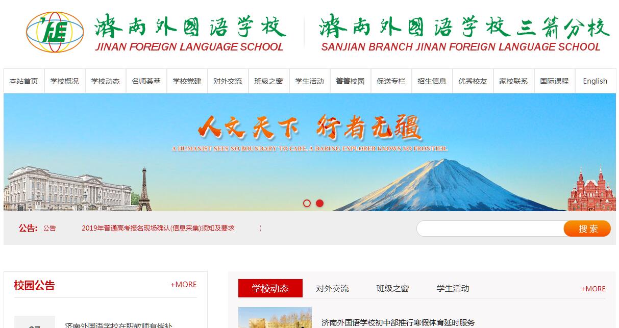 济南外国语学校创建于1989年,是山东省唯一在教育部备案的外国语学校。2001年成为教育部确定的具有向重点高校直接输送保送生资格的全国17所外国语学校之一,是一所突出外语特色、文理并重、与国际接轨的完全中学。 1996年,我校与山东三箭置业集团总公司合作创办了济南外国语学校三箭分校,系由三箭置业集团投资创办、济南外国语学校负责全方位管理的民办完全中学;2001年,我校与济南环山房地产开发有限公司合作创办了济南外国语学校开元国际分校,是一所民办全日制寄宿制小学;2004年,我校与济南外海房地产开发有限公司签署委托管理协议,负责派出教育管理人员对济南市外海实验学校实施管理。2012年、2013年和2017年,我校又先后受托管理槐荫区阳光100中学、泉新学校和历城区珑城中学、珑城小学、华山小学,均为公办义务教育学校。目前共拥有9个校区,432个教学班,在校生18400余人,是济南市基础教育管理规模最大的学校(教育集团)。学校遵循“致力于每一位学生的健康成长”的办学理念,以面向全体学生,全面提高学生素质为办学宗旨,以全面推进素质教育为主题,以提高教学质量为中心,突出外语特色优势和外向型发展态势,坚持科学发展、内涵发展、特色发展和可持续发展,努力培养具有中华根基、国际视野、跨文化交流能力的复合型后备人才。 学校树立全面的教学质量意识和课程意识,遵循面向全体、夯实基础、扎实推进、促进发展的教学指导思想,强化教学精细化管理和全程管理,不断打造富于自身特色、促进学生全面发展的学校课程体系。 学校重视师德建设和教师专业素质发展,实施“继续教育”工程,促使教师向学者型、研究型、专家型教师转变,建立了一支师德高尚、业务精湛的教师队伍。学校拥有全国优秀教师2人,省特级教师5人,省优秀教师5人,省教学能手10人,市先进工作者1人,市劳动模范1人,市拔尖人才5人,市优秀教师7人,市教学能手25人,济南市名师1人,济南市名师人选2人,市学科带头人9人,济南市优秀班主任工作室成员4人,市优秀班主任30人,省、市级优质课评比获奖者百余人。作为外国语学校,目前除开设国家规定的普通中学全部课程外,还开设了日语、俄语、法语、德语、西班牙语5个非通用语种,开设双外语课程实验项目。外语教学使用国外原版教材,采用“听说领先、读背跟进、带动写译、情景交融、实践延伸”模式,聘请外籍教师任教,实行多课时、小班化教学。学校开设A-Level、AP国际课程项目和日本关西语言学院联合培养项目、德国留学预备课程项目、俄罗斯留学预备课程项目,设有新加坡国立大学招生(SM2)项目、法国INSA招生项目、德国北威州大学招生项目,在加拿大多伦多大学,美国科罗拉多州立大学、加州大学贝克斯菲尔德分校,日本立命馆大学、同志社大学、法政大学建有绿色通道项目。作为济南教育对外开放的窗口学校,学校努力推进国际化建设,创建通向国外名牌大学的通道。学校校园文化建设凸显民族文化底色、外语学习氛围、志愿服务风尚、书香学府和绿色校园五个主题。学校注重发挥学生在德育实践活动中的主体作用,初高中现有学生社团100余个,致力于实现学生的自我管理、自我服务、自我完善、自我发展。学校积极开展对外交流与合作,与法国左拉中学、俄罗斯下诺67中学、加拿大Parkview中学、芬兰赫尔辛格中学、德国嘉德堡高中、美国康州Windsor Locks高中、日本野田学园初高中等11所学校建立友好学校关系,与德国亚琛应用技术大学,加拿大蒙特利尔商学院,俄罗斯沃罗涅日大学、伏尔加国立工业大学等国外大学签订合作协议,与法国雷恩济南友协委员会、日本九洲交通旅游局、加拿大哥伦比亚国际学院等建立合作意向。学校治学严谨,管理规范,具有良好的社会声誉。学校是全国未成年人思想道德建设工作先进单位、全国“争先创优”先进基层党组织、全国中小学外语教研工作示范学校、全国校本德育创新基地、全国诚信示范院校、全国青少年校园足球特色学校、山东省教育系统先进集体、省文明单位、省规范化学校、省教学示范学校、省中小学德育工作先进单位、省师德建设先进单位、省校本研究先进单位、省家庭教育示范基地、省国际交流和合作先进单位、省教育工会先进集体、省消防安全示范学校、省国防教育先进单位,获评山东省扶贫开发基金会“爱心团队”荣誉称号,多次被评为济南市教书育人先进单位、年度考核先进单位,党风廉政建设工作先进单位,荣获市“五一”劳动奖状。学校是国防科技大学、武汉大学、北京外国语大学、北京科技大学、西安交通大学、西安电子科技大学、大连理工大学、西南政法大学等大学的优质生源基地以及东南大学、西安交通大学少年班的生源基地。