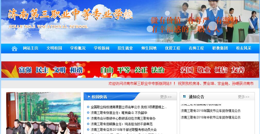 济南第三职业中等专业学校是济南市教育局直属的公办学校,建于1985年,现有三个校区(顺河校区、华山校区、玉函校区),三个教学部(高中部、职专部、教师发展事业部),在编教职工211人,在校学生2700余人。学校坚持“以人为本,和谐发展”的办学理念,确立了“培育自信、自强、自律、利他、利群,具有创造幸福能力和享受幸福能力的有尊严的体面的社会公民”的学生培养目标;以“爱生如己,教生如子,待生如友”为教师的工作原则;以“为走进三职专的每一位学生提供最适合的教育”为宗旨:不抱怨不放弃任何一名学生,把每一位学生都看成等待打磨的黄金和期待雕琢的璞玉,让每一位学生努力成功。学校建立了“以学生为主体,以活动为载体,以自成教育为主线,以发展为目的”的德育教育模式,搭建了“三节五月”自成教育平台;积极建设一支乐观、豁达、宽厚、博爱、对学生“严格要求、情爱管理”的教师队伍,倡导教师以健康的身体和积极快乐的心态工作和生活;通过开展“做一天学生”、“全员导师制”等活动促使教师更多地了解关心学生;通过追求“精导、自主、互动、训练”的建构主义绿色课堂,让教师更好地做到“以学定教”。作为“济南现代服务业职教集团”牵头学校,我校设立了会计、烹饪、导游和高星级酒店服务四个专业。加强专业建设、突显优势传统专业,在学校各项工作中始终体现各专业的重要地位。全面实行职业教育的学校与企业的双主体培养,引进名师名家,对学生进行专业指导,收到良好成效。近年来,在全国职业院校技能大赛中,获得“五金七银四铜”的优异成绩。学校先后获得了全国三八红旗集体、全国中等职业学校德育工作先进集体、全国中等职业学校德育工作实验基地、全国文明风采优秀组织奖、全国和谐校园建设典型学校、山东省精神文明单位、山东省规范化学校、山东省优质特色校、山东省职业教育先进单位、山东省廉政文化示范点、济南市五一劳动奖状、济南市家长满意学校等荣誉称号。
