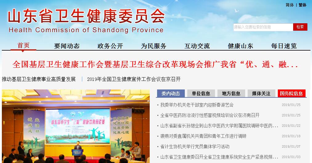 山东省卫生健康委员会主要职责:(一)贯彻执行卫生和计划生育、中医药事业发展有关法律、法规和方针、政策;起草卫生和计划生育、中医药事业发展的地方性法规、规章草案,拟订相关政策、规划,依法制定地方标准和技术规范;统筹规划全省卫生和计划生育服务资源配置,指导区域卫生和计划生育规划的编制和实施。推进卫生和计划生育服务体系建设。(二)负责制定全省疾病预防控制规划、免疫规划、严重危害人民健康的公共卫生问题的干预措施并组织实施,负责全省传染病防治及监督管理工作。协调有关部门对重大疾病实施综合防控与干预,制定全省卫生应急和紧急医学救援预案以及突发公共卫生事件监测和风险评估计划,组织和指导全省突发公共卫生事件的预防控制和各类突发公共事件的医疗卫生救援,发布法定报告传染病疫情信息、突发公共卫生事件应急处置信息。(三)负责制定职责范围内的职业卫生、放射卫生、环境卫生、学校卫生、公共场所卫生、饮用水卫生管理规范、标准和政策措施,组织开展相关监测、调查、评估和监督,负责传染病防治监督。组织开展食品安全风险监测、评估,依法制定并公布食品安全地方标准。(四)负责组织拟订并实施全省基层卫生和计划生育服务、妇幼卫生发展规划和政策措施,指导基层卫生和计划生育、妇幼卫生服务体系建设,推进基本公共卫生和计划生育服务均等化,完善基层运行新机制和乡村医生管理制度。(五)负责制定全省医疗机构和医疗服务全行业管理办法并监督实施。制定医疗机构、医疗技术应用、医疗质量、医疗安全、医疗服务、采供血机构管理规范和地方标准并组织实施,会同有关部门贯彻执行国家卫生专业技术人员准入、资格标准,制定卫生专业技术人员执业规则和服务规范并组织实施,建立医疗机构医疗服务评价和监督管理体系。负责卫生计生系统行业作风建设工作,建设和谐医患关系。(六)会同有关部门拟订社会办医发展规划和政策,鼓励社会力量兴办健康服务业。配合有关部门推进全省医药卫生体制改革、完善医疗保障体系。(七)组织实施国家药物政策,执行国家基本药物制度和国家基本药物目录,组织制定国家基本药物目录山东省药品增补目录,执行国家基本药物采购、配送、使用的管理制度,拟订全省有关政策措施。会同有关部门提出国家基本药物目录省内药品生产的鼓励扶持政策建议,提出全省基本药物价格政策的建议。(八)贯彻落实国家生育政策,完善地方生育政策,组织实施促进出生人口性别比平衡的政策措施,组织监测计划生育发展动态,提出发布计划生育安全预警预报信息建议。建立计划生育技术服务管理制度并监督实施。依法规范计划生育药具管理工作。制定优生优育和提高出生人口素质的政策措施并组织实施,推动实施计划生育生殖健康促进计划,降低出生缺陷人口数量。(九)组织推进计划生育利益导向和促进计划生育家庭发展机制,组织实施国家计划生育奖励扶助、计划生育特殊困难家庭扶助等制度,负责协调推进有关部门、群众团体履行计划生育工作相关职责,建立与经济社会发展政策的衔接机制。(十)制定流动人口计划生育服务管理制度并组织落实,健全流动人口卫生和计划生育信息共享与公共服务工作机制。(十一)组织拟订全省卫生和计划生育人才发展规划,负责卫生和计划生育人才队伍建设。加强全科医生等急需紧缺专业人才培养,建立完善住院医师和专科医师规范化培训制度并组织实施;负责配合有关部门指导本行业社会组织党建工作。(十二)组织拟订全省卫生和计划生育科技发展规划,组织实施卫生和计划生育相关科研攻关项目。参与拟订医学教育发展规划,协同指导院校医学教育和计划生育教育,组织开展毕业后医学教育和继续医学教育工作。(十三)指导市县卫生和计划生育工作,完善综合监督执法体系,规范执法行为,监督检查法律法规和政策措施的落实,组织查处重大违法行为。监督落实计划生育目标管理责任制和计划生育“一票否决”制。(十四)负责卫生和计划生育宣传、健康教育、健康促进和信息化建设等工作,依法组织实施统计调查,参与全省人口基础信息库建设。组织开展对外援助和国际交流合作,开展与港澳台的交流合作。(十五)负责全省中医药工作,拟订全省中医药中长期发展规划和政策并组织实施;继承和发展中医药文化,促进中药资源的保护、研究开发和合理利用。(十六)拟订全省保健工作规划、政策并组织实施;负责省保健委员会确定的保健对象的医疗保健工作;负责重要会议和重大活动的医疗卫生保障工作。(十七)承担省爱国卫生运动委员会、省政府防治艾滋病工作委员会、省保健委员会、省人口和计划生育领导小组的日常工作。(十八)承办省委、省政府交办的其他事项。