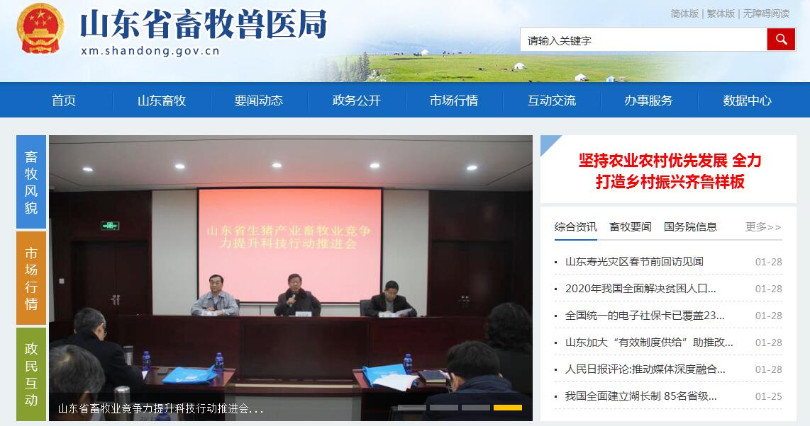 山东省畜牧兽医局主要职责:(一)贯彻执行畜牧兽医法律、法规和方针、政策;负责起草全省畜牧业地方性法规、规章草案;拟订全省畜牧业发展的规划并组织实施;负责起草畜禽屠宰地方性法规、规章草案,拟订相关规划、政策并组织实施;指导、监督全省畜牧业行政执法工作;负责畜牧业对外经济技术交流与合作。(二)负责全省畜牧业监督管理工作。指导畜牧业结构调整、标准化生产和产业化建设;负责全省种畜禽管理工作;负责奶畜饲养监督管理工作;依法指导、扶持涉牧农村合作经济组织的建设与发展;负责畜禽养殖废弃物综合利用的指导和服务工作。(三)负责全省动物防疫工作。制定全省动物疫病防治规划并组织实施;组织、指导全省动物防疫、动物及其产品的检疫监督工作;负责全省畜禽标识及疫病可追溯体系建设;负责无规定动物疫病区监督管理工作;负责病死畜禽无害化处理监管工作;负责突发重大动物疫情应急管理工作。(四)承担全省畜产品质量安全监督管理工作;负责畜禽屠宰环节质量安全监督管理;牵头负责“瘦肉精”监管工作;负责生鲜乳生产、收购环节质量安全监督管理;负责兽药、饲料添加剂等其他畜牧业投入品质量及使用的监督管理。(五)负责兽药、兽医器械监督管理工作;组织实施兽药、兽药残留限量和残留检测方法国家标准。负责全省饲料、饲料添加剂监督管理工作;负责全省草原(场)监督管理和草种管理工作;承担全省草原(场)防火工作;负责饲料、饲料添加剂、添加剂预混合饲料生产企业监督管理工作。(六)组织制定全省畜牧业科技、教育培训、技术推广规划并组织实施;组织实施畜牧业重大科研项目攻关;负责收集、发布畜牧业信息,组织推动畜牧业信息化建设,指导信息服务;开展畜牧统计、监测、预警工作。(七)负责毛皮动物养殖、胴体处置监管工作;指导全省畜牧兽医队伍建设;指导畜产品加工发展,承担省防控重大动物疫病指挥部办公室的日常工作。(八)承办省委、省政府及省农业厅交办的其他事项。