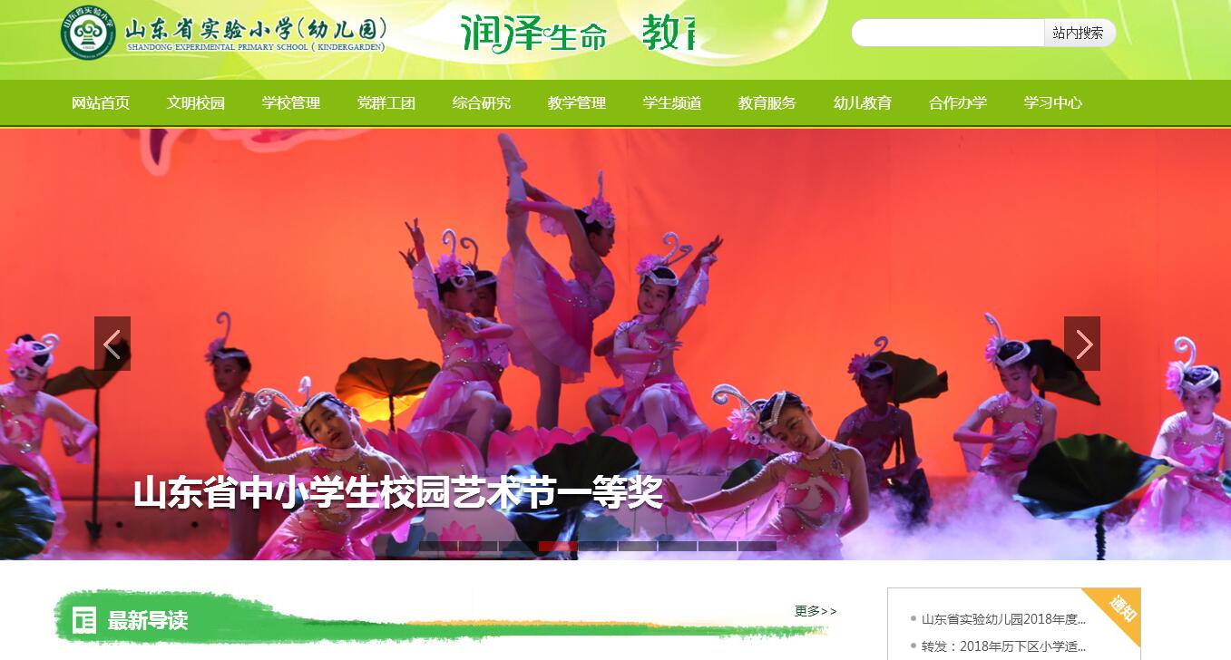山东省实验小学是山东省教育厅直属的一所省级规范化实验性学校。始建于1903年, 位于以泉水而名闻天下的泉城济南市中心,中共党的一大代表王尽美同志曾在我校以教师身份为掩护进行地下工作。著名学者季羡林和影星巩俐幼时也都曾在校就读。学校现有四个校区(含2个幼儿园),本校区占地18亩,现有教学班31个,教职工86人(其中研究生以上学历13人;高级职称8人;特级教师3 人,省市区教学能手和学科带头人20余人),在校生1400余人。学校秉持“润泽生命,教育无痕”的核心价值理念,着眼于促进师生个体生命的发展,以“德润、雅润、和润”多维培养目标打造校园文化,全面促进课程改革,教育教学成效显著。学校广泛开展教育科研和教学实验,“用技术改变教育”是学校目前开展的重点实验项目,微课程、翻转课堂和“一对一智慧学堂”电子书包项目有机融合的实践与探究已取得阶段性成果。学校重视校本课程的开发与建设,创建开设学校特色课程近40种,让学生按照自己的兴趣与需要进行选择性课程学习,使课程改革成为促进学生全面素养,提升教师专业发展的有力平台。让学校真正成为教师幸福耕耘的沃土,学生快乐成长的摇篮。学校先后荣获全国德育先进校、全国红旗大队、全国科普教育工作先进单位、山东省规范化学校、省少年儿童工作先进单位、省校本研究工作先进单位、市区教书育人先进单位等荣誉称号。多次接待美国、英国、加拿大、德国、南非、日本、香港等国内外友好学校及教育代表团的来访,是一所具有示范性、实验性的开放式学校。目前,学校正向着人文化、信息化、国际化、现代化目标发展。积淀深厚的百年老校会不断换发生命的活力,传承百年老校文化,续写时代教育篇章。