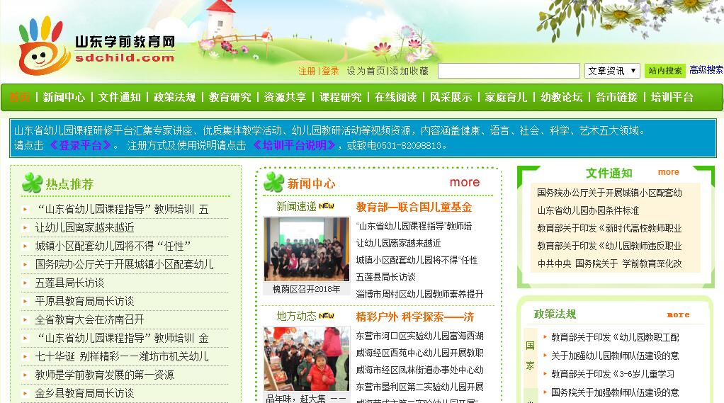 | 网站简介: 为更好地发挥山东学前教育网的作用,加强网站的建设力度、规范管理与运行,经山东省教育厅基础教育处提议,相关部门协商,山东学前教育网改由山东省教学研究室、明天出版社、山东省学前教育研究专业委员会联合主办,重新组建网站编辑队伍,改版升级山东学前教育网。作为省内学前教育的官方网站,山东学前教育网继续以全省学前教育工作者、幼儿家长为服务对象,以提供学前教育资讯、学术交流、网络互动等多项服务为办网宗旨,一如既往地为全省学前教育工作者服务。 |