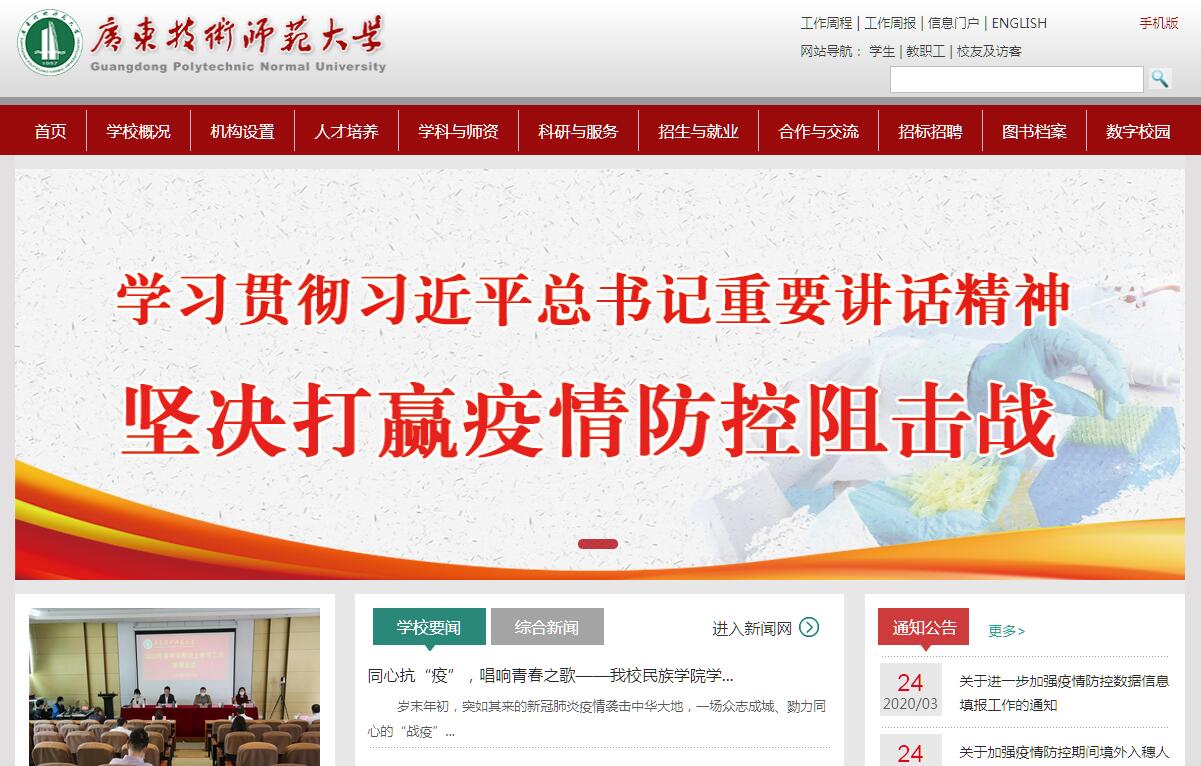 广东技术师范学院是一所具有硕士学位授予权的省属普通高等学校,全国独立设置的职业技术师范院校,首批广东省普通本科转型试点高校。学院发展历史悠久。创办于1957年,前身为广东民族学院,首任院长是著名老一辈革命家罗明同志。2002年更名为广东技术师范学院,2002年、2005年,原广东省机械学校、原广东省经济管理干部学院和广东省财贸管理干部学院先后并入。学院坐落于全国首批历史文化名城、海上丝绸之路发祥地和改革开放前沿地广州,共有校本部、西校区、北校区、白云校区等4个校区。学院学术传统深厚,崇教重学。现有工学、人文和管理等三大主要学科门类,控制科学与工程、职业技术教育学、中国现当代文学、民族学和机械工程等5个广东省重点学科。现有教育学、控制科学与工程、民族学、新闻传播学等4个一级学科硕士授权点,涵盖22个二级学科方向,教育硕士、工程硕士(电子与通信工程硕士)、会计硕士等3个硕士专业学位授权点。学院是“职业学校教师在职攻读硕士专业学位”和“少数民族高层次骨干人才计划”研究生招生培养单位,有“广东省联合培养研究生示范基地”等13个广东省研究生联合培养基地。设有20个二级学院,全日制普通在校生16916人。学院拥有64个本科专业。其中,理工科专业28个,文科36个,师范类30个。有2个国家级、8个省级特色专业建设点,1个国家级、11个省级专业综合改革试点项目,1个国家级、4个省级卓越教师培养计划项目,2门国家级、30门省级精品资源共享课程,1门国家级、2门省级精品视频公开课,4门其他省级优质课程。学院坚持立德树人,拥有一支学术水平高、在海内外影响大,爱岗敬业、结构合理的师资队伍。现有教职工1401人,其中专任教师1027人,正高职称147人,副高职称352人,副高以上职称人员占专任教师比例48.6%,具有博士学位303人,占专任教师29.5%。队伍中,有党的十九大代表、全国政协委员、国家科技进步奖获得者、国家哲学社科基金规划评审组专家、国家自然科学基金评审专家、享受国务院政府特殊津贴专家、中组部“青年千人计划”入选者,有全国优秀教师、第四届新世纪巾帼发明家优秀奖获得者、教育部高校思想政治理论课教学能手、教育部高校思想政治理论课教师年度影响力提名人物、全国高校辅导员年度人物,广东省青年珠江学者、广东省特支计划青年文化英才、会计领军人才、南粤优秀教师(南粤教坛新秀)、广东省教学名师、广东省高校“千百十工程”省级培养对象、广东省高校优秀青年教师培养对象等获得者。学院坚持产教结合、科教融合,科研水平和服务社会能力强。学院建设有2个广东省级智库(职业教育发展研究中心、民族发展研究中心),1个广东省普通高校人文社会科学重点研究基地(广东技术师范学院民族研究所)、2个广州市重点实验室(数字内容处理及其安全新技术、工业机器人驱控技术及部件)、1个广东省科技厅国际合作基地、1个广东省经信委中小微企业公共技术服务平台、13个广东省工程技术研究中心等20多个省厅级以上科研平台。近5年,学院教师获得省部级以上科研成果奖励30项,其中国家级2项。学院拥有2个国家级和8个省级特色专业建设点、14个省级实验教学示范中心、1个国家级和14个省级大学生实践教学基地建设项目、9个省级教学团队、1个省级高校教师教学发展中心等一批国家级、省级重点建设项目。与顺德区人民政府共建了“广东顺德现代职业教育研究院”、与广东省知识产权局共建了“广东技能人才知识产权实训基地”,与阳江市人大共建了“阳江市地方立法研究评估与咨询服务基地 ”,与广物汽贸股份有限公司、广东广播电视台、中兴通信等公司共建了157个校企合作人才培育实践基地,与广东工业大学共建了1个国家发改委工程实验室联合实验室。学院建设有广东工业实训中心,拥有教学科研仪器设备总值约2.11亿元。图书馆藏书约220.61万册。学院突出职教特色,服务广东经济社会。作为广东“职教母机”和职业教育研究和职教师资培养培训“重镇”,学院致力于培养高素质职业教育师资和应用型高级专门人才,发挥培养培训职教师资的母机作用,先后被国家教育部、财政部、省教育厅选定为“全国重点建设职教师资培养培训基地”“国家技能型紧缺人才培养培训院校”“国家民委职业教育师资培训中心”“广东省职业技术教育协同创新发展中心”“广东省高技能人才实训基地”“广东省中职校长培训中心”“广东省中等职业学校德育研究与指导中心”“广东省职业院校教师教学发展中心”“广东省中等职业学校教师发展中心”等。学院是广东省高等职业技术教育研究会、广东职教师资培养培训联盟、中德合作职教师资培养培训联盟理事长单位。学院人才培养成果丰硕。学院始终坚持人才培养中心地位, 2017年通过了本科审核评估。2018年1月与教育部学校规划发展中心签约成为全国首家“智慧学习工场试点高校”。近5年获广东高等教育教学成果一等奖4项、二等奖4项,学校教师参与获得国家教学成果二等奖一项。学院坚持协同育人,支持学生创新实践,学生在“挑战杯”系列竞赛、数学建模竞赛、电子设计竞赛、飞思卡尔杯智能汽车竞赛等国内外高水平学科竞赛中屡获大奖,共获国家级奖励617项、省级奖励1182项。毕业生广