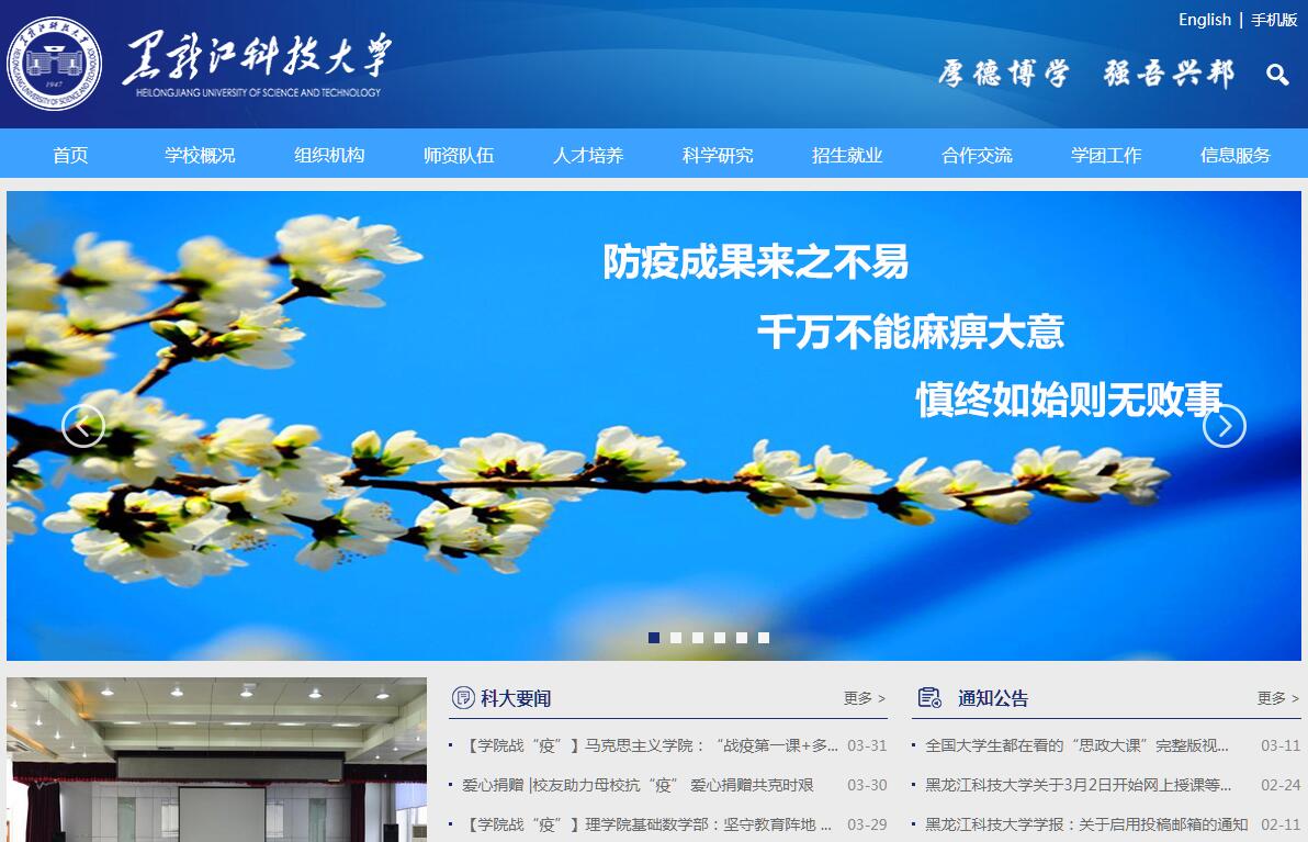 黑龙江科技大学是黑龙江、吉林乃至内蒙地区唯一一所以矿业为特色的高校,是黑龙江省人民政府与国家应急管理部(国家安全生产监督管理总局)共建高校,是国家教育部教学工作水平评估优秀高校,是服务国家特殊需求“煤矿事故应急救援与影响控制”博士层次人才培养项目的唯一一所高校,是安全科学与工程一级学科博士后科研流动站设立高校,是黑龙江“十二五”期间重点建设的特色应用型本科高校,是“矿产资源开发利用”省级特色学科项目和博士学位授权立项建设高校。在71年的办学历程中,学校始终践行“厚德博学、强吾兴邦”的校训,铸就了“自强不息、创业创新”的学校精神,培养出了10万余名优秀人才,为区域经济和我国煤炭工业的发展做出了突出的贡献,被誉为“煤炭工业的脊梁”。学校前身是中国共产党1947年在鸡西建立的东北第一所煤矿工人干部学校。1954年与鹤岗煤矿学校合并成立鸡西煤矿学校。1958年在此基础上成立本科教育鸡西矿业学院。1964年因院校调整又改为鸡西煤矿学校。1978年复建本科教育鸡西矿业学院,1981年改称黑龙江矿业学院,隶属于原国家煤炭工业部。1998年划归地方,实行中央与地方共建、以黑龙江省管理为主的体制。2000年更名为黑龙江科技学院。2013年更名为黑龙江科技大学。学校坐落于冰城夏都哈尔滨市的松花江畔,办学历史悠久,文化底蕴深厚。71年的发展历程谱写了一部艰辛的创业史,学校因煤而生、依煤而长。边陲煤城办学56载,几代科院人凭借北大荒精神、铁人精神、煤矿工人特别能战斗的精神,始终以服务煤炭为已任,甘守清贫,艰苦创业,献身煤炭,为国家煤炭工业和区域经济社会发展奉献了全部的青春和热血。1997年学校顺利通过了国家教学工作合格评价,办学水平、办学特色得到专家组的一致好评。第二部曲——二次创业,跨越发展。为更好地为国家煤炭工业和区域经济社会发展做贡献,学校抢抓高等教育迈向大众化的战略机遇,于2001至2003年白手起家在哈尔滨建设新校区。历尽千辛万苦,攻坚克难,用“泪水、汗水和血水”在一片废墟上建起一座现代化的新校园。2003年8月,学校主体由鸡西市迁入哈尔滨市,实现了办学空间的跨越。以新校区建设为契机,实施学科专业建设工程和人才强校战略,2003年获得硕士学位授予权,实现了办学层次的跨越。2004年以来,实施内涵发展和特色发展,2008年在国家教学工作水平评估中获得“优秀”,2010年被确定为黑龙江“十二五”期间重点建设的特色应用型本科高校,2012年获得服务国家特殊需求的“煤矿事故应急救援与影响控制”博士人才培养项目,2014年获批安全科学与工程一级学科博士后科研流动站,2017年获批“硕士研究生推免权”、“矿产资源开发利用”省级特色学科项目和博士学位授权立项建设单位,为学校的发展注入了新的生机与活力。“十三五”开局之际,学校科学确立了应用型的办学定位、“立足应用,精准育人”的办学理念,绘就出创建特色鲜明的高水平应用型科技大学的长远发展蓝图和“百年名校”的宏伟目标,汇聚全校合力,聚力转型发展,激发办学活力。学校不断积淀和创新,已经发展成为一所工学、管理学、经济学、理学、法学、文学多学科协调发展的普通高等学校,形成了“一校两地三校区”的办学格局。学校以立德树人为根本任务。坚持“育人为本、德育为先,以学为要、固基强实”的思想和“以生为本、为生尽责”的服务理念,以立足应用的教学理念为引导,以学生成长成才需求、地方经济与行业发展需求为导向,遵循教育教学规律与人才成长规律,努力培养“思想道德素质高、工程实践能力强”的高素质应用型人才,人才培养质量不断提高。现有全日制在校生21939人,其中研究生、博士生803人。“十五”以来,本科生一次就业率在90%以上,连续保持省内高校前三名,被教育部授予“全国毕业生就业50强高校”、“全国青年就业创业教育先进集体”。在全国、全省大学生标志性竞赛中,获奖数量和层次居于省内高校领先水平。学校坚持以教育教学为中心。坚持应用型的办学定位,不断深化教育教学改革,科学构建符合经济社会发展需求的应用型人才培养体系,实施产教融合、校企协同育人的人才培养模式,教育教学水平不断提升。现有57个本科专业,其中国家特色专业建设点4个、省重点专业10个。建成1门国家级精品课、14门省级精品课。建成2个国家级大学生校外实践教育基地、1个省级人才培养模式创新示范区、1个省级虚拟仿真实验教学中心、1个升级示范性虚拟仿真实验教学项目、4个省级实验教学示范中心、2个振兴东北老工业基地人才培训中心、1个国家煤矿安全培训基地。学校坚持以学科建设为龙头。围绕区域、行业和国家发展需求,按照学科链与产业链相协调、产学研有机结合的思想,不断优化与整体架构以矿业为特色、多学科协调发展的学科体系。“十二五”期间,建有“煤炭产业”省级重点学科群,“矿业工程、电气工程、机械工程”3个省重点学科。拥有1个服务国家特殊需求博士人才培养项目,1个博士后科研流动站,10个硕士学位授权一级学科,具有工商管理硕士(MBA)、会计硕士、金融硕士授予权和7个工程硕士授权领域。建有国家级中心实验室1个、省重点实验室4个、省高校重点实验室2个、国家安全科技支撑平台1个、省