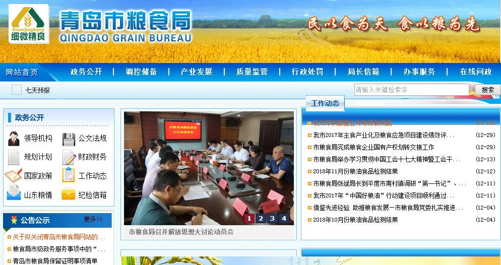青岛市粮食局主要职责:(一)贯彻执行国家粮食流通、粮食储备等方面的方针政策和法律、法规;拟订全市粮食流通、粮食储备等方面的政策,起草有关地方性法规、规章草案。(二)提出全市粮食宏观调控、总量平衡以及粮食流通的中长期规划和市级储备粮的收储、动用建议并组织实施。(三)承担粮食监测预警和应急责任,负责全市粮食流通宏观调控的具体工作;指导协调粮食购销有关工作;保障军队和城乡居民、灾区、缺粮地区的粮食供应,安排以工代赈和国家重点建设项目的粮食供应。(四)承担市级储备粮的日常监管责任;会同有关部门提出市级储备粮的规模、品种、布局建议和收购、销售、储存、轮换计划并组织实施;指导全市粮食储备体系建设。(五)拟订全市粮食流通设施建设规划并组织实施;指导全市粮食物流和粮食市场建设;会同有关部门依法对粮食市场进行监管,维护正常的粮食流通秩序。(六)承担全市粮食流通监管责任;制定粮食流通、粮食库存监督检查制度并组织实施;负责全市粮食质量安全监测体系建设;负责粮食收购资格的审核认证及监督管理。(七)负责全市粮食流通的行业管理;拟定全市粮食流通产业发展规划;指导粮食流通科技进步和粮食产业化经营;开展粮食流通对外交流与合作。(八)指导、监督全市粮食财务、审计工作;参与粮食储备费用的核定和风险基金的管理。(九)承办市委、市政府交办的其他事项。