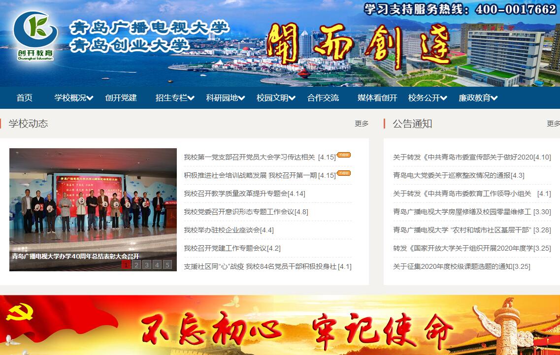 青岛广播电视大学始建于1979年,是青岛市唯一一所经国家教育部批准开展开放教育,致力于满足全民学习、终身学习需要和建设学习型社会的新型高等学校。多年来,学校坚持办“市民身边的大学”的办学宗旨,坚持多元开放的办学格局,逐渐走出了一条以开放教育、创业教育、社区教育为主,学历教育和非学历继续教育深度融合的新型大学之路。学校现有金水路、大连路和泰山路三个校区,同时下设崂山、城阳、胶州、黄岛、即墨、平度、莱西、直属等10余所分校、教学点,并依托海信集团、海尔集团、南车集团等企业建成了首批7个国家开放大学(青岛)学习中心,形成了覆盖青岛城乡的现代远程教育网络。一、坚持科学定位,走有青岛特色开放教育的办学之路。学校开放教育共设本、专科专业58个,已形成相互渗透、协调发展的专业结构,经国家开放大学批准具有学位授予权,目前在校生3万余人。2012年7月,国家开放大学正式揭牌成立,青岛广播电视大学成为首批成立的国家开放大学分部。2014年7月,国家开放大学海洋学院依托我校成立,彰显出青岛海洋教育特色。二、打造“东方创客摇篮”,为青岛市“三创”战略增添新的活力。2015年4月,青岛市编委办正式批复我校加挂青岛创业大学,实现了青岛广播电视大学与青岛创业大学一体化办学,2016年市政府正式确定由青岛创业大学承担全市创业教育培训工作。学校已在全市范围内建成了多个区市教学点和驻青高校教学点,累计培训大学生5万余人,为青岛市培养了一大批创新创业人才。学校自主建设了网上创业大学—头客网,实现了线上与线下相融合的教育模式,搭建了全方位的创业教育体系。学校不断探索具有青岛特色的创业教育,实行“大众普惠+创业精英”的办学理念,搭建“选—育—助—推”的创业人才培养模式,构建“1+X”(即1门通识课加自主选修课)的先进课程体系。面向中小学生、大学生、大众创业、精英创业等各类人群开展“有教无类、因材施教”的创业教育和创业孵化,必将以真招实举服务创业、助力创客、推动创新。三、着力推进学习型社会建设,办“市民身边的大学”。学校坚持走密切服务青岛市经济社会发展之路,积极推进学习型社会建设,构建终身教育体系。2016年,学校被青岛市正式赋予青岛社区大学的教育功能,全力开展以学分银行为载体的社区教育工作,学校坚持“教育即生活”的办学宗旨,坚持寓教于乐、服务社区居民的办学方向,为满足青岛市居民的学习需求提供多样化保障。社区大学以大连路校区为主阵地,初步构建了社区大学、社区学院、社区学校和学习中心四级社区教育体系。根据居民的学习需求,开展茶艺培训、阳台种植、创意工坊、模拟驾驶、育婴师、烘焙烹饪等多种体验活动,打造“人人皆学、处处可学、时时能学”的社区教育新名片。同时建成集学习、服务等功能一体的全民学习网,为全市社区居民提供有益身心健康和提高生活品质的学习内容,全民学习网将发挥现代化网络的优势成为推动青岛学习型社会建设的重要载体。四、不断加强学分银行建设,搭建终身学习的“立交桥”。2012年6月,教育部正式委托国家开放大学开展学分银行项目,2013年8月,我校首批成为国家开放大学学习成果认证中心。学校致力于促进全民终身学习,建成具备学分认证、转换、存取等功能的学分银行系统,为每个学习者建立个人终身学习档案。学习者可以按照学分累积规则,零存整取并申请获取相应证书。学分银行灵活借鉴货币银行储蓄功能及特点,鼓励市民通过各种形式的学习累积学分,旨在构建终身教育体系,搭建终身学习“立交桥”,使各级各类教育纵向衔接、横向沟通,成为全面推进青岛市终身教育体系建设的重要载体和平台。五、大力发展非学历继续教育,实现“把大学办在社会中”。多年来,学校在促进新型大学自身建设的同时,不断提升服务于青岛经济和社会发展的能力,学校承办的“青岛干部网络学院”有力助推了青岛市基层学习型党组织建设,收到广泛好评;连续多年开展的教师培训、农民创业培训、专业技术人员继续教育培训、基层妇女干部培训、军转干部创业培训等各类培训达到一年四万人次。学校金水路校区北邻世园会,东靠蓝色硅谷核心区,地处青岛市教育科研聚集区,人文科研气氛浓厚。学校交通便捷,东距滨海大道1公里,紧邻正在建设中的城际轻轨站点;西到火车北站14公里,距流亭机场22公里,紧邻青岛地铁M2线李家上流站,待地铁开通后将形成立体化交通。金水路校区共有大、中、小型会议室100余个,建有培训寄宿楼2座,共324个标准间,餐饮中心可同时容纳800人就餐,并配有室内健身房和咖啡厅等公共活动区域,为学员提供一站式的“生活+学习”服务。面向未来,青岛广播电视大学(青岛创业大学)将依托大连路校区开展社区教育,打造青岛市“社区教育旗舰店”,依托金水路推进创业教育,搭建“东方创客摇篮”,依托泰山路校区建设创业孵化基地,为实现学校东西连轴,辐射半岛,更好搭建终身学习“立交桥”的办学目标不断开拓新局面。