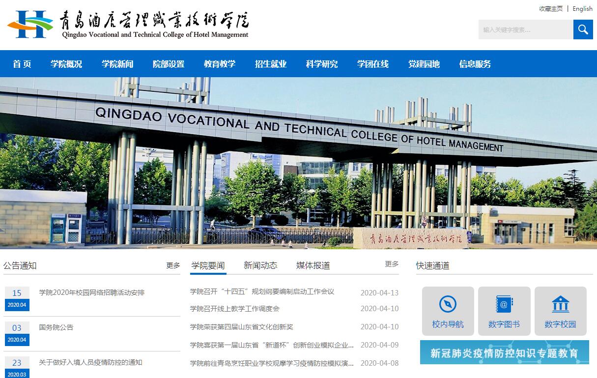 青岛酒店管理职业技术学院坐落于素有“红瓦绿树、碧海蓝天”之称的中国最美海滨城市、中国最宜居城市——青岛,是经教育部批准成立的省属公办全日制普通高校。学院办学历史可追溯到1945年成立的私立青岛商科职业学校,经过几代人的不懈努力和矢志追求,2002年在山东省青岛商业学校和山东省饮食服务技工学校基础上创办青岛酒店管理职业技术学院。学院是我国第一所独立设置的酒店管理职业技术学院,是山东省首批特色名校、山东省首批优质高等职业院校、青岛市首批品牌高职院校、教育部第一批教育信息化试点单位,也是“全国职业教育先进单位”“山东省职业教育先进单位”“省级文明单位”“青岛市文明校园”。学院是一所特色鲜明的现代服务业高职院校,设置有旅游与酒店管理学院、工商管理学院、酒店工程学院、信息工程技术学院、烹饪学院、艺术学院、基础教学部、思想政治课教学部8个二级院部,开设有酒店管理、旅游管理、烹调工艺与营养等37个专业,全日制在校生14000人。其中,全国职业院校示范专业点2个,中央财政支持建设专业2个;专本贯通分段培养专业2个,省级示范专业2个,省级特色专业7个,省级重点建设专业10个,省级品牌专业群2个;国家级现代学徒制试点项目1个,省市级现代学徒制试点项目7个,牵头开发省级教学指导方案7个;青岛市高职重点建设专业6个;山东半岛专业办学联盟1个,青岛市中高职专业办学联盟2个。旅游专业大类办学实力连续六年排名省内高职第一。学院师资力量雄厚、结构合理,现有教职员工650名,其中拥有副高以上职称教师220名,“双师型”教师占90%以上。其中教育部职业教育教学指导委员会专家3名,省级教学指导委员会专家9名,全国青年岗位能手3人,山东省教学名师3人,省级教学团队5个,省级青年技能名师4人,省级职业教育名师工作室2个,省级职业教育技艺技能传承创新平台2个,青岛高校教学名师6人,山东省先进工作者1人、旅游教育名师1人、旅游教育杰出青年教师1人、青岛市劳动模范2人、青岛市会计领军人才1人。 学院大力推进课程、实践教学条件建设,建有国家在线开放课程2门,省级以上精品课程37门,省级精品资源共享课7门,省级教学资源库2个,青岛市首批现代学徒制特色课程4门;拥有国家教学成果奖1项,省级教学成果奖13项,省级教改立项25项;省级及以上优秀或规划教材22本;中央财政支持实训基地1个,省级重点实验实训室1个;拥有9个类别的职业技能培训和鉴定基地,建有青岛市国家职业鉴定九所和国家邮政局快递职业鉴定中心等技能鉴定考点和中心,能进行31个工种的技能考核,基本覆盖了所有专业;拥有各类生产型实训室72个。学院重视学生技能培养,2012年以来,累计获得烹饪、中英文导游、中餐宴会设计、西餐宴会设计等4个国赛项目一等奖20个,获得烹饪赛项、中餐宴会设计赛项全国一等奖第一名。累计获得省市级、行业协会等各类职业技能大赛一等奖(金牌)100多项,涵盖了旅游、酒店、烹饪、信息技术、英语、创业教育等10余个专业领域。学院坚持开放办学,全面推进国际化办学工作。学院是全国首批“中美高素质技能型、应用型人才联合培养百千万交流计划”项目院校,与加拿大卡纳多学院、澳大利亚南澳TAFE学院、台湾高雄餐旅大学等10个国家和地区的20余所院校、16个教育机构建立合作关系,广泛开展师资交流、学生交流、境外实习、外籍教师引进、优质教育资源引进等工作,2017年被评为全国“高等职业院校国际影响力50强”,2018年被评为“亚太职业教育影响力50强”,荣获世界职业院校与技术大学联盟卓越奖。学院科研和社会服务能力显著增强,举办有2个全国高等职业学校专业骨干教师培训项目、4个省级骨干教师培训项目;建设有国家科技部“海斯曼”创客岛众创空间;山东社科基金项目、山东省哲学社会科学规划项目、国家旅游局专项等国家、省市级科研课题96项;与李沧区人民政府和青岛市旅游局签署了全面战略合作框架协议,助力区域经济社会发展;自主开发《山东省社会导游员管理体系标准》《鲁菜标准化工艺流程》等行业标准5项,制定青岛市智慧旅游企业建设标准文件3项;牵头组建青岛市旅游智库,为区域产业发展贡献智慧力量;政行企校共建“山东省研学旅行研究院”,推进人才培养、专业建设和服务社会良性互动。学院学生素质教育体系完善,坚持以人文素质教育为主线,用中华美德引领立德树人、文化育人教育实践,将职业素质养成教育渗透到课堂教学和日常育人的过程中,增强人文情怀,拓展知识视野,塑造健康人格,着力培养具有良好现代服务理念、创新意识和国际视野、富含文化底蕴并拥有“绅士风度、淑女风范”良好气质的职业化人才。近年来,学生整体就业率均在95%以上,用人单位对学生的满意度超过了98%。学院校园文化建设特色鲜明,坚持以“文化引领、品牌引领”作为校园文化建设总体思路,以建设特色校园文化为核心,以坚持文化育人为重点,以促进学院的整体发展为目标,经过多年的文化积淀,确定了“勤、真、灵、雅”的校训、“爱心、实力、责任”的校风,打造和传播“微笑文化”,形成了特色鲜明的校园文化生态。近年来,学院各项工作取得了显著成绩:顺利通过了山东省高职高专院校人才培养工作水平评估、全省高职院校人才培养工作