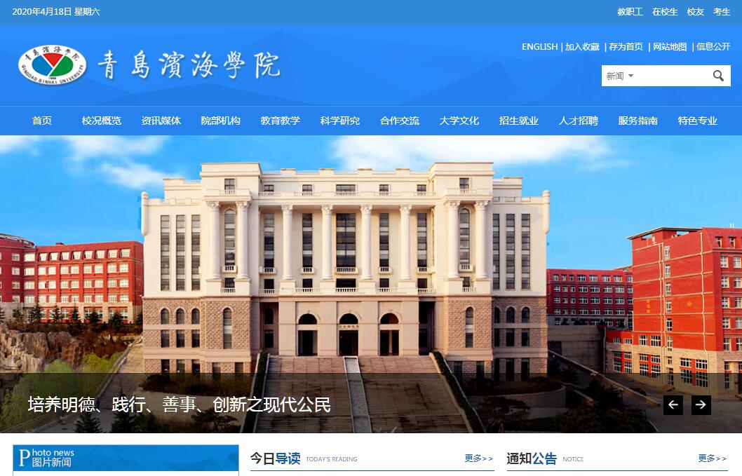 青岛滨海学院始建于1992年,2005年升格为山东省首批民办本科高校,2009年具备学士学位授予权,2017年获批成为硕士学位授予立项培育建设单位。学校设立文理基础学院、大专文理基础学院、商学院、信息工程学院、机电工程学院、外国语学院、国际合作学院、建筑工程学院、酒店管理学院、教育学部、医学院、艺术传媒学院和思想政治理论课教学科研部等教学单位。共开设43个本科专业、29个专科专业,涵盖文、理、工、管、经、艺、医、教育等学科门类。现有全日制在校生19000余人,其中外籍留学生100余人。学校是建国后山东省首所民办高校,秉承“以兴教育才为己任,以利民报国为目的”办学宗旨、“要学做事,先学做人;人人有才,人人成才”育人理念、“有利于社会进步,有利于学生成才,有利于学校(教师)发展”做事准则、“严、精、实”做事标准、“培养明德、践行、善事、创新之现代公民”育人目标。学校已顺利通过教育部本科教学评估,获批硕士学位授予立项培育建设单位、国家级大学生校外实践教育基地项目、教育部本科专业综合改革试点项目和国家自然科学基金委员会青年科学基金项目;学校是山东省首批民办本科高等教育特色名校建设高校和山东省民办高校优质特色发展项目支持计划高校,被评为山东省文明校园、德育优秀高校、企校合作先进单位和全国德育先进典型、全国就业示范高校、全国十大最具影响力民办大学、中国民办高等教育优秀院校、中国十大品牌民办高校、教育部应用技术大学战略研究改革试点院校、全国高校毕业生就业50强高校。学校位于国际滨海旅游度假胜地、中国最具幸福感城市——青岛市西海岸新区中心,山海相间,气候宜人,空气清新,宜学宜居,距火车站仅15分钟车程。占地1200余亩,建有64栋大楼的功能楼群,建筑总面积72.7万平方米,教学仪器设备总值1.77亿元,总资产42亿余元;现有图书馆3座,纸质藏书198.9万册,电子图书140余万种(16TB),阅览室座位5132个;有多媒体教室和语音教室座位17873个;有多媒体教室和语音教室座位17873个;有200人以上座位学术报告厅6个和1600座的礼堂1个;建有13个实验(实践)教学中心,10个校企一体化实体校内实习基地和132个校外实习实训基地;建有1.35万平方米的母婴护理实训中心、4.3万平方米的国际学术交流中心(五星级珠山大饭店)、青岛市建设标准最高的实验室——精准医学与保健研究中心;占地226亩、总投资20亿的三甲标准青岛军民融合医院(青岛滨海学院附属医院)建设正在加紧推进,学校大珠山校区正在依规划加速建设步伐;有综合运动场2个,篮球场15个,网球场3个,排球场8个,羽毛球场12个,室内体育馆1个,25m×50m泳池游泳馆1个,形体训练厅1个;建有1.4万平方米的世界动物自然生态博物馆,内设陶瓷馆、中外油画馆、中国字画及根雕馆、科技馆、校史馆、教育史馆、宇宙馆、世界动物标本馆,海洋馆,为国家AAAA级旅游景区、国家级科普教育基地、山东省四星级科普教育基地、青岛市生态文化科普教育基地;校内建有四个人工湖,春来垂柳绕湖,夏来荷花满塘,秋来丹桂飘香,冬来冰瀑悬挂。春和景明,迎春花、芍药花、杜鹃花、樱花......姹紫嫣红,校园如画。学校着力构建教师人才高地,现有专任教师1142人,其中高级职称456人,有博士、硕士学位者932人,硕博教师已占教师总数的81.6%,另有外籍教师14人。着力加强专业课程建设,已建成省级特色专业5个,省民办本科优势特色专业6个,市校共建专业4个,市重点建设学科和专业群2个,省级实验教学示范中心1个,省级精品课程21门;学校累计已向社会输送9万余名合格毕业生,根据山东省人社厅2009年以来的通报,学校毕业生正式就业率始终位列全省本科高校前茅,2013年跃居全省58所本科高校第一名;2015年,被教育部评为“全国高校毕业生就业50强高校”。 2009年青岛市政府首次评选十佳大学生创业明星中,滨海学院就有3名学生当选,以后每届评选均榜上有名。学校本科生考研报考录取率连续五年突破45%,其中清华大学等名校录取率达35%。始终秉承以德立校、立德树人,学校“以德立校经验与启示”被《人民日报》、《光明日报》、中央电视台等媒体广泛宣传报道;创立学分学绩制,学生可以自主选择专业、课程、教师、学习年限,修满规定的学分、学绩后可提前毕业;学校拥有省级工程技术研发中心1个,省级重点和示范实验室各1个,省级研究中心5个,建有大学物理、电工电子、工科基础、金属材料、工科训练、经济管理、大众传媒、信息技术、国际语言文化、医学护理、学前教育等实验(实践)教学中心;打造了机电工程、土木工程、广电传媒、医学护理、学前教育、电子商务、旅游管理、动漫艺术等专业“学产研”教学实体;注重通识教育,强化人文基础、普通话演讲训练、计算机操作及打字、办公自动化、外语听说等公共技能训练,经考核合格方能毕业;学校为全国英语四六级、专业英语四八级、专业日语四八级、HSK中国汉语水平、国家普通话推广、计算机等级考试考点,学生校内可直接考取职业资格证书;学校设有青岛市大学生创业孵化基地,连续三年被青岛市授予“创业教育最佳教学点”。学校致力建设开放的国际化大学,国际合作交流项目稳步增长,先后与30多个国家与地区的120多所大学及科研机构开展友好交流合作,与美国圣道大学、俄罗斯
