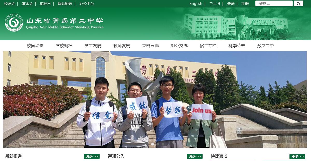 | 网站简介: 山东省青岛第二中学,坐落于青岛市崂山区松岭路70号,背依崂山,南临黄海,总建筑面积6万多平方米,单体建筑17个。学校创建于1925年,原名为“胶澳商埠公立女子中学”,1950年秋改名为“山东省青岛第二中学”。截至2013年,历年的入学录取成绩、高考成绩、竞赛成绩都保持青岛市第一,被公认为青岛最好的高中。学校在教学成绩、师资力量、学校硬件等方面在山东省都位居前列。山东省青岛第二中学先后被评为山东省重点中学,山东省规范化中学,省级文明单位,全国健康绿色学校先进学校,2014年成为中国大学先修课程项目首批64所试点学校之一。知名校友有王涛、修瑞娟、孙明漳等。 |