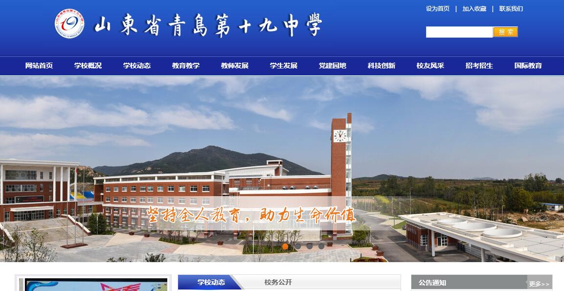 山东省青岛第十九中学始建于1956年,老校址位于台东,现有36个高中教学班。六十年风雨积淀,形成了以人为本、和谐发展、务实求真、开拓创新的文化传统;自上个世纪八十年代崛起,以优秀的教育教学质量闻名岛城,为高校和社会输送了大批人才。2011年起,学校率先承担了青岛市“小班化”教育试点,引领高中教育发展趋势。四年的实践,成效突出,先后被省、市多家媒体报道,赢得了较高的社会声誉。学校先后获得全国优秀家长学校、山东省办学水平督导评估优秀等级学校、省学校民主管理先进单位、省绿色学校、省国防教育先进单位、省卫生先进单位、省首批示范食堂、青岛市普通高中教育教学质量督导评估优秀等级学校、市文明单位标兵、市平安和谐校园等100多项荣誉。现为全国中学生数学联赛先进学校、信息技术奥赛先进单位、生物奥林匹克竞赛优胜学校、全国高中化学课改实验基地,中国政法大学、山东大学、大连海事大学等高校优秀生源培养基地。近年来,青岛19中着力打造科技创新人才培养特色,提出“打造以培养学生科技与人文创新素质为办学特色的岛城一流、省内领先、全国知名的现代化、国际化中学”的办学目标,恪守“坚持全人教育,助力生命价值”的办学理念和“健全人格、健康体魄,彰显素质、彰扬个性”的办学定位,着力培养学生具有传统道德、现代观念,爱国之情、报国之志的中国心,具有敬畏生命、确立信仰,追求理想、完善自我的人文情,具有敢于质疑、勇于求异,善于探究、勤于实践的原创力,具有全球理念、国际视野,世界标准、民族意识的环球观。为扩大优质高中办学资源,青岛市政府决定在蓝色硅谷新建青岛十九中,2016年9月正式启用。今年招收的2016级新生,将全部到新校上课。新校位于即墨市鳌山卫镇卫场路69号,鹤山路以南,新河庄以西,大任村以北,凤凰山以东,是蓝色硅谷核心区重点建设项目。占地面积约254.4亩,规划为60个教学班,按功能分为综合教学区、国际交流区、生活服务区、综合运动区,建有综合教学楼、科技楼、办公楼、艺术楼、国际部综合楼、餐厅楼、学生公寓、专家公寓、体育馆、礼堂等,建筑面积约10.8万平方米,是老校区的12.8倍。青岛19中新校建筑凸显沿海开放城市东西方文化交融的鲜明特征,红砖、幕墙、承柱、连廊,在简约的美式校园风格中,内部空间设计充分尊重师生学习生活习惯,以便捷、舒适、自然、环保为出发点,将教学与实验融合、交流与学习融合、欣赏与体验融合、运动与休闲融合、生活与创意融合,使空间传达现代教育理念,让科技融入办学特色。蓝色硅谷包括国家深海基地、海洋科学与技术国家实验室、国家海洋局第一海洋研究所、山东大学青岛校区、哈工大青岛科技园、天津大学青岛研究院、中德新能源与环保科技研究院等高等院校与科研院所。与同期建设的城际轻轨、医疗机构、科研产业园区及商业休闲配套设施将共同构建青岛海洋科技新城区。新校坐拥蓝色硅谷丰富的科技教育资源,为打造科技创新人才培养特色创造了条件。青岛19中将以创新素质培养为核心,建设“科技见长、人文创新”的特色化、现代化、国际化高中。办学优势:1.笃学敬业的师资队伍:学校拥有一支“境界高远、师德高尚、能力高强、学识高深、言行高雅”的教师团队,坚持全面育人,关注个性发展,为学生一生幸福奠基。学校现有教职工173人,其中特级教师2人,高级教师45人,中级教师68人,省、市级优秀教师、教学能手、学科带头人、专业技术拔尖人才80余人,硕士研究生40人,年龄结构合理,教学经验丰富。学校实施“名师工程”,“青蓝工程”,落实教师专业发展规划,每年60多名教师进行国内外培训,为教师成长搭建平台。语文、数学、政治、生化等教研组被评为青岛市优秀教研组,政史地教研组被评为青岛市巾帼文明岗,5名教研组长被青岛市教研室聘为高考研究“7+1”小组成员。2.小班化教育领先趋势:作为首批小班化教育改革学校,小班化教学成效显著。从教学过程看:拓宽学生的活动空间,丰富课堂教学组织形式,强化积极的人际互动,关注学生的个别差异;从教学结果角度:培养不同层次学生的学习兴趣、习惯和能力,激发主动探究的欲望,得到教师个性化关注,充分享受各种教育资源;从学生发展看,建立“全员育人导师制”,教师关注每位学生,任课教师成为学生导师,关注学业进步与心理成长,人人体验到成功与进步。小班化教育实施以来,得到市教育局等各级部门的良好评价,新华网、光明网、半岛网、青岛新闻网、青岛电视台、齐鲁电视台、《半岛都市报》、《青岛晚报》、《青岛早报》等媒体进行了报道,省内外多家教育机构来我校交流、考察。3.优质高效的课堂教学:学校坚持科研引领,深化教学改革,率先实现分层分类选课走班,满足不同潜质学生发展需要。以“走向智慧化教学”为主线,以“电子书包”等信息化手段为支撑,实施学案导学,倡导“自主合作探究式学习”,师生共建“生本、生态、生命”课堂。形成了“五环节教学模式”等适合学情、高效实用的课堂教学模式,如语文组阅读实验计划,数学组几何画板教学,英语组情境对话教学,生物组三问教学法,政治组多元立体教学法、历史组课堂人际互动教学法等。学校承担教育部课题《基于现代教育技术小班化课堂教学教