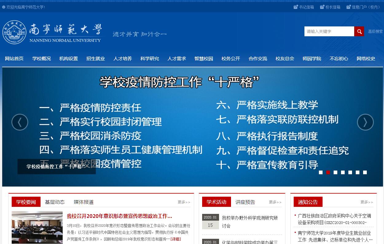 南宁师范大学位于广西壮族自治区首府南宁市,是自治区人民政府举办的本科师范院校。南宁地处亚热带、北回归线以南,是北部湾城市群核心城市、中国面向东盟十国国际大通道、西南出海综合交通枢纽城市,国家“一带一路”海上丝绸之路有机衔接的重要门户城市,是全国文明城市,这里满城皆绿、四季常青,被誉为“中国绿城”。南宁师范大学的五合、武鸣、明秀、长岗四个校区就坐落在南宁的绿地青山之间,占地面积共3476.68亩。学校图书馆藏书201.4万册,另有电子图书266.5万种,合作举办1所独立学院。是国家中西部高校基础能力建设工程(二期)项目学校,全国第二批深化创新创业教育改革示范高校,教育部数据中国“百校工程”项目试点学校,教育部本科教学工作水平评估优秀学校,中国科学院地理科学与资源研究所和国家精准扶贫工作成效第三方评估组委托的学校,部属重点院校西南大学对口支援学校,广西新增博士学位授予单位立项建设单位。先后获得全国民族团结进步先进单位、国家级语言文字规范化示范学校、全国学校体育卫生工作先进单位、全国群众体育工作先进单位、全国高校军训工作优秀学校、全国学校艺术教育工作先进单位、全国志愿助残示范基地等荣誉。砥砺奋进的发展历程。学校前身为创办于1953年10月的广西中等学校教师进修学院,同年12月改名为广西教师进修学院;1960年7月更名为南宁师范学院,同年9月并入广西民族学院,1961年9月恢复广西教师进修学院;1966年7月更名为广西教育学院;1978年12月举办全日制普通本科教育;1979年2月更名为南宁师范学院;1985年5月改名为广西师范学院;1998年6月,举办全日制硕士研究生教育;2002年12月,创建于1905年的南宁民族师范学校并入学校;2015年1月,学校五合校区正式启用;2017年10月,学校举行了武鸣校区建设项目开工仪式;2018年11月30日,学校通过教育部批准,更名为南宁师范大学。在60多年的办学实践中,学校凝练出“德才并育,知行合一”的校训,培养了12万多名服务基础教育以及地方经济社会发展的应用型高级专门人才。目前,有全日制普通本科生16690人,硕士研究生1466人,专科生422人。日臻完备的办学平台。学校现有学科专业涵盖哲学、经济学、法学、教育学、文学、历史学、理学、工学、管理学、艺术学等10个学科门类。现有普通本科专业66个,硕士学位授权一级学科13个、硕士学位授权二级学科82个、专业硕士学位授权点10个。拥有应用数学、测绘地理等院士工作站2个。有教育部重点实验室1个、自治区重点实验室2个、自治区工程技术研究中心1个,广西高校重点实验室4个、广西高校人文社科重点研究基地1个,还有省部级基地中心5个。被教育部确定为全国高校辅导员发展研究中心,被自治区确定为中国-东盟职业教育研究中心、广西职业教育发展研究中心、广西桂台人文交流研究中心、自治区示范性教师教育基地、广西教育科学重点研究基地、拥有一批自治区党委宣传部重点研究基地、非物质文化遗产传承基地、校地校企共建科技创新平台、省级教师教学发展中心和省级教师创新创业能力发展中心。是首批广西特色高校建设项目立项建设高校、全区高校重点马克思主义学院、广西“国家贫困地区义务教育工程”培训基地、广西中小学校长岗位培训基地、广西幼教师资培训基地、广西基础教育学校教学改革试点项目研修基地、广西“双师教学”模式培训改革项目试点高校、广西扶贫创业致富带头人培训基地。有国家级大学生校外实践教育基地1个,省级实验教学示范中心5个,省级虚拟仿真实验教学中心6个,省级人才培养模式创新试验区2个,省级协同育人平台2个,省级校外实践教育基地1个,省级教师教育实践基地11个。博学求精的师资队伍。现有专任教师1018人。专任教师中,具有硕士学位以上教师810人,具有博士学位教师303人,具有高级专业技术职务教师484人;有博士生导师19人、硕士生导师297人。2017年9月,广西人民政府聘任中科院吴培亨院士担任我校名誉校长。在职教师中有国家级、省部级以上高层次人才36人。其中,国家优秀青年基金获得者、享受国务院政府特殊津贴专家、中科院“百人计划”人选、教育部“新世纪优秀人才支持计划”等6人。还有一批广西“八桂学者”、广西优秀专家、广西特聘专家、广西“新世纪十百千人才工程”第二层次人选、广西文化名家暨“四个一批”人才、广西高校海外高层次人才“百人计划”人选、八桂名师、广西高校教学名师、广西高校卓越学者等省部级高层次人才。有广西高校人才小高地创新团队3个、广西高校高水平创新团队2个、自治区教学团队10个。特色彰显的教学改革。学校具有鲜明的教师教育办学特色,获得一批国家级教学成果:教育部高等学校特色专业建设点4个、教育部本科专业综合改革试点1个,国家级教学成果二等奖(主持)8项,省级教学成果特等奖3项、一等奖12项。有国家级精品课程4门,省级精品课程44门。2013年以来,获全国、全区各类学科竞赛奖项4000多项,其中全国奖项300多项,包括全国大学生数学建模竞赛一等奖、全国大学生电子设计竞赛一等奖、全国大学生广告艺术大赛二等奖、中国“互联网+”大学生创新创业大赛广西选拔赛冠军等;3篇硕士学位论文被评为全国优秀硕士学位论文;有全国先进班集体1个,入围“