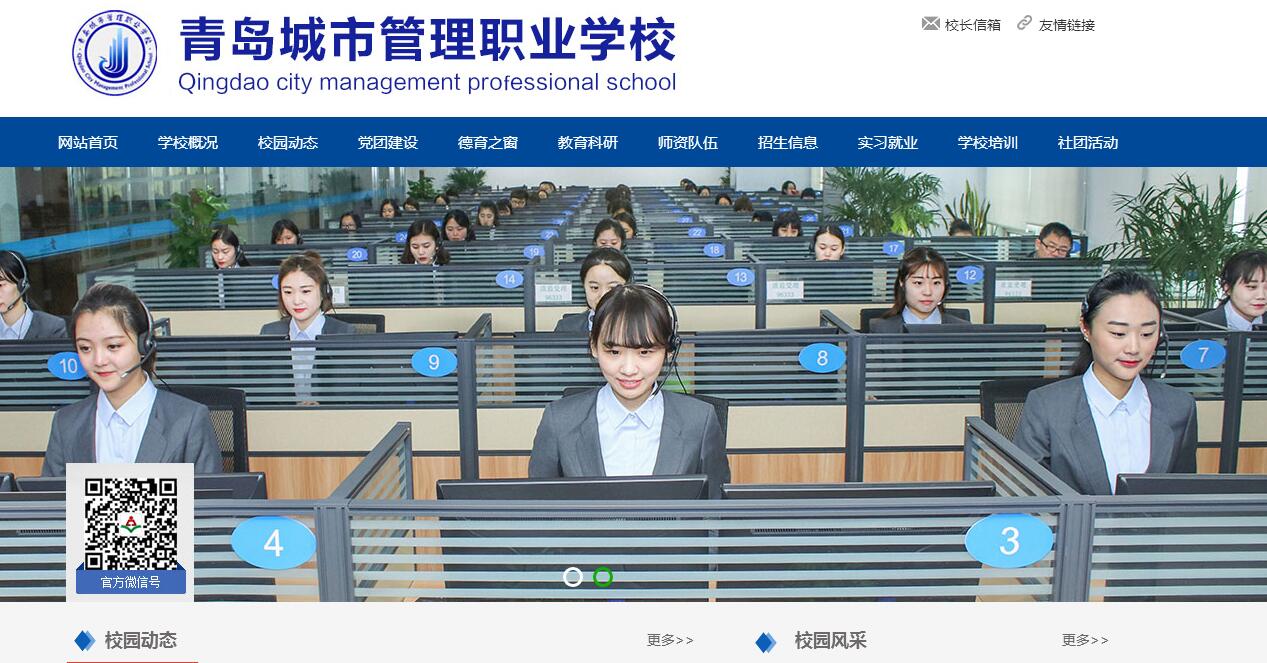 青岛城市管理职业学校座落在市北区河清路40号,是青岛市教育局所属省级重点职业中学, 先后荣获“青岛市文明单位”,青岛市廉政文化建设示范点,“青岛市德育先进单位”,“青岛市职业高中(中专)管理优秀等级学校”,“青岛市素质教育目标考核优秀等级”,“青岛市军民共建先进单位”,山东省心理健康教育先进单位,“青岛市关心下一代先进单位”等十几项荣誉称号。学校环境优美,办学条件一流,拥有一流的校园网络,24个多媒体教室,六个微机室,现代化录播教室,楼宇智能化实训室,电工电力拖动实验室,消防安全实训室,中央和市财政拨款420万元建设的家居专业校内实训基地,两个现代化呼叫中心,智能家居实训室,形体房以及配有现代化设备的图书馆及阅览室等。学校师资力量雄厚,拥有一支结构合理、素质精良的师资队伍。现有教职工97人,其中,山东省教学能手2人、青岛市优秀教师2人、 市学科带头人1人、市教学能手11人、市青年优秀专业人才19人。山东省教学能手2人、青岛市优秀教师2人、 市学科带头人1人、市教学能手11人、市青年优秀专业人才19人。学校秉承“办社会满意的职业教育、创特色鲜明的精品学校”的办学宗旨,本着“志存高远、坚韧不拔”的学校精神,遵循“崇德尚能、真诚致远”的校训,让老师快乐工作,学生幸福成长。现有在校生1000余人,设有现代家居设计、智能楼宇技术、物业管理、旅游乘务、通信运营服务五个专业,各专业均为全市独有,特色鲜明。毕业生供不应求,优质就业率高。走进城管,必定发展,这里是一座人才成长的立交桥。