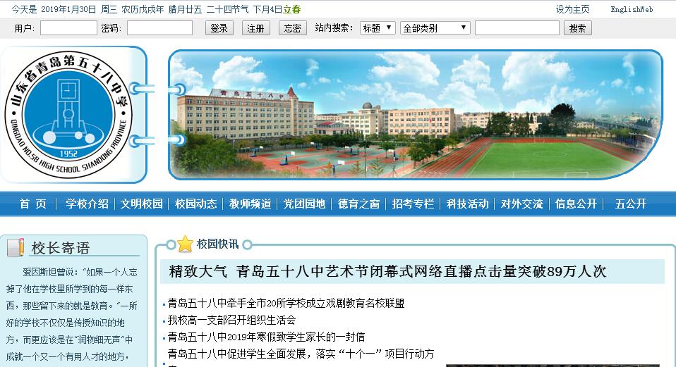 青岛五十八中建校于1952年,始为青岛五中,1969年改称崂山一中,1994年更名为青岛五十八中。六十多年来,五十八中紧跟社会发展趋势,不断创新人才培养模式,探寻教师专业发展之路,努力办好人民满意的教育,在社会需求、高考压力、家长期望和教育理想间找到了最佳结合点,打造了高素质教育与高质量教学实现双赢的成功案例,不断提高师生幸福指数,学校成为了教师舒心工作、学生开心学习、师生共同成长的精神家园。学校占地96亩,绿化面积15091平方米,建筑面积37233平方米。建有符合国家一类标准的教学楼、信息楼、实验楼、学生宿舍餐厅楼、塑胶运动场、体育馆等,拥有全国一流的图书馆、实验室、心理成长指导中心、闭路电视和校园网,先进的多媒体教学设备覆盖全部教学环境,是设施先进、环境优美的信息化、花园式学校。学校现有专职教师175人,正高级教师3人,高级教师62人,全国五一劳动奖章、全国优秀教师、国务院特殊津贴获得者、山东省劳动模范、特级教师、优秀教师、优秀教育工作者、教学能手、德育先进等22人,青岛市劳动模范、特级教师、拔尖人才、优秀教师、学科带头人、教学能手、十佳师德标兵、德育先进、青年教师优秀专业人才123人,博士、硕士研究生42人。五十八中坚持“以人为本 全面发展”的办学思想,恪守“追求卓越 报效祖国”的校训,狠抓精细化管理,围绕“责任诚信 感恩 宽容”主题,打造“尽善尽美”德育品牌,引导学生自觉树立并大力践行社会主义核心价值观,在家做个好孩子,在学校做个好学生,在社会做个好公民。积极推进新课程改革,形成了“学案导学 以学定教”的高效课堂教学模式,促进教学成绩的大面积大幅度提高,2012年以来,学校每年高考都有80%以上的学生升入北京大学、清华大学等国内重点院校,2015年超90%,2017年达到95%,连续五年出现全部达省一本线班级,培养出了2017年省文科状元。扎实做好卓越人才培养的奠基教育,为学生的全面进步、终身发展搭建优质平台,凸现了“让每个学生的潜质得到最大程度发挥”的办学优势。学校不断拓宽国际视野,紧跟世界发展潮流。先后与德国、英国、美国、澳大利亚、加拿大、新加坡等国高中名校建立姊妹学校关系,定期进行游学等教育交流活动。2015年,正式成立国际部,北美国际课程班开班。学校荣获全国文明单位、全国文明校园、全国教育系统先进集体、全国中小学德育工作先进集体、全国中小学平安和谐校园先进单位、全国青少年文明礼仪教育示范基地、教育部奥林匹克教育示范学校、全国优秀家长学校实验基地、山东省富民兴鲁劳动奖状、山东省先进基层党组织、山东省教学示范学校、山东省依法治校示范学校、山东省职业道德建设先进单位、山东省民主管理先进单位、山东省心理健康教育示范学校、山东省优秀家长学校、山东省花园式单位、青岛市教育改革十面红旗等荣誉称号。乘风破浪会有时,直挂云帆济沧海。今天的五十八中人正以昂扬的姿态阔步前行,吸取历史精华,驾驭时代风帆,坚持“过程追求精细 结果追求完美”的管理理念和“创新发展 提升引领”的工作思路,做到“求真务实 卓越高效”,内强素质,外树形像,全面提升学校品牌竞争力,办好人民满意的教育,创建全国一流名校!