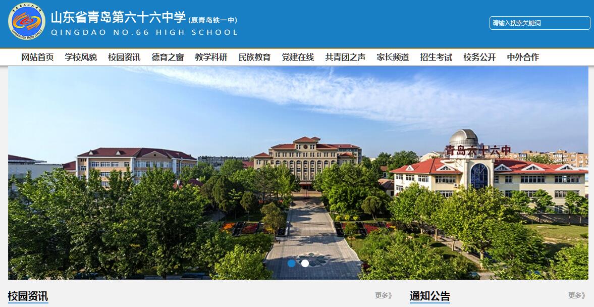 青岛六十六中原名青岛铁一中,创建于1925年,2002年12月移交青岛市教育局管理,2003年7月更名为山东省青岛第六十六中学。学校在九十三年的办学历程中积淀了深厚的文化底蕴,先后被评为山东省规范化学校、全国体育先进单位、山东省艺术教育示范学校、山东省电化教学示范学校、山东省体育传统项目学校、全国足球特色学校、青岛市中小学德育工作先进集体、山东省教育援藏援疆先进单位、山东省民族团结进步创建示范单位等。近年来,学校秉持“让每一位学生实现心中的梦想”办学理念,以教师发展为关键,以学生发展为根本,全面提升教育教学质量,实现学校跨越式发展。自2005年开始,学校承办新疆内高班办班任务,民族团结教育成效显著;2015年起招收俄语班,与莫斯科国立大学等俄罗斯大学合作,践行教育“一带一路”行动;2016年招收综合育人班,创新人才培养模式。学校坚持多元开放办学思路,开设美术、艺术、啦啦操、音乐编导、播音主持、体育项目等课程供学生选择,多样化特色办学全面开花结果;坚持优质师资队伍的打造,逐渐形成一支年富力强、敬业乐教、爱生奉献的教师队伍。青岛六十六中正全力以赴,为学生的全面发展搭建最好的平台,让志存高远的莘莘学子在这里实现绚丽的人生梦想!