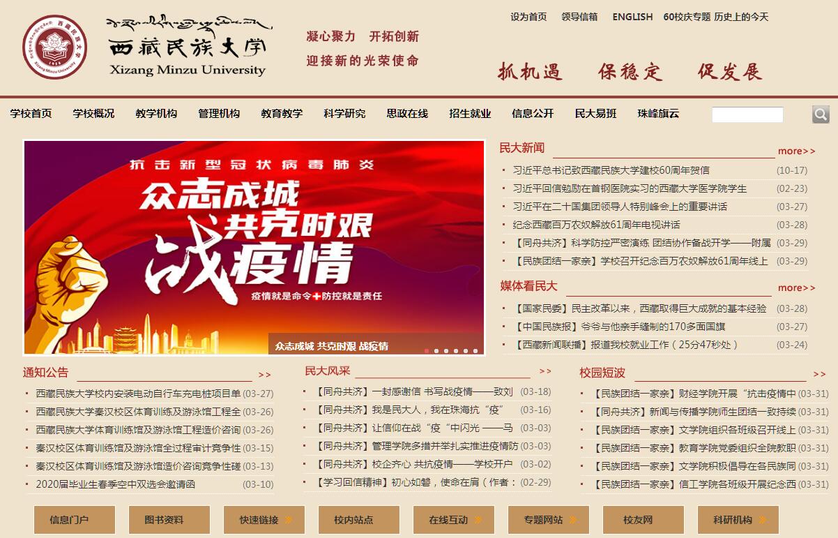西藏民族大学坐落在渭水之滨古都咸阳,其前身是1957年中央指示创办、1958年9月开学的“西藏公学”。1965年4月30日,经国务院批准更名为“西藏民族学院”。2015年4月28日,经国家教育部批准更名为“西藏民族大学”。学校是国务院批准的首批具有学士学位授予权单位,是西藏自治区人民政府与国家民族宗教事务委员会共建高校、国家中西部地区重点建设高校、全国民族团结进步教育基地、教育部卓越人才培养计划试点单位、教育部团队式对口援助高校、西藏自治区博士授权立项建设单位,全国第二批深化创新创业教育改革示范高校、教育部第一批教育信息化优秀试点单位、全国绿化模范单位、自治区文明校园创建单位、全区易班建设和发展中心试点高校。学校诞生于特殊的历史时期,是西藏和平解放后党中央在祖国内地为西藏创办的第一所高等学校,是老一辈党和国家领导人基于民族团结和国家振兴的政治远见做出的英明决策,是中央治藏方略的重要布局。毛泽东、周恩来、邓小平等都对学校的筹建、建设做出过具体指示。改革开放后,邓小平、江泽民、胡锦涛等中央领导同志对学校的发展十分关心,胡锦涛同志、刘延东同志为学校建校50周年发来贺信。党的十八大以来,习近平总书记、俞正声主席等中央领导多次做出重要指示,要求进一步办好民族高等教育。2014年,中共中央书记处书记、全国政协副主席杜青林受俞正声主席委托,到学校看望慰问师生,希望学校认真总结在内地为西藏培养人才的有效模式和成功经验,积极探索新形势下民族教育的规律,为国家、为西藏培养更多的人才,做出更大的贡献。学校肩负着特殊的历史使命,始终致力于全面落实党和国家治藏方略,维护祖国统一、民族团结,反对分裂;始终致力于西藏经济发展、社会进步和长治久安;始终致力于为西藏造就一支立场坚定、经得起各种风浪考验的高素质干部队伍。在长期办学中,认真贯彻党的教育方针和民族政策,坚持立足陕西、面向西藏、服务西藏的办学宗旨,从建校之初的干部培训、知识教育到现在的专业教育,再到不断提升办学层次,创造了西藏高等教育的诸多奇迹,是西藏高等教育的孵化器、专业人才的培养基地、科学研究和文化传承创新的重要平台,在我国民族高等教育和西藏高等教育史上确立了自己独特的历史地位。学校做出了特殊的历史贡献,在西藏平定叛乱、政权建设、民主改革和社会主义建设等不同历史阶段都发挥了不可替代的独特作用,为西藏经济发展和社会进步做出了历史性的重要贡献。学校紧紧围绕培养合格建设者和可靠接班人的根本任务,紧跟时代步伐,形成了适应西藏实际和需要的人才培养模式,构建了与西藏经济社会发展高度契合的学科专业体系,凝练了服务西藏经济社会发展的科学研究优势,有着鲜明的办学特色。建校近60年来,学校秉承“爱国、兴藏、笃学、敬业”的校训,弘扬“担当奉献、求真务实、和谐发展”的办学精神,为国家培养了8万余名各类优秀人才,其中涌现出了30多名省部级领导干部和一大批艺术家、作家、教授、医学家、农学家、工程师等杰出人才,赢得了“西藏干部摇篮”的美誉。毕业生深受用人单位的好评,近三年毕业生就业率均在90%以上,先后荣获“高校毕业生就业工作先进集体”和“全国高校就业工作典型院校”等荣誉称号。学校是全国成立最早的民族高校之一,具有浓郁的西藏地方民族特色,也积淀了深厚的办学实力。现有文学院、民族研究院、法学院、新闻传播学院、马克思主义学院、财经学院、管理学院、信息工程学院、教育学院、外语学院、体育学院、医学部、研究生院、继续教育学院等14个教学单位。有11个硕士一级学科,10个硕士专业学位授权点,51个本科专业,涵盖11个学科门类。其中国家特色专业建设点2个,国家级专业综合改革试点项目1个,省部级重点学科11个,国家民委重点建设学科1个,自治区级特色专业4个,自治区级专业综合改革试点项目3个。学校现有教职工1255名(其中校本部996人),教职工中有专业技术人员820名,其中专任教师684名。专技人员中有正高级专业技术人员80名,副高级专业技术人员241名,博士、硕士生导师95人,具有研究生学位的教师占教师总数的74%,有百千万工程国家级人选2人,享受国家特殊津贴专家11人,教育部新世纪优秀人才支持计划2人,教育部高校教学指导委员会委员8人,西藏自治区学术技术带头人18人,享受西藏自治区政府特殊津贴专家6人。建设有国家级教学团队1个,省部级教学团队3个。在校生9926人,其中研究生514人,藏族和其他少数民族学生占53%。牵头组建了自治区级协同创新中心“西藏文化传承发展协同创新中心”,成立了西藏哲学社会科学重点研究基地、南亚研究所、旅游研究所、藏学研究所等科研实体。致力于西藏经济社会发展的需要,推进学科建设、人才培养、科学研究的同步提升。学校在许多研究领域处于国内领先地位,藏学、民族学研究在国内外学术界享有良好声誉。学校地处祖国内地,在党中央的亲切关怀下和全国人民的大力支持下,具备了良好的办学条件。现有渭城、秦汉两个校区,并在拉萨建有实践教学基地,校园面积1149亩(76.6万平方米),校舍总面积334973平方米。教学设施完备,现有智慧教室等各类功能教室120间,建筑面积77493平方米;各类实验室、实习