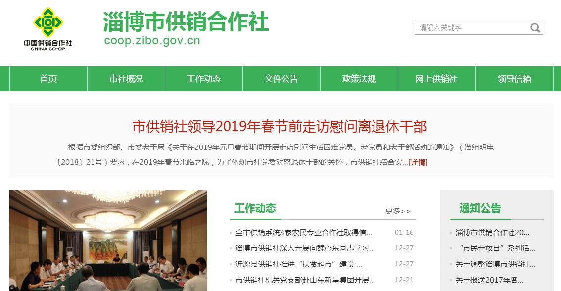 淄博市供销合作社主要职责:(一)贯彻执行国家、省市关于供销合作社工作的方针、政策;研究制订全市供销合作社发展规划和年度计划,并组织实施;指导全市供销合作社的发展和改革。(二)按照政府授权和职责分工,对烟花爆竹、再生资源等重要商品和重要农业生产资料、农产品的经营活动进行组织、协调和管理。(三)负责构建农村现代经营服务新体系,推进全市供销合作社城乡现代流通网络体系、农业社会化服务体系、新型城乡社区经营服务体系和农村合作金融服务体系建设。(四)构建新时期供销合作社组织体系,加强基层组织建设,发展社有企业,推进联合与合作;引导发展农民专业合作社及联合社,完善行业协会服务,建设农村合作经济服务体系,搭建为农服务综合平台。(五)依法管理运营本级社有资产,对出资企业行使出资人职责,监督社有资产保值增值;依法维护全市各级供销合作社的合法权益。(六)协调与政府有关部门、社会组织的关系,指导全市供销合作社开展经济业务活动,促进城乡物资交流;利用供销合作社教育培训资源,组织开展从业人员教育培训和农民专业合作社带头人、农产品经济人、农民技能培训。(七)组织协调本系统科技、质量、安全生产、统筹统保工作;组织指导本系统的对外合作与交流,发展进出口业务;反映农民社员的意见与诉求,开展社情民意调查,维护其合法权益。(八)组织指导本系统的组织建设和人才队伍建设;负责所属单位党的建设、群团组织建设等工作。(九)承办市委、市政府交办的其他事项。